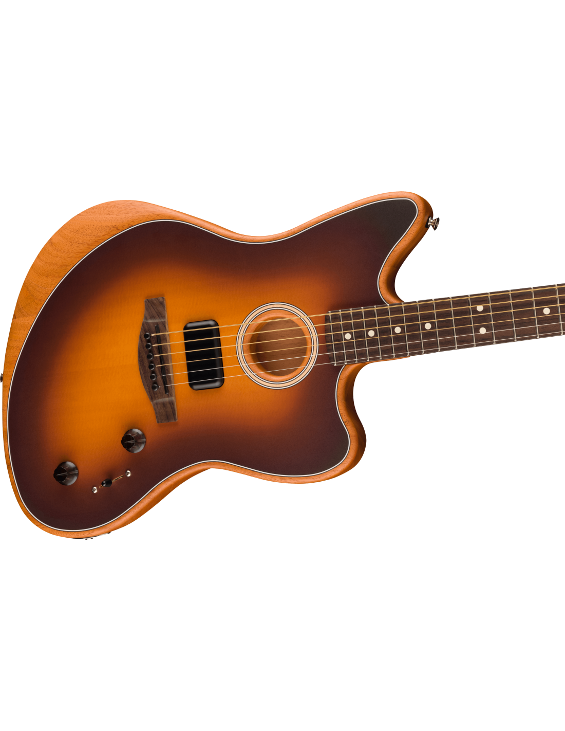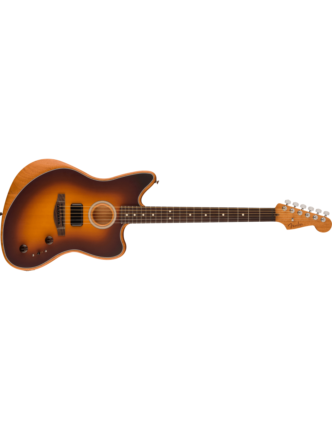 FENDER ACOUSTASONIC PLAYER JAZZMASTER 2TS LTD est une guitare hybride électrique/acoustique, modèle Acoustasonic Player Jazzmaster Édition Limitée, avec corps, fond et éclisses en acajou, table en épicéa Sitka, finition Polyester Satin Matte, manche en acajou à profil Modern Deep "C", touche en palissandre à rayon 12" avec 22 frettes Narrow Tall et incrustations White Dots, Truss Rod Bi-Flex, sillet en Graph Tech TUSQ, matériel chromé, mécaniques Fender Standard Cast/Sealed Staggered avec abaissacorde Single-Wing et pont Modern Asymmetrical. L'électronique avec technologie Stringed Instrument Resonance System (SIRS) fonctionnant avec une batterie de 9V, consiste en 1 micro externe Acoustasonic Shawbucker Magnetic, et un micro Piezo Fishman sous-selle avec contrôles Master Volume, contrôle Blend et sélecteur de micro à 3 voies permettant la sélection de 6 timbres acoustiques et électriques. Inclut Deluxe 1225 Gig Bag