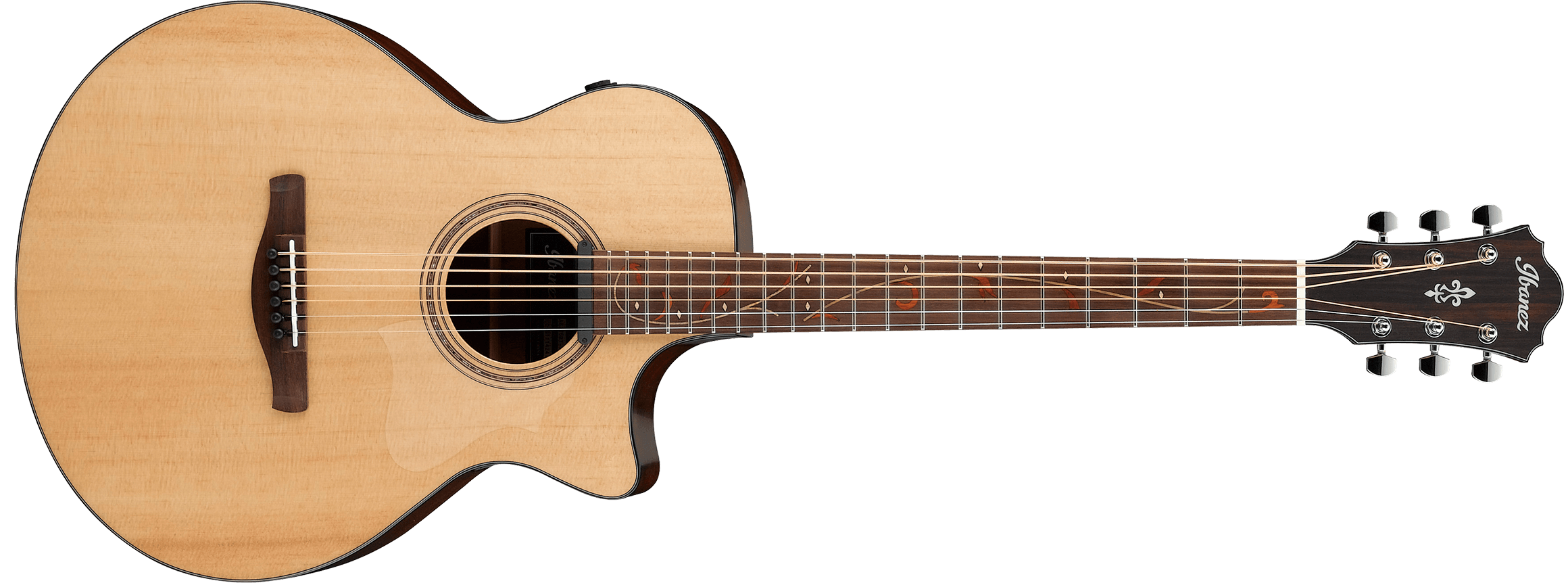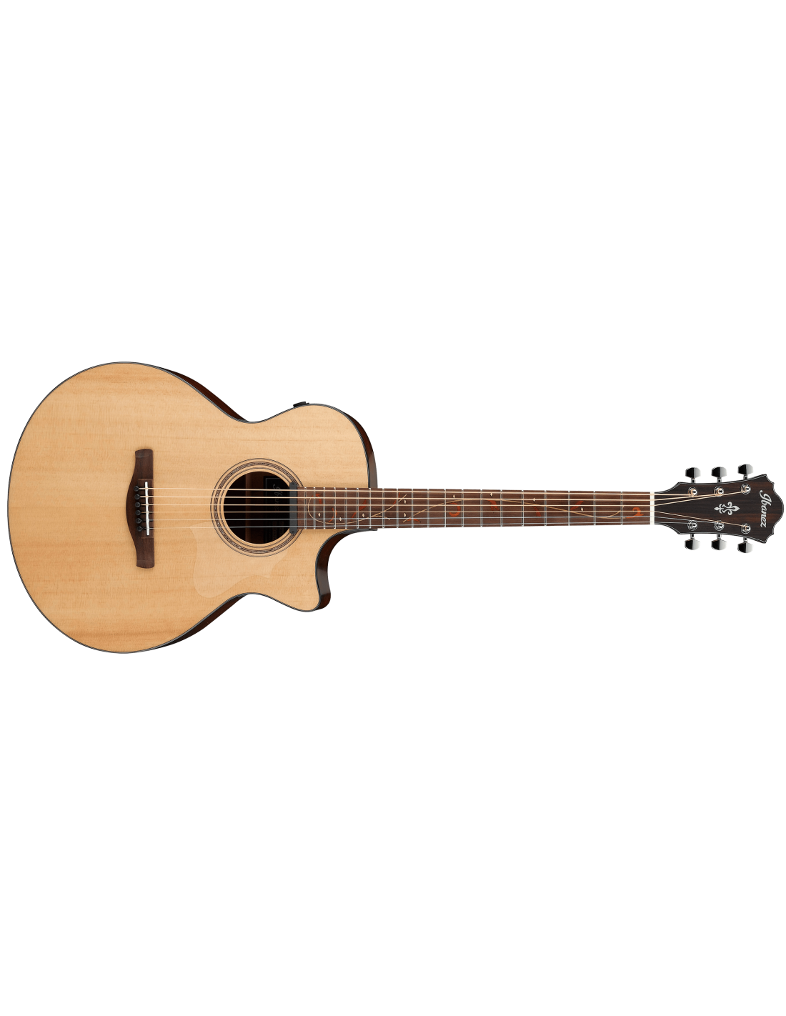 IBANEZ AE275BT-LGS NATURAL GLOSS est une guitare acoustique électrifiée, série Ibanez AE, avec un dessus en épicéa Sitka massif, un fond et des éclisses en Okoumé, un renfort X-M Bracing, un manche en Nyatoh au profil Confort Grip avec des bords de touche arrondis, une touche à rayon 16" en Pau Ferro avec 20 frettes Jumbo et des incrustations en bois de vigne, un sillet de 45 mm en os, un matériel nickelé, des mécaniques en métal coulé chrome (rapport de démultiplication 18:1) et un pont en Pau Ferro avec une selle en os compensé. L'électronique se compose d'un micro magnétique de caisse Ibanez AP11 avec un préamplificateur Ibanez Custom Electronics avec des contrôles de volume et de tonalité.