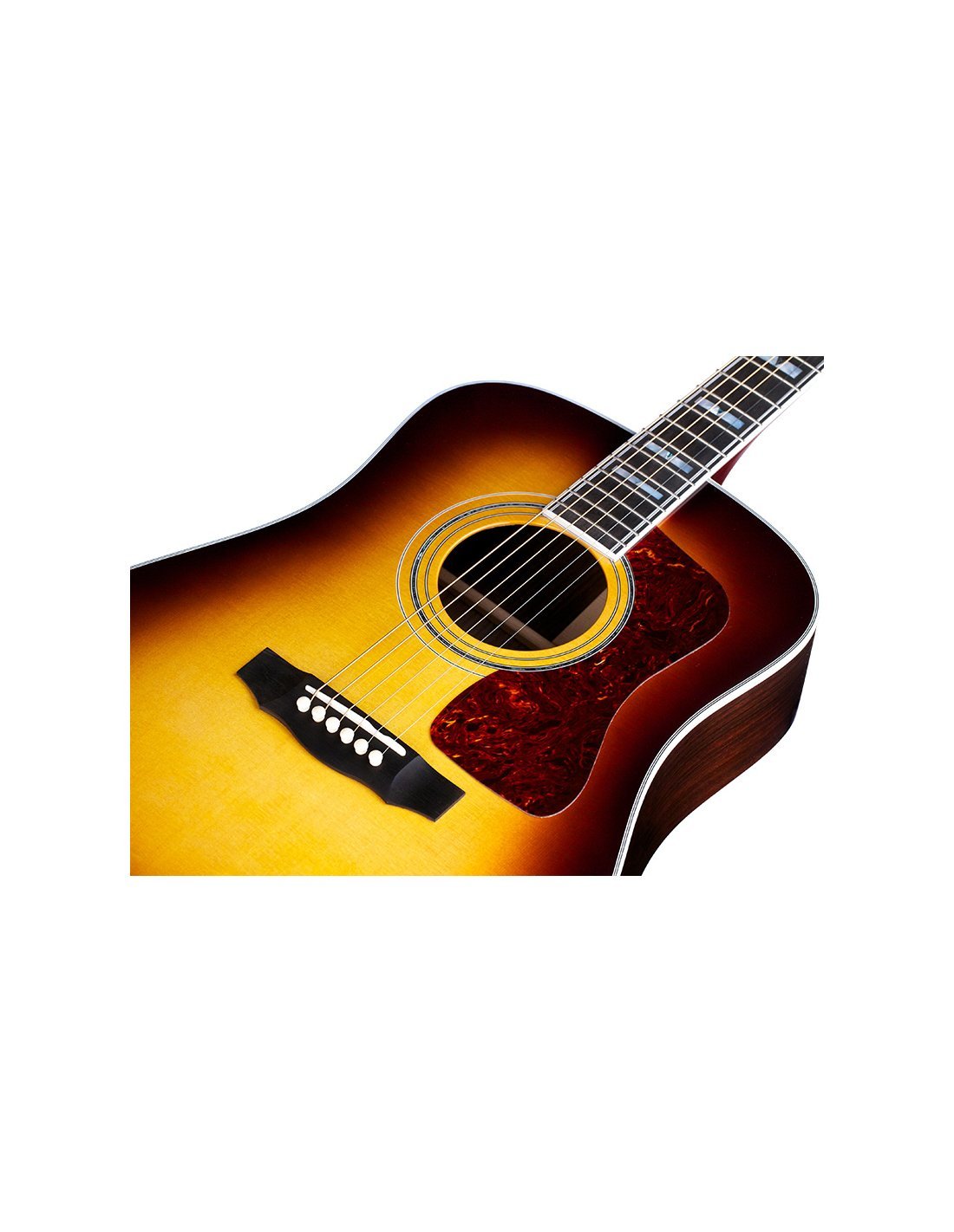 Introduite pour la première fois en 1968 en tant que commande spéciale haut de gamme, la D-55E ATB a été tellement appréciée qu'elle a incité Guild à l'introduire dans la production régulière dès 1974. Notamment utilisée par Tommy Smothers dans ses spectacles dans les années 1960, la D-55 est restée durable et populaire, devenant la préférée d'artistes comme Waylon Jennings, Billie Joe Armstrong et David Nail. Rétrointroduite en 2017, la Guild D-55 est revenue améliorée et actuelle. La D-55 reste fidèle dans ses équipements à son ancêtre de 1968, incluant une table en épicéa Sitka, un dos et des éclisses en palissandre indien massif, un manche et un chevalet en ébène, et une finition en nitrocellulose brillante Antique Sunburst. Les finitions internes prévoient une barrure Adirondack ainsi qu'un joint de manche à queue d'aronde révisé et corrigé pour rendre cette génération de D-55 la plus légère, puissante et jouable de tous les temps. La D-55 présente la tête Guild la plus reconnaissable et arbore le "Pic et Bouclier" Guild en combinaison d'incrustations sur ébène figuré. La touche en ébène est entièrement bordée et fournie d'incrustations iconiques "V-Blocks" et "railroad track" multi-lignes, l'échelle mesure 651 mm et le sillet a une largeur de 43 mm. La touche de la D-55 est montée sur un manche en acajou avec un magnifique renfort en noyer qui court sur toute la longueur jusqu'à la tête. La finition nitro de la D-55 est disponible en Antique Burst et est appliquée par pulvérisation, pour un minimum d'épaisseur et une résonance maximale. Chaque guitare inclut un certificat d'authenticité signé et un étui rigide en bois Guild avec un système d'humidification Humicase®. Le système d'amplification est L.R. Baggs.