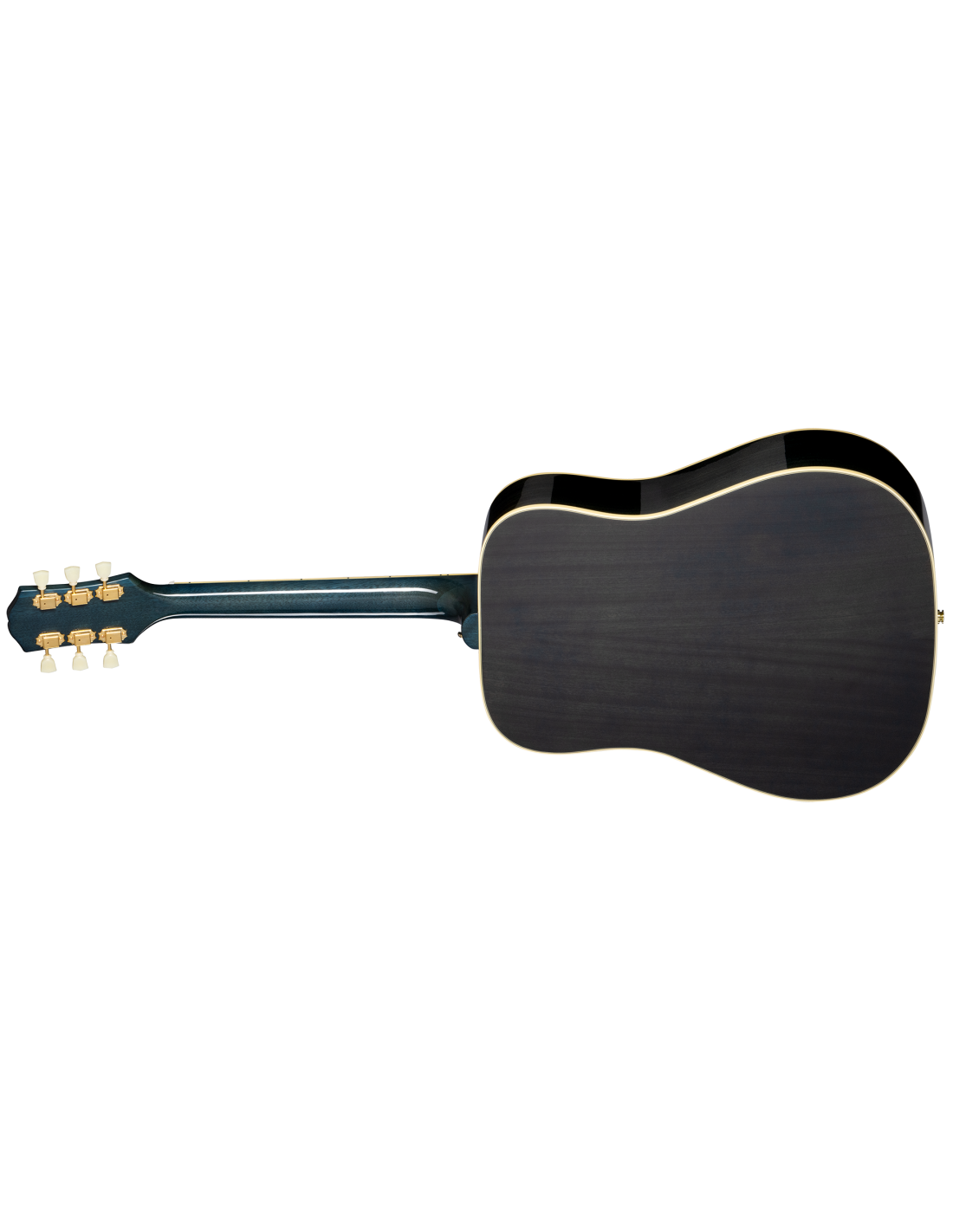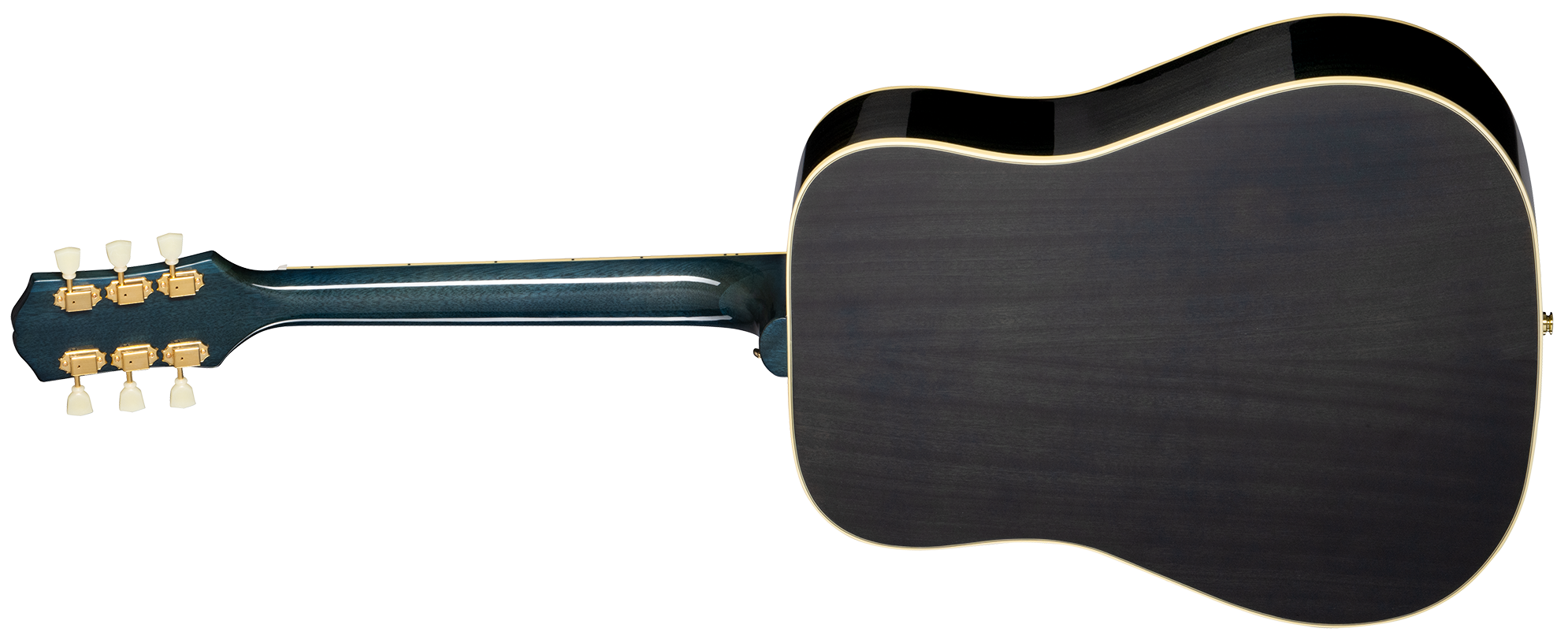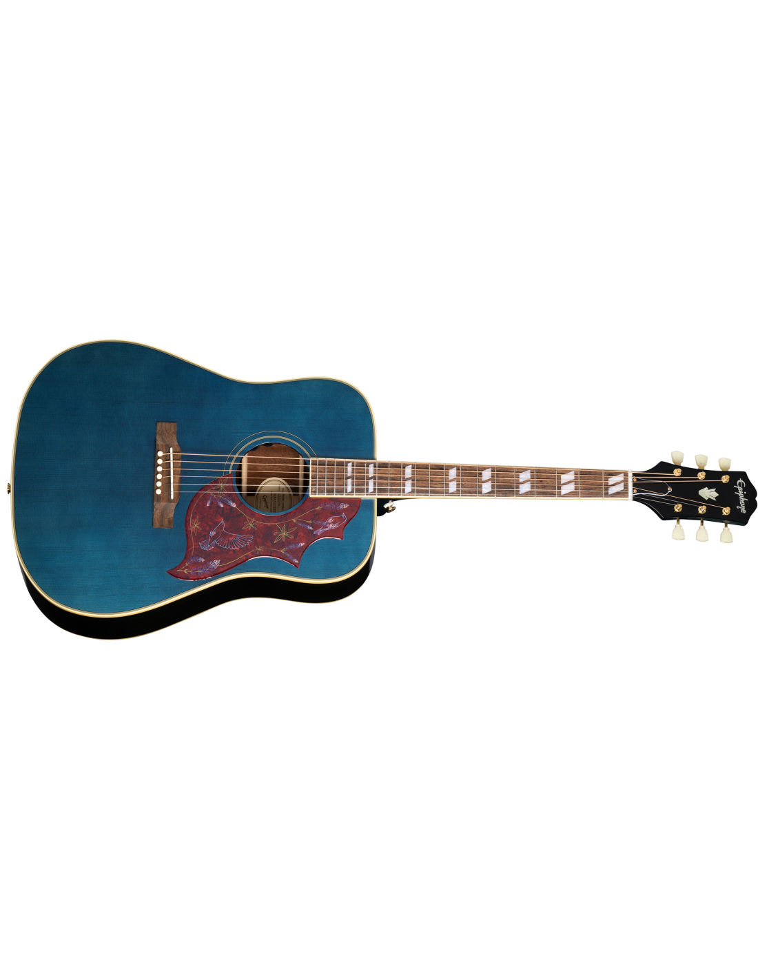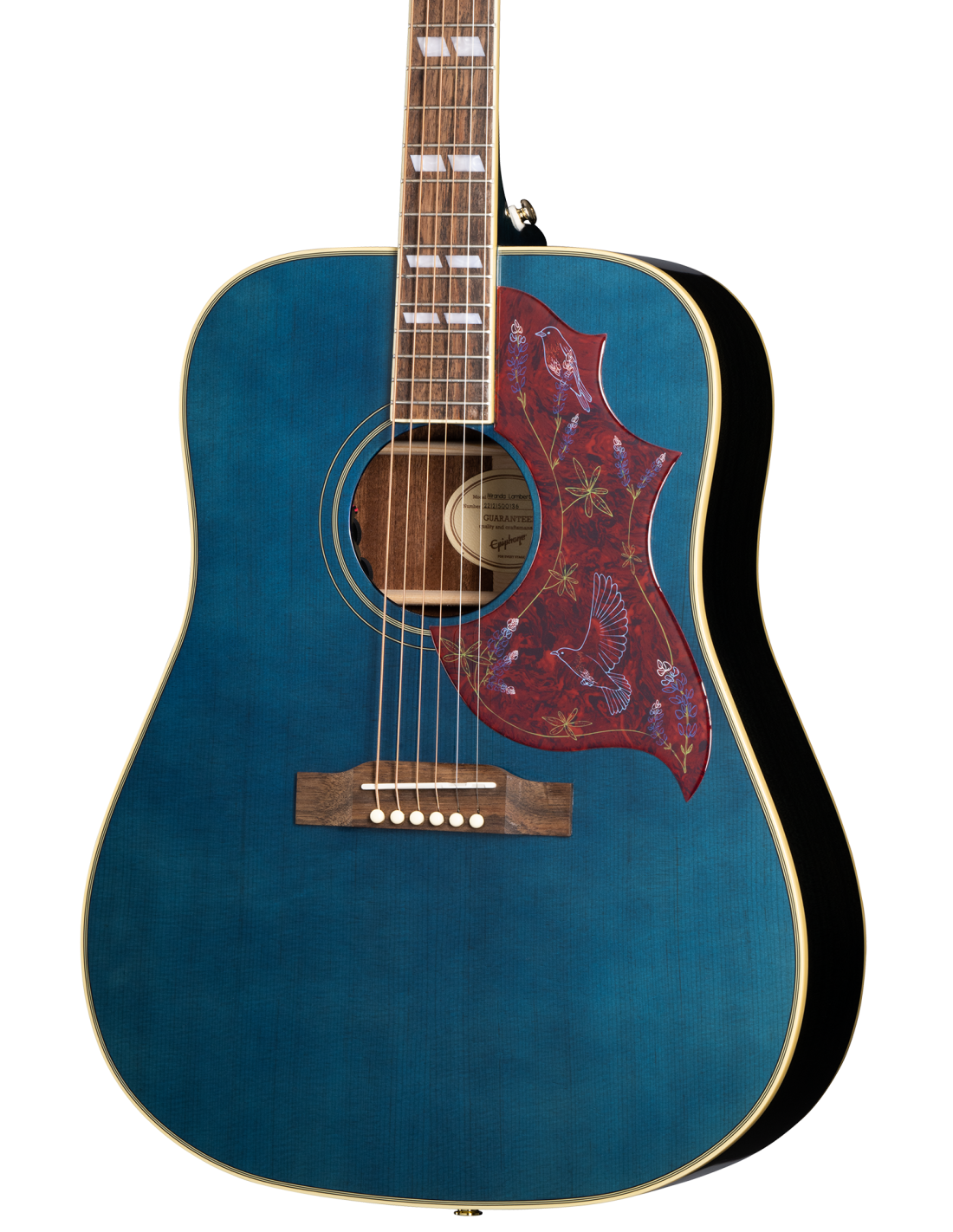 EPIPHONE MIRANDA LAMBERT BLUEBIRD BONNET BLEU AVEC COQUE est une guitare acoustique électrifiée au format Hummingbird à épaule carrée, modèle Epiphone Signature Miranda Lambert Bluebird Studio, avec un fond et des éclisses en acajou multicouche et un dessus en épicéa Sitka massif, un manche en acajou au profil Rounded "C", un touche en laurier indien à rayon 12" avec 20 frettes Standard et des incrustations en Perloid Parallélogramme, un sillet en plastique de 43 mm, un matériel doré, des mécaniques Epiphone Deluxe et un pont Reverse Belly en laurier avec une selle en plastique compensé. L'électronique se compose d'un préamplificateur intégré Fishman Presys VT, avec un micro piezo sous la selle Fishman S-Core et des contrôles de Volume et de Ton à la rosace. Inclut une coque Epiphone Hardshell