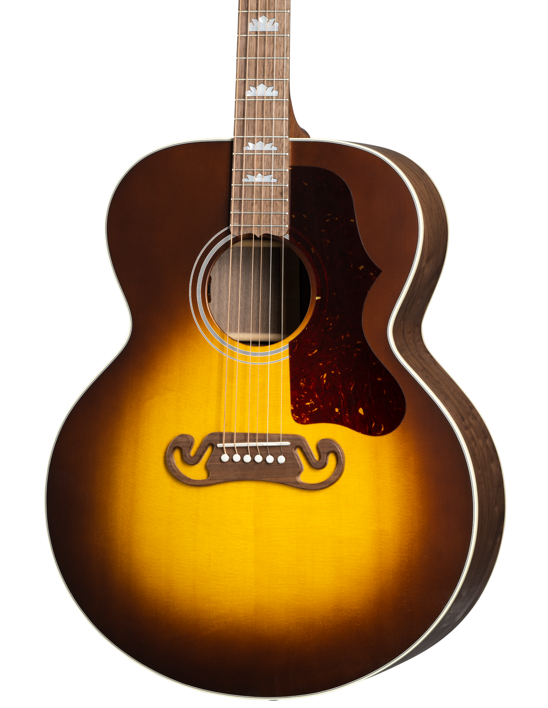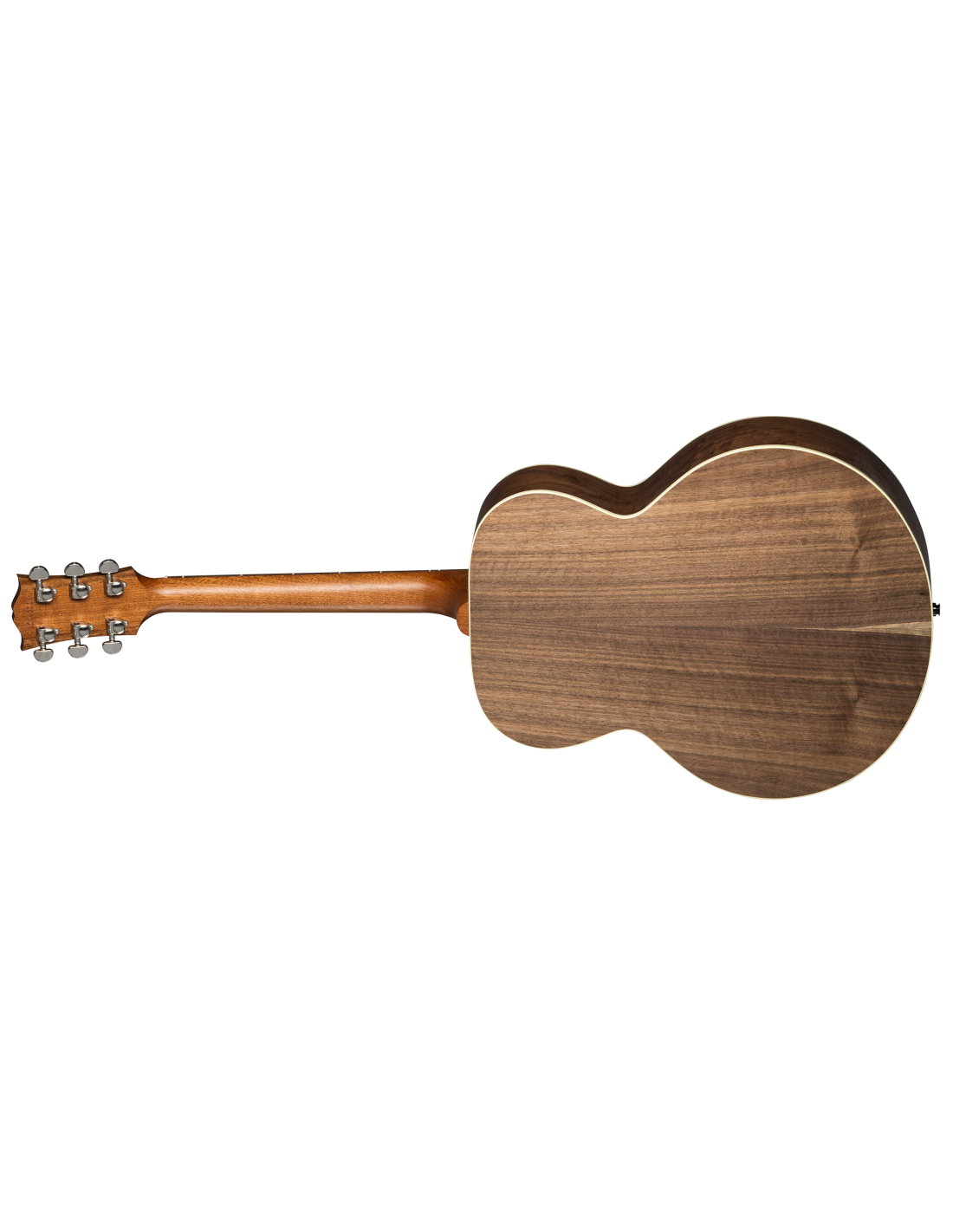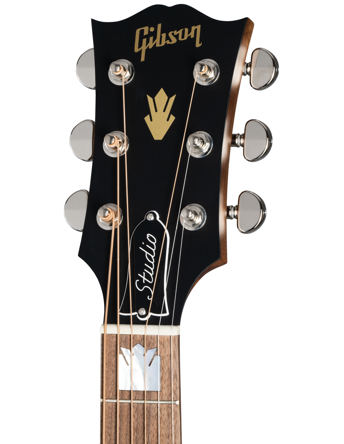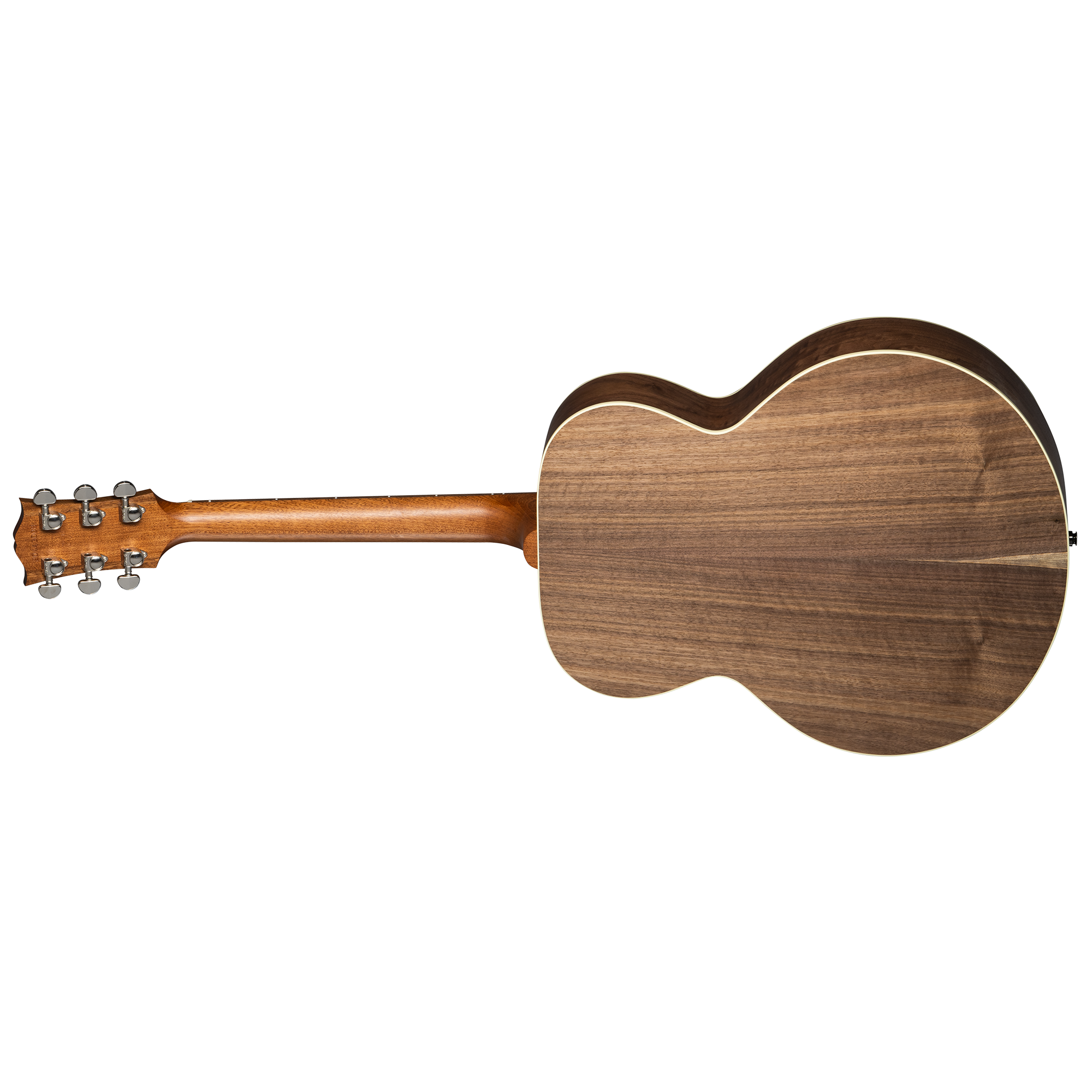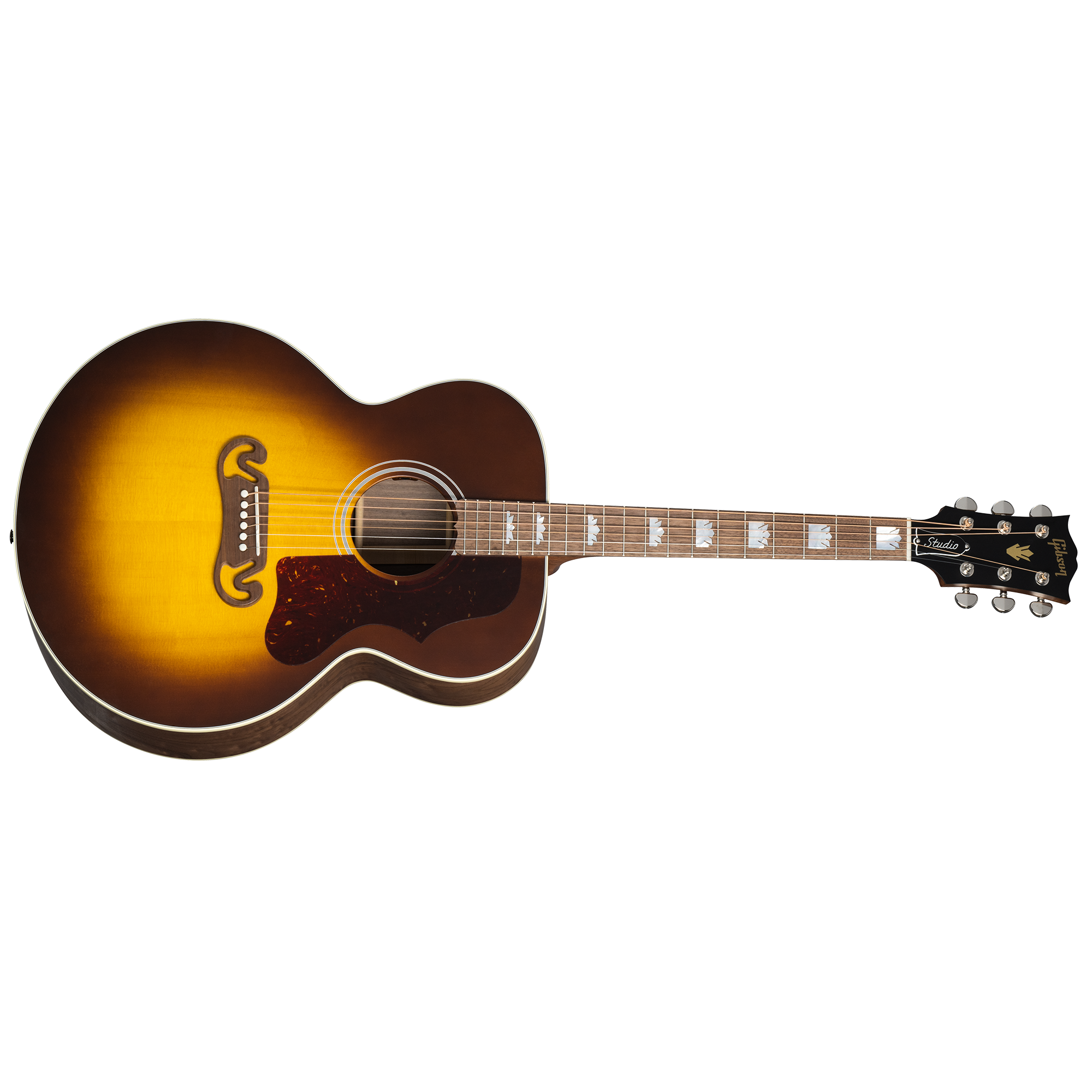 GIBSON SJ-200 STUDIO WALNUT est une guitare acoustique électrifiée de format Super Jumbo, modèle SJ-200 Studio, avec fond et éclisses en Noyer, table en Épicéa Sitka massif, manche "Utile" à profil Advanced Response, touche en Noyer à rayon 16" avec 20 frettes Standard et incrustations en nacre Couronne Graduée, sillet de 43mm en GraphTech, mécaniques Grover Rotomatic et chevalet Moustache en Noyer avec selle en Tusq. L'électronique consiste en un préampli L.R. Baggs Element Bronze avec micro piezo sous-selle et contrôle Master Volume situé sur la rosace. Inclus Gibson Modern Hardshell Case