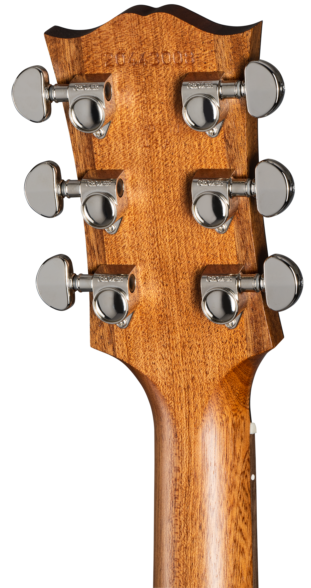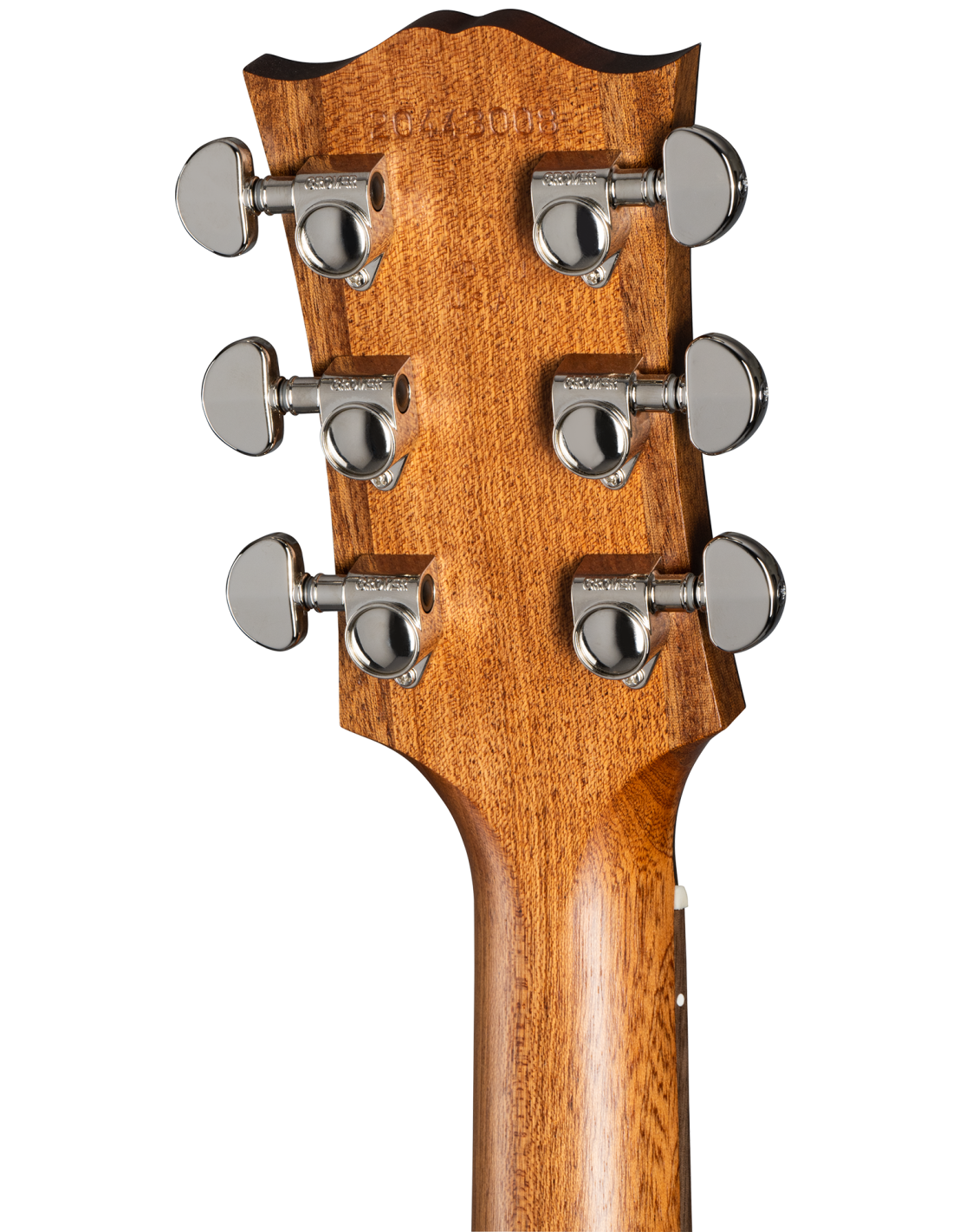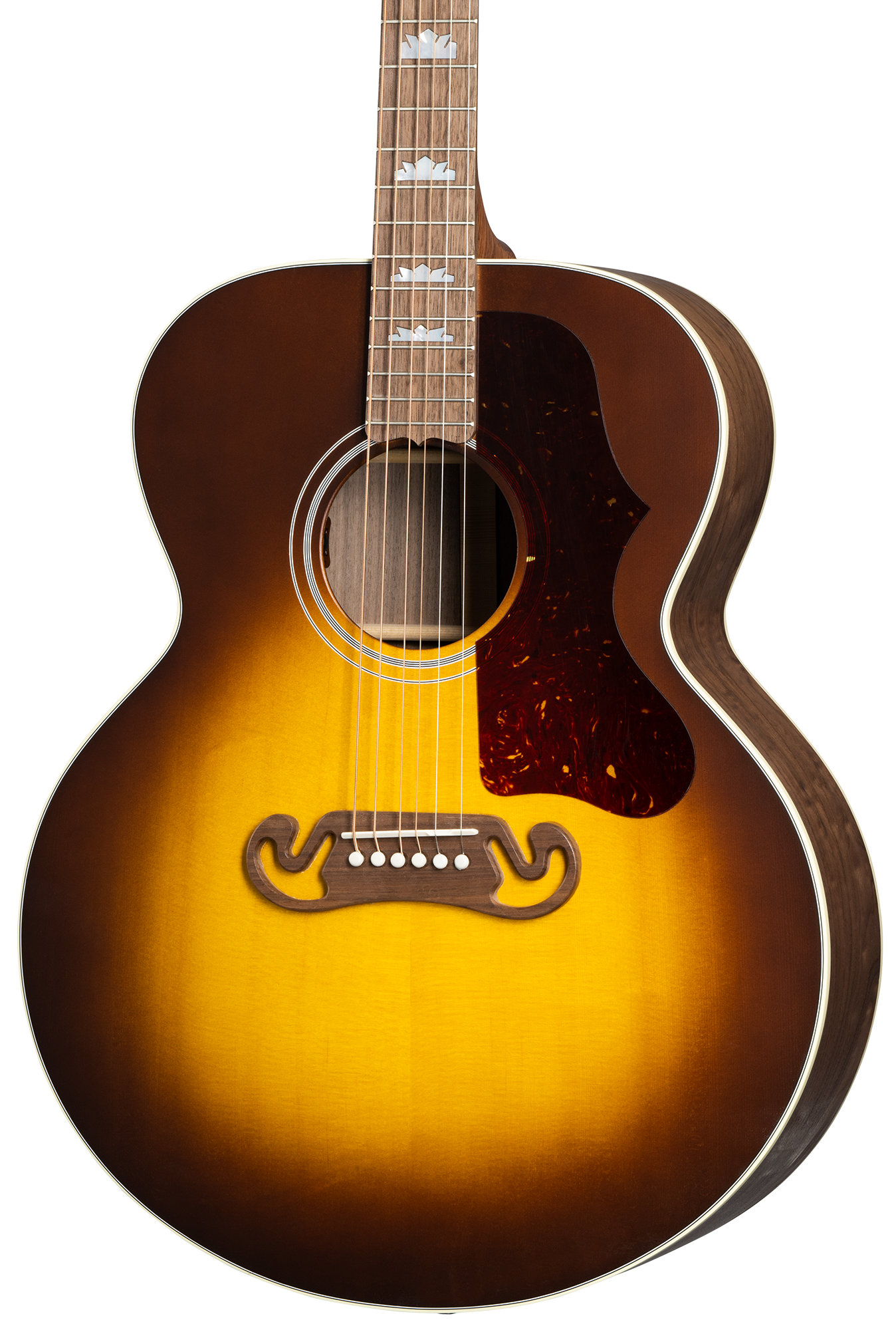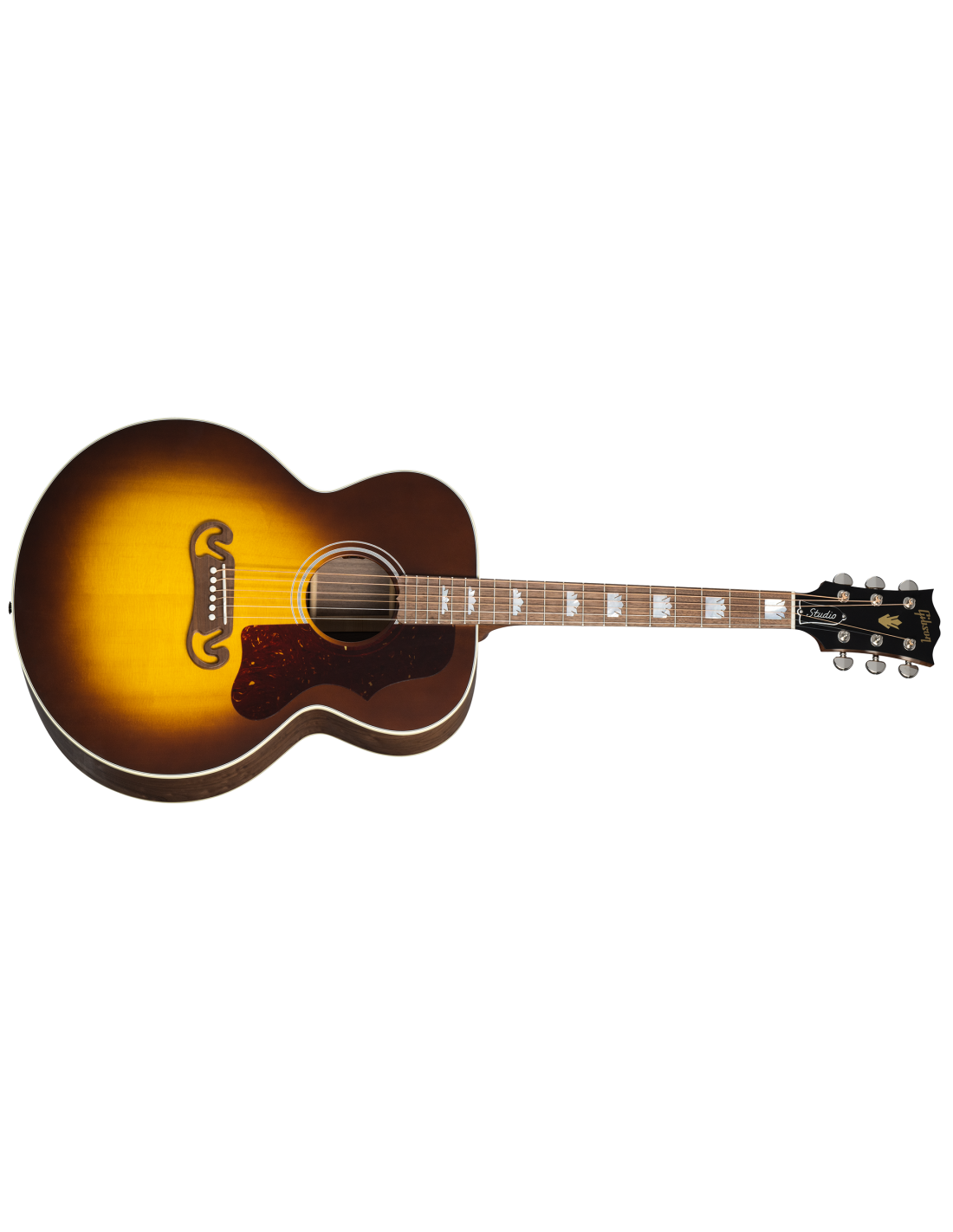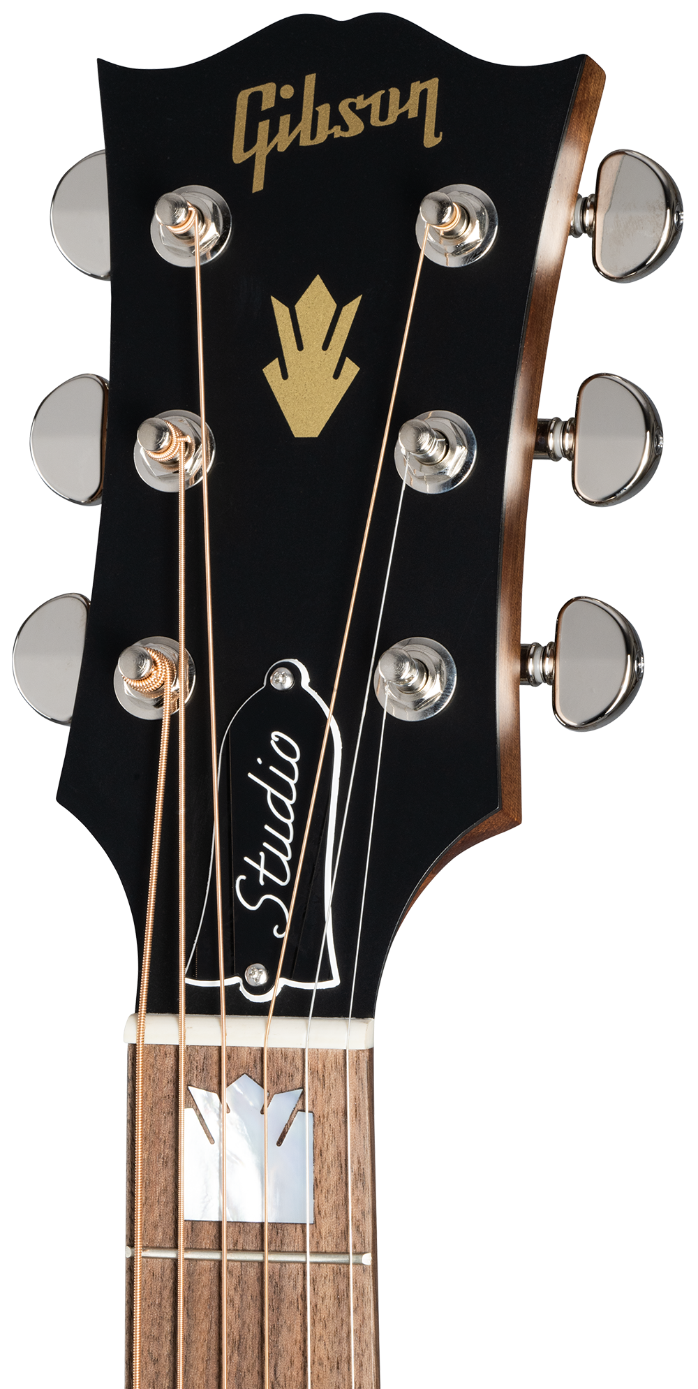 GIBSON SJ-200 STUDIO WALNUT est une guitare acoustique électrifiée de format Super Jumbo, modèle SJ-200 Studio, avec fond et éclisses en Noyer, table en Épicéa Sitka massif, manche "Utile" à profil Advanced Response, touche en Noyer à rayon 16" avec 20 frettes Standard et incrustations en nacre Couronne Graduée, sillet de 43mm en GraphTech, mécaniques Grover Rotomatic et chevalet Moustache en Noyer avec selle en Tusq. L'électronique consiste en un préampli L.R. Baggs Element Bronze avec micro piezo sous-selle et contrôle Master Volume situé sur la rosace. Inclus Gibson Modern Hardshell Case