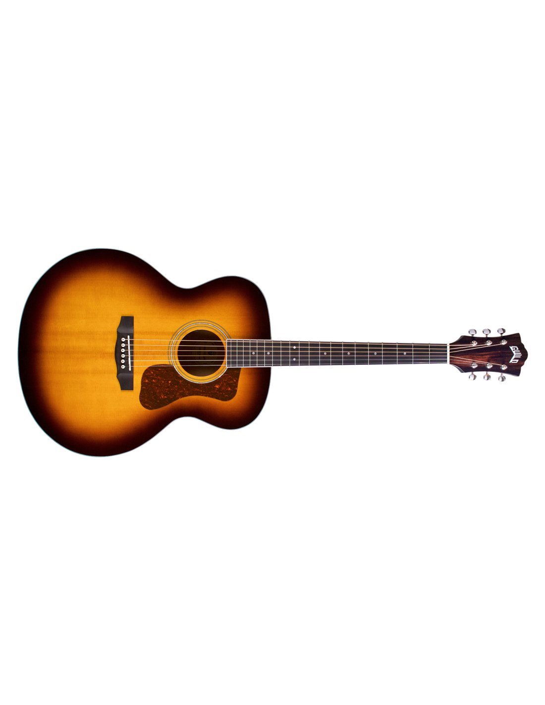 La série F représente l'histoire de Guild et l'histoire de la musique liée aux grands interprètes du siècle dernier, la nouvelle F-250E Deluxe est une guitare Jumbo avec une table en épicéa Sitka rouge massif et un magnifique fond arqué en érable flammé, des éclisses en érable, un manche et un chevalet en Pau Ferro, un manche en acajou profil C avec finition satinée et une échelle de 648 mm, le sillet en os comme pour le barré de 43 mm, la rosace est en nacre. Les mécaniques Butterbean sont ouvertes dans un parfait style vintage avec un rapport de 18:1. Le son de la F-250 est riche en harmoniques, pétillant et adapté au strumming (grâce à l'utilisation de l'érable), le sustain est généreux, la finition polyuréthane (Antique Burst) met en valeur les veines de l'érable flammé de l'instrument. Le micro Fishman Sonitone GT-1 avec contrôle de volume et de tonalité complète l'équipement et la rend excellente même pour des performances live.