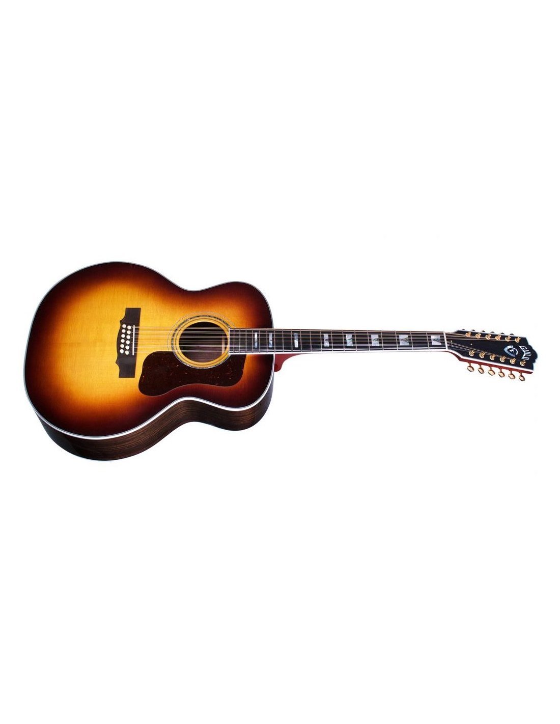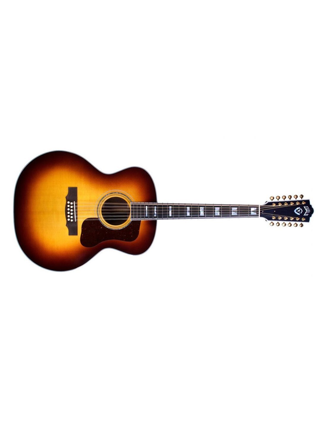 'Notoriquement utilisée par Tom Petty, David Gilmour et Stevie Ray Vaughan, la F-512 ATB a défini le son de la guitare 12 cordes dans les années 60, ces guitares iconiques continuent d'être les favorites parmi les 12 cordes actuellement disponibles sur le marché. La F-512 ATB fabriquée aux États-Unis, réalisée en Californie du Sud, poursuit cette tradition avec une table en épicéa rouge AAA Sitka massif, le fond et les éclisses sont en palissandre indien massif. L'ossature est en épicéa Adirondack accordée à la main, le manche avec profil C a un renfort central en noyer, l'échelle de la guitare est de 651 mm, le sillet (48 mm) et le barré sont en os. Ce modèle produit des aigus brillants, des médiums définis et une réponse dans les basses chaude et pleine qui la rend unique et reconnaissable. La touche en ébène comme le chevalet est décorée avec les classiques inlays Guild MOP V-block, les mécaniques sont les Gotoh SE701 dorées. Vous aurez l'impression de porter un morceau d'histoire avec votre F-512, ATB la finition est en nitrocellulose brillante Antique Sunburst, la guitare est fournie avec un étui rigide en bois Guild avec un système d'humidification Humicase®. Le système d'amplification est L.R. Baggs Anthem.'