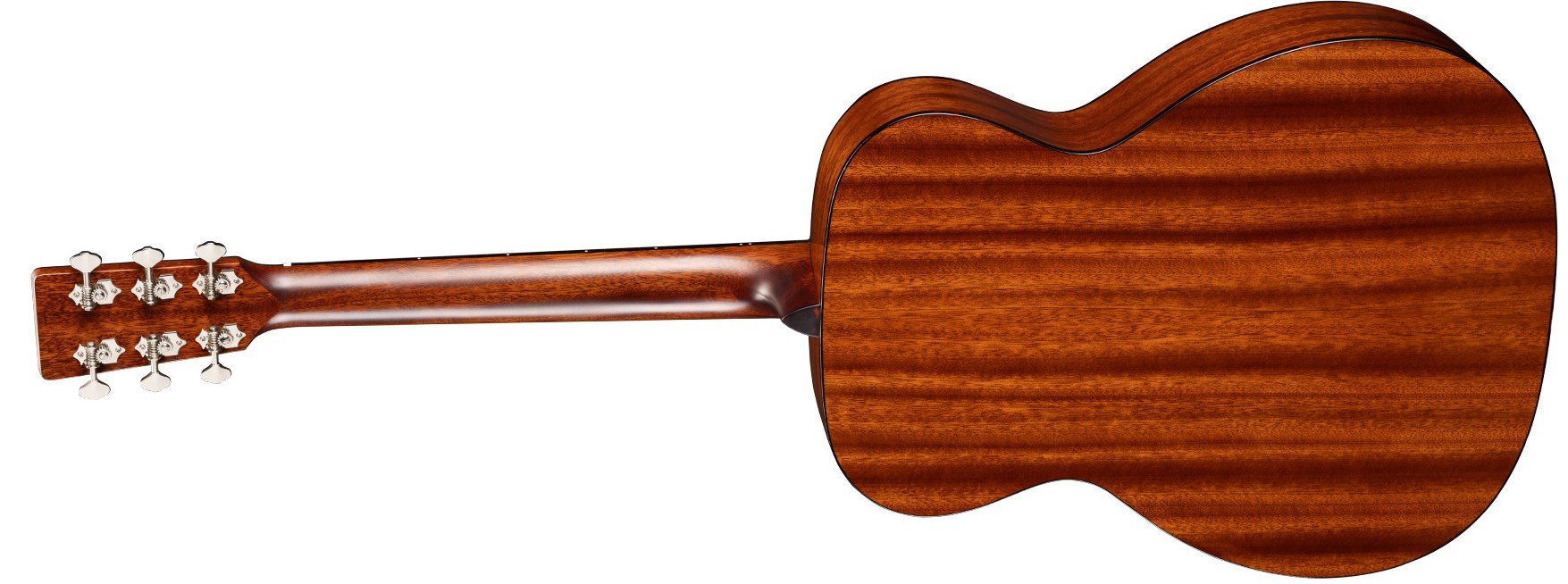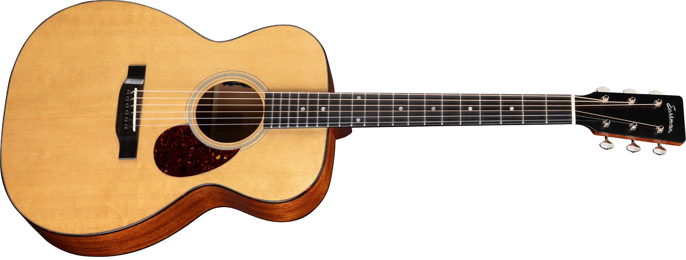 EASTMAN E1 OM DLX est une guitare acoustique de la série E1 Deluxe avec un corps de format OM, dos et éclisses en Sapele massif, table en épicéa Sitka massif, manche en acajou au profil Traditional Even C, tablette en ébène avec un rayon de 12" et 20 frettes Jescar-FW43080 et des incrustations en Pearl Dots, sillet en os, quincaillerie nickelée, mécaniques Open-Gear PingWell V93N 3+3 et chevalet en ébène avec une selle en os.