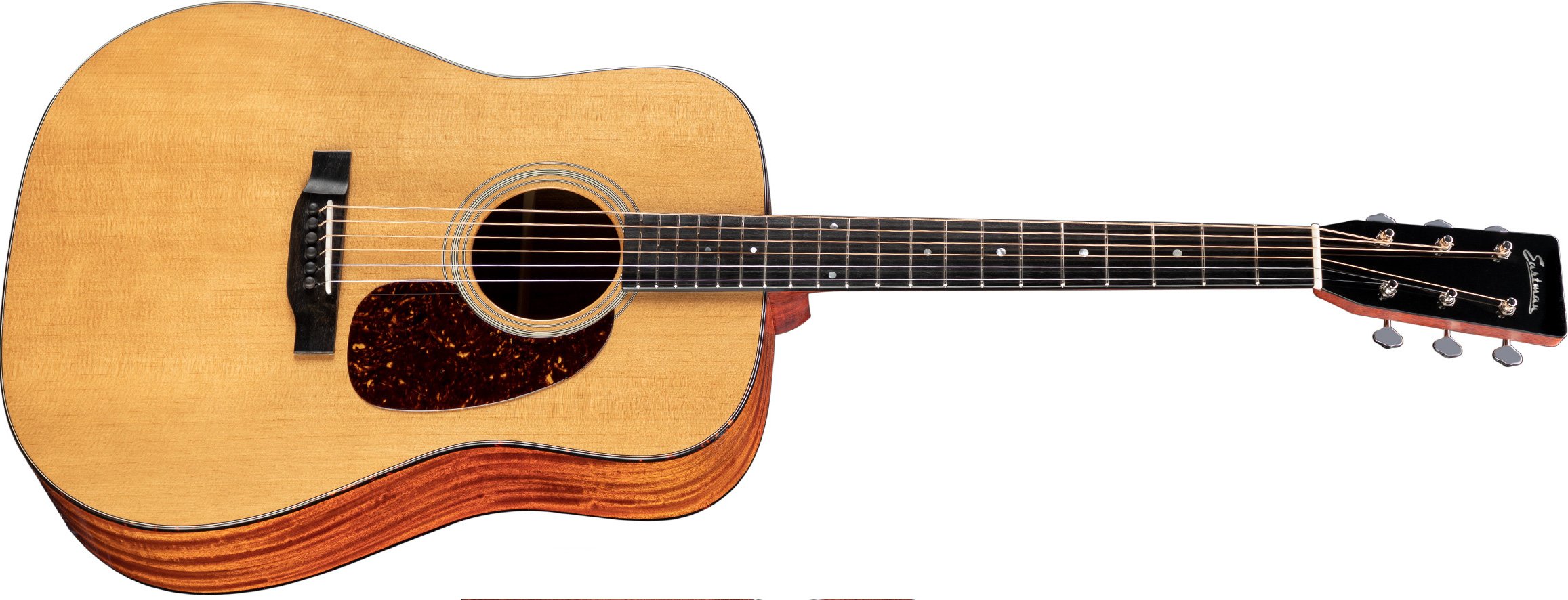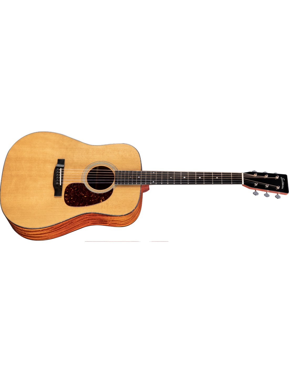 EASTMAN E6D-TC THERMO CURED est une guitare acoustique de la série E6D-TC avec un corps de forme Dreadnought, fond et éclisses en acajou massif, table en épicéa Sitka massif traité thermiquement, manche en acajou au profil Traditional Even C, tablette en ébène avec un rayon de 12" et 20 frettes Jescar-FW43080 et des incrustations en perles, sillet en os, quincaillerie nickelée, mécaniques Open-Gear PingWell V93N 3+3 et chevalet en ébène avec une selle en os. Inclut un étui rigide Eastman