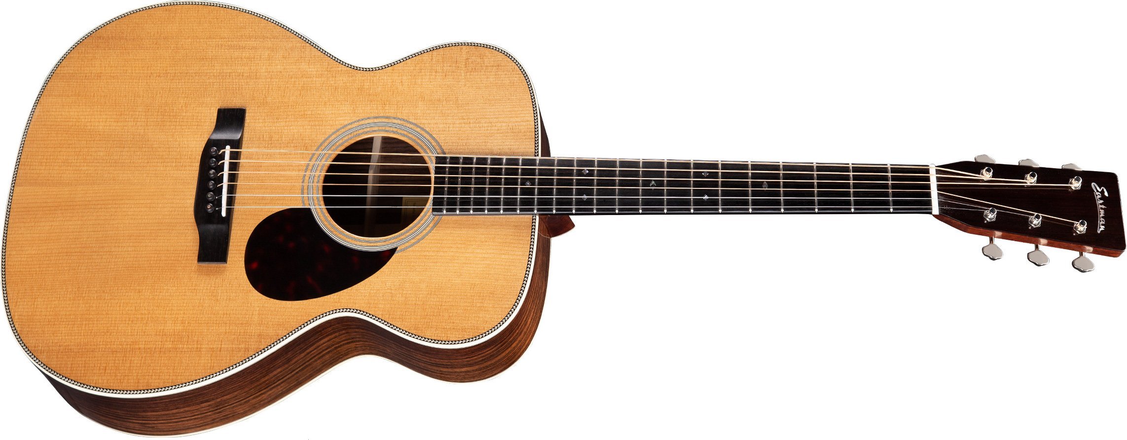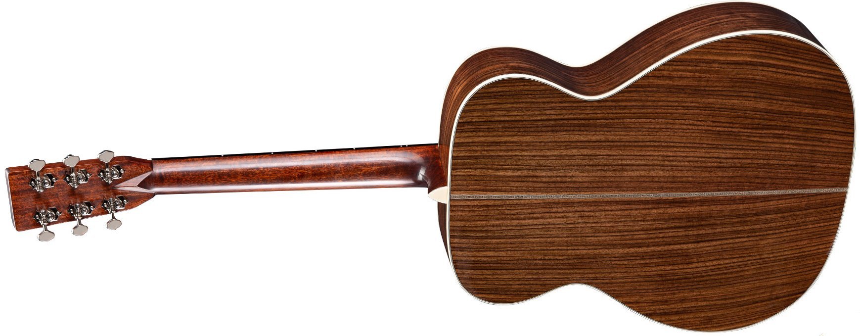 EASTMAN E20OM-TC THERMO CURED TOP est une guitare acoustique de la série E20OM avec un corps de forme OM, un fond et des éclisses en palissandre massif, un dessus en épicéa Adirondack massif traité thermiquement, un manche en acajou à profil Traditional Even C, un touche en ébène à rayon 12" avec 20 frettes Jescar-FW43080 et des incrustations en Abalone Flocons de Neige, un sillet en os, un matériel nickelé, des mécaniques Gotoh SE780-06M-N et un chevalet en ébène avec une selle en os. Comprend un étui rigide Eastman