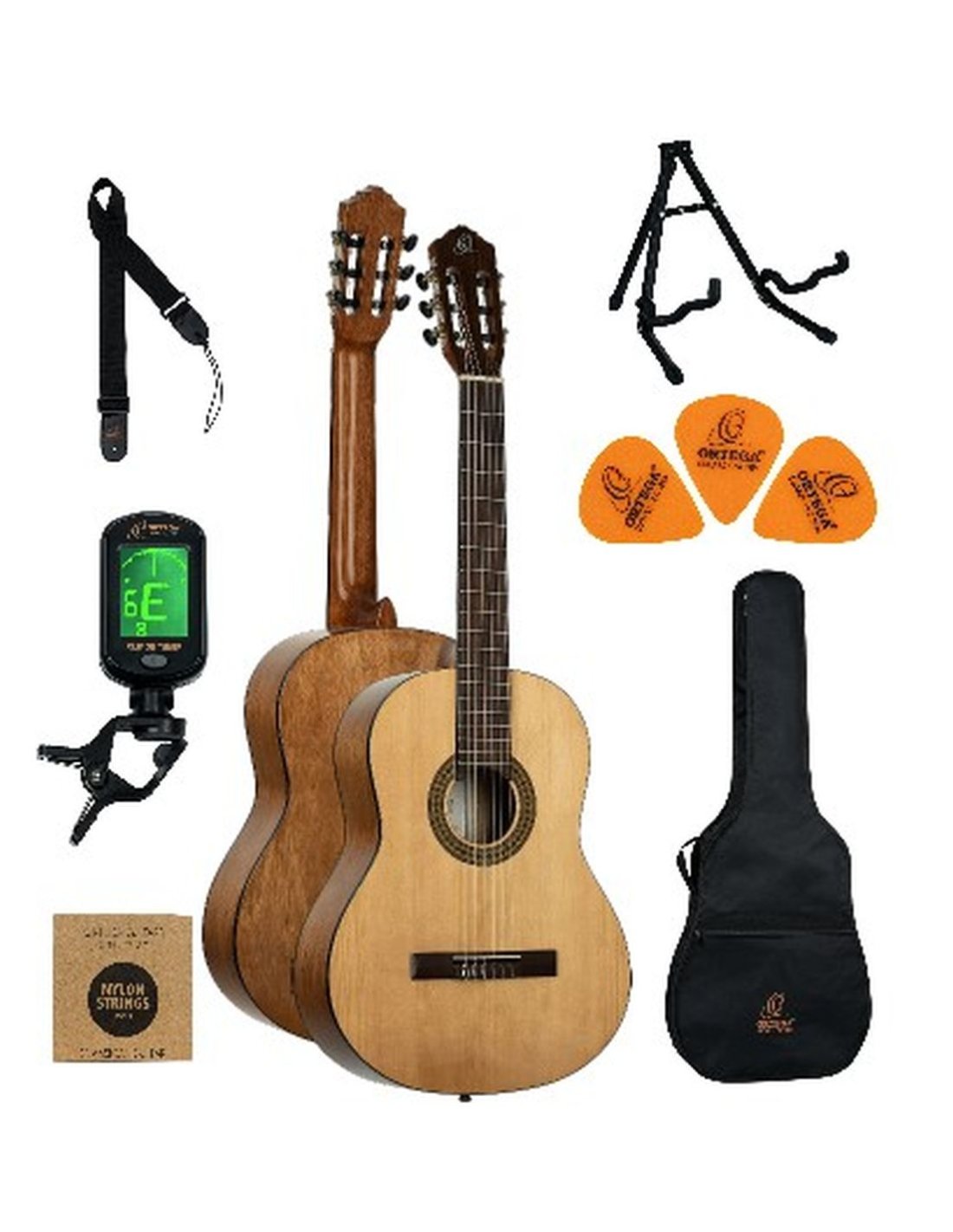 Tout ce dont vous avez besoin pour commencer à jouer de la guitare : le pack Ortega Guitar Picker offre une excellente qualité et combine une guitare avec des cordes en nylon avec les accessoires indispensables. Un pack tout-en-un idéal pour les débutants. Cet ensemble complet est conçu pour une manipulation facile, ce qui en fait le point d'entrée parfait pour ceux qui font leurs premiers pas dans le monde de la guitare. Le pack Picker est disponible en taille pleine et 3/4. Taille : 4/4. Largeur du sillet : 52 mm (2,05 pouces). Échelle : 650 mm (25,29 pouces). Ensemble de guitares avec cordes en nylon pour débutants. Table : épicéa, finition brillante. Dos et éclisses : catalpa, finition brillante. Style : acajou, finition brillante. Touche et chevalet : noyer. Chevalet : Ortega à 6 trous. Échelle : 650 mm (25,59”). Largeur du sillet : 52 mm (2,05”). Pack d'accessoires : sac, accordeur, support, sangle, cordes et pièces incluses.