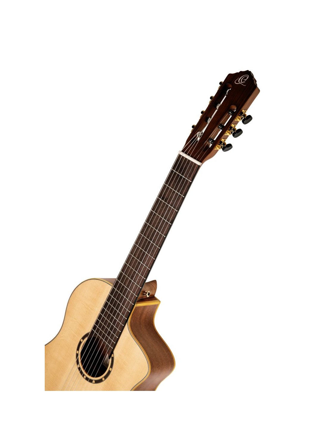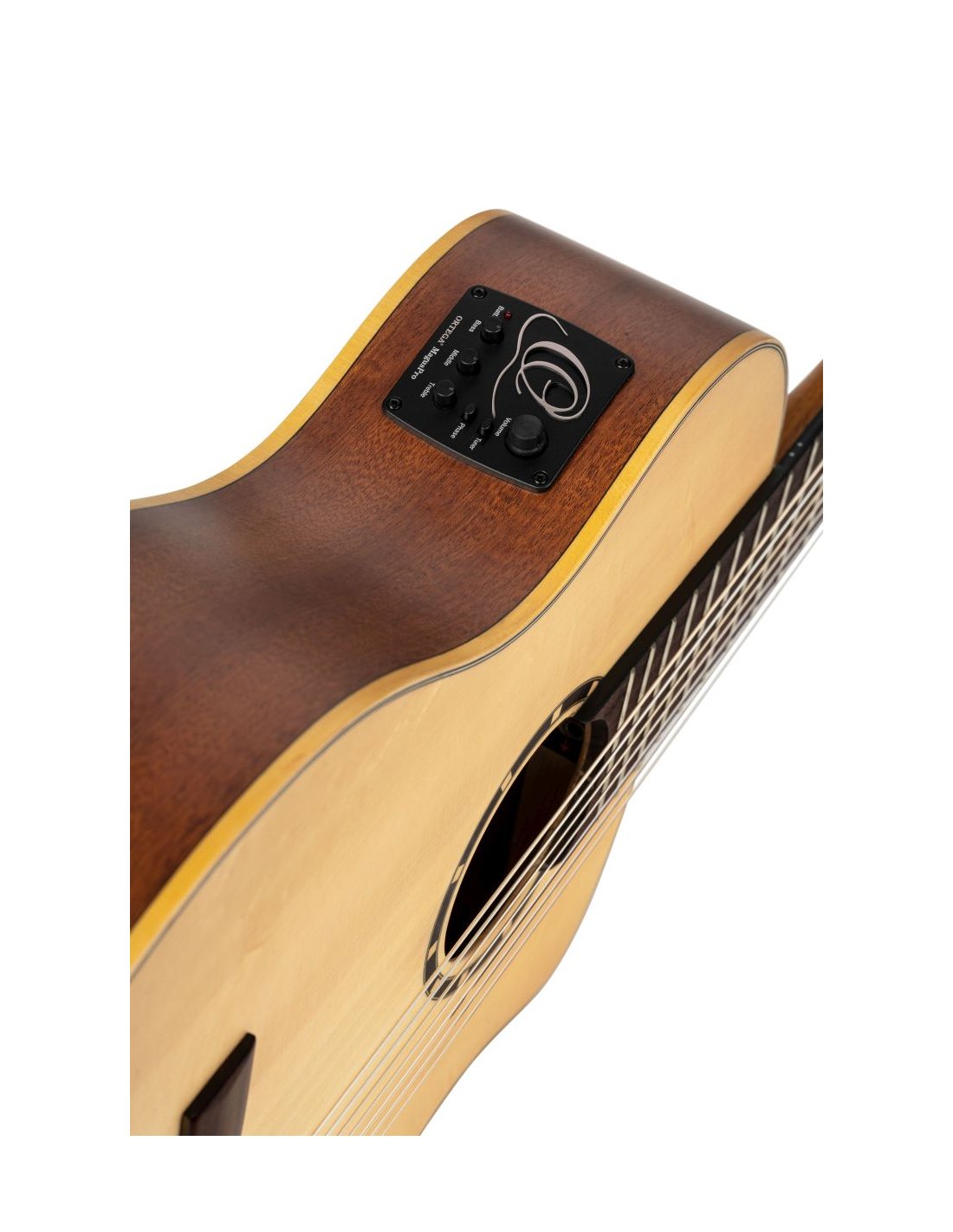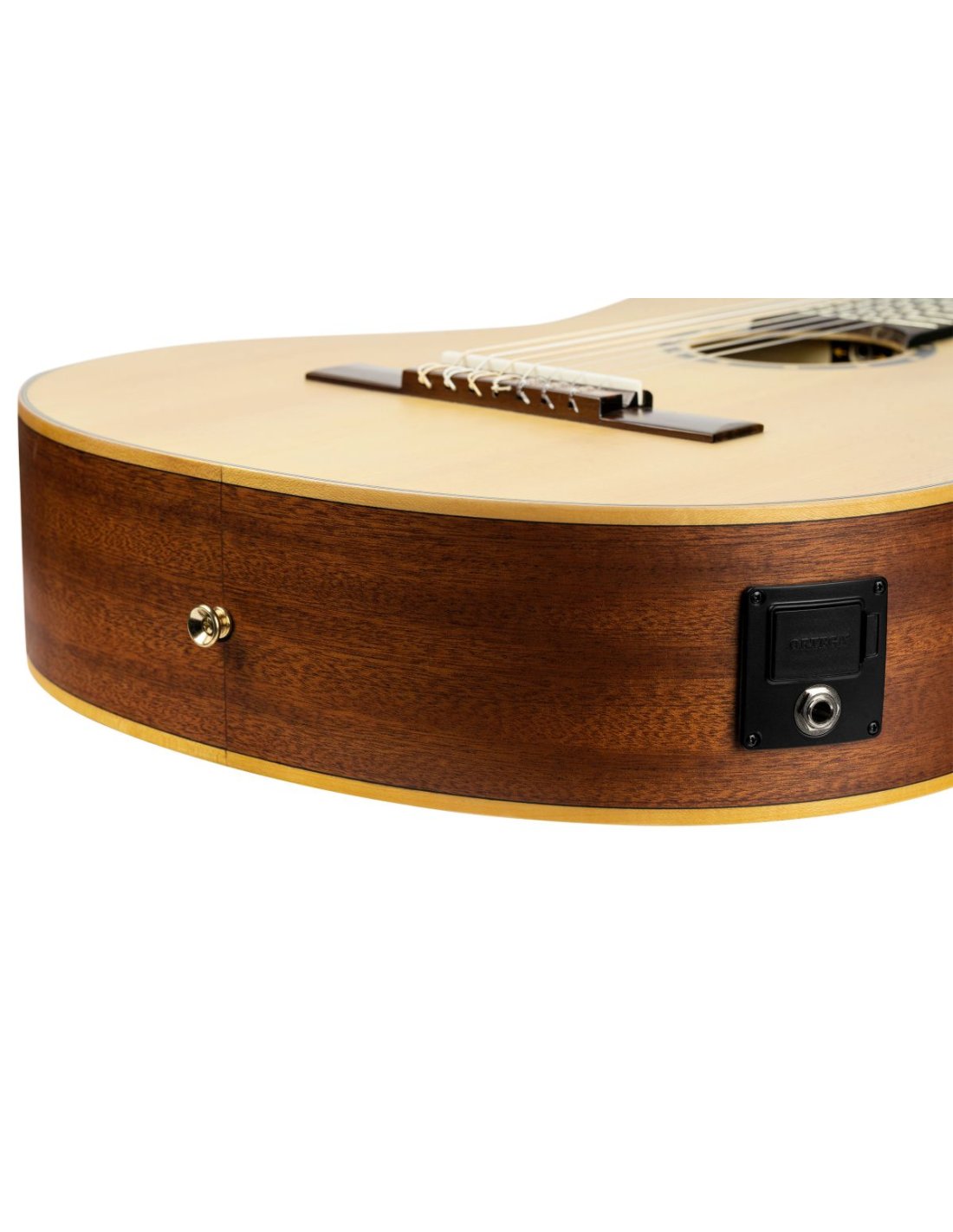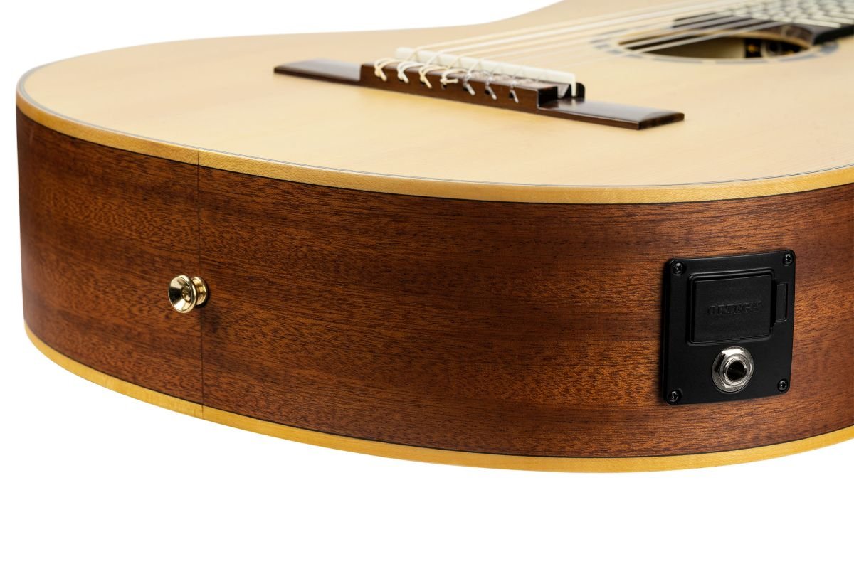 'Nos nouveaux modèles de guitares Family Series à 7 cordes sont équipés d'une corde de SI basse, ce qui étend votre gamme et vous permet de jouer de nombreux styles musicaux, comme le classique, le latino ou même le metal acoustique. Accorder votre guitare est simple grâce aux mécaniques personnalisées. Le dessus en épicéa massif et le corps en sapele produisent un son agréable, tandis que la large largeur du sillet et le pont Ortega à 12 trous offrent une expérience sonore confortable. Si vous souhaitez affiner vos compétences à la guitare, les modèles à 7 cordes sont une option fantastique. Les modèles sont livrés avec un étui de concert deluxe rembourré.Guitare Classique 7 cordes 4/4 Électrifiée à Épaule ManquanteTop en épicéa massif, finition satinéeFond et éclisses en sapele, finition satinéeManche Nato, finition satinéeTruss rod à 2 voiesBinding en ABS noirTouche et pont en noyerÉlectronique Ortega MagusPro avec accordeurÉchelle : 650mm / 25,59'' Frettes : 19Largeur au Sillet : 60mm / 2,36'' Pont Ortega 7 TrousOrtega2023'