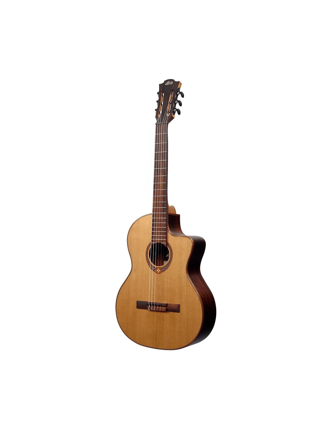 La OC118CE est la guitare classique en format 4/4 Cutaway de la série Occitania 118 de Lag. Elle présente un tableau en Cèdre Rouge massif, un dos et des éclisses en Acajou Khaya et un pont et une table en Branko Wood (Brownwood), un bois écologique et résistant aux changements de température et d'humidité conçu en collaboration avec Blackwood Tek. Elle est amplifiée avec le système Astro-Lag.