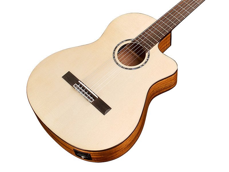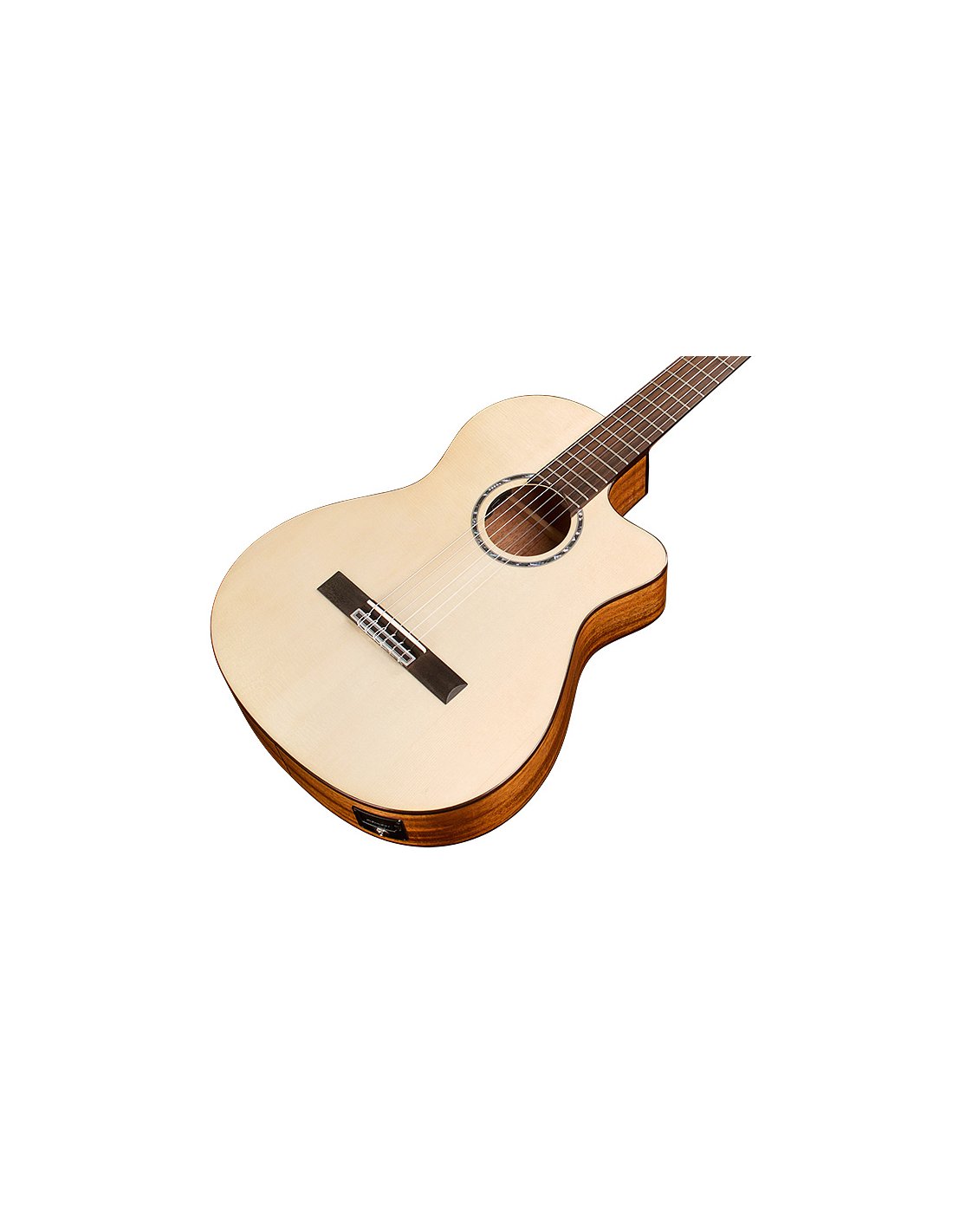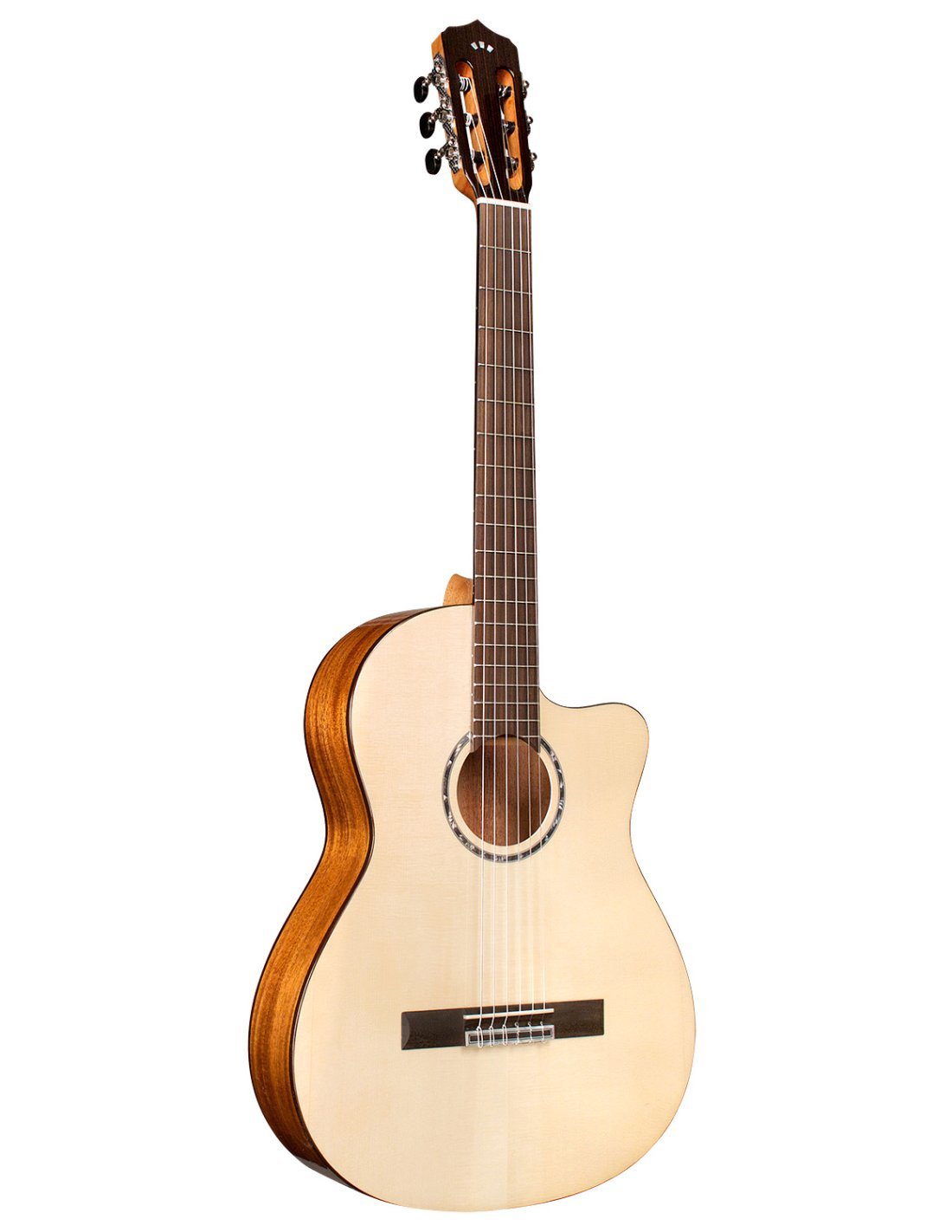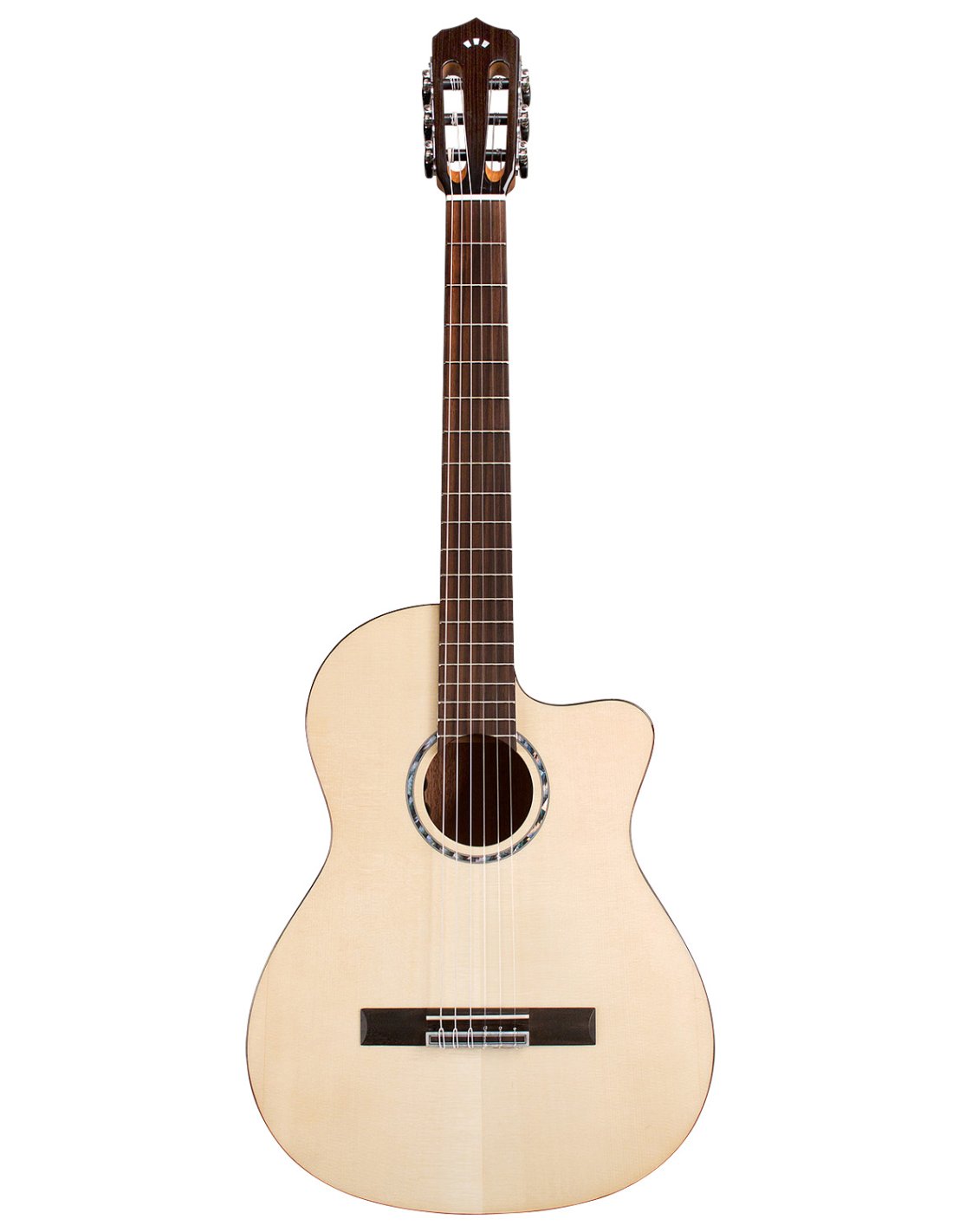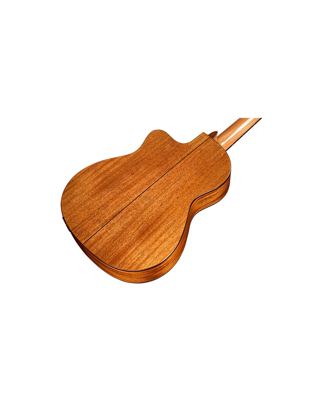 L'esordio de Córdoba dans la ligne fusion ! Choix parfait pour passer d'une guitare à cordes d'acier à une guitare en nylon, la Córdoba Fusion 5 est caractérisée par une table en épicéa massif, un dos et des éclisses en acajou, un corps plein avec cutaway pour étendre la plage de jeu, des marqueurs de position des frettes latéraux et une rosace avec décalcomanie perlée. Le manche fusion avec un sillet de 16'' et une largeur de sillet de 1 7/8'' (48 mm) offre une expérience sonore très similaire à celle d'une guitare à cordes d'acier. Cette familiarité permet une transition facile pour les joueurs de cordes d'acier et les musiciens avec des mains plus petites vers le monde de la guitare à cordes de nylon. Les marqueurs latéraux ajoutés s'écartent également de la construction traditionnelle des guitares à cordes de nylon, fournissant aux joueurs un repère pour leur position sur le manche. Équipée du système de micro Fishman Sonitone, la Fusion 5 est prête à être branchée et à jouer. Disponible dans les finitions Gloss Natural et Jet-Black avec dos et éclisses en acajou et Gloss Sonata Burst avec dos et éclisses en acajou flammé.