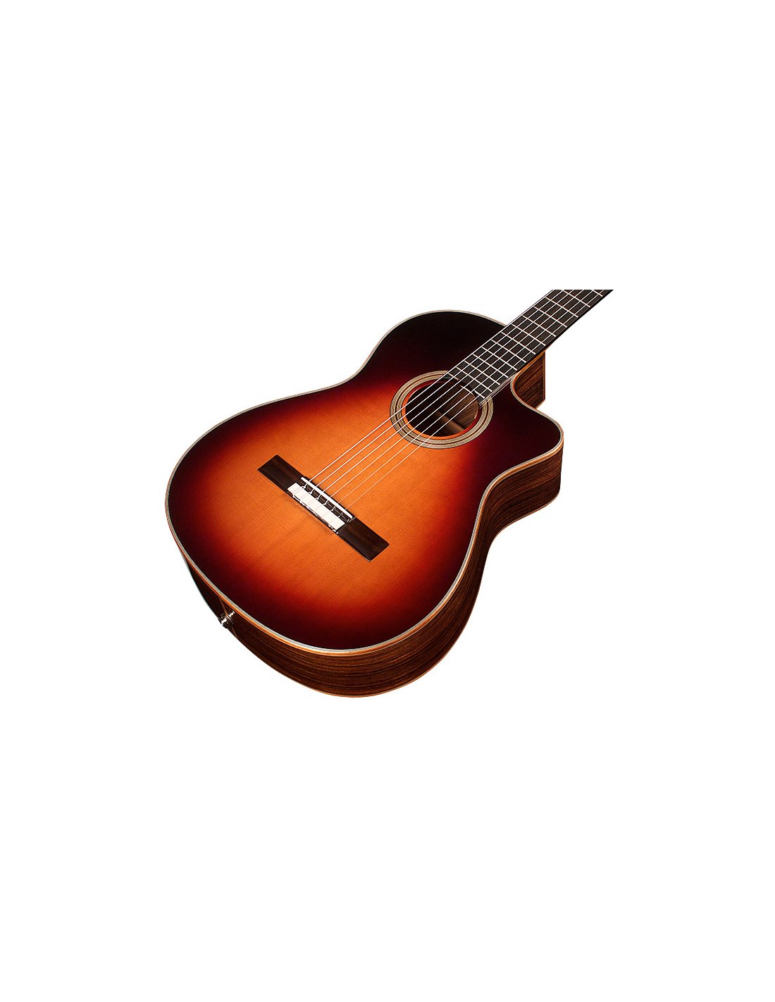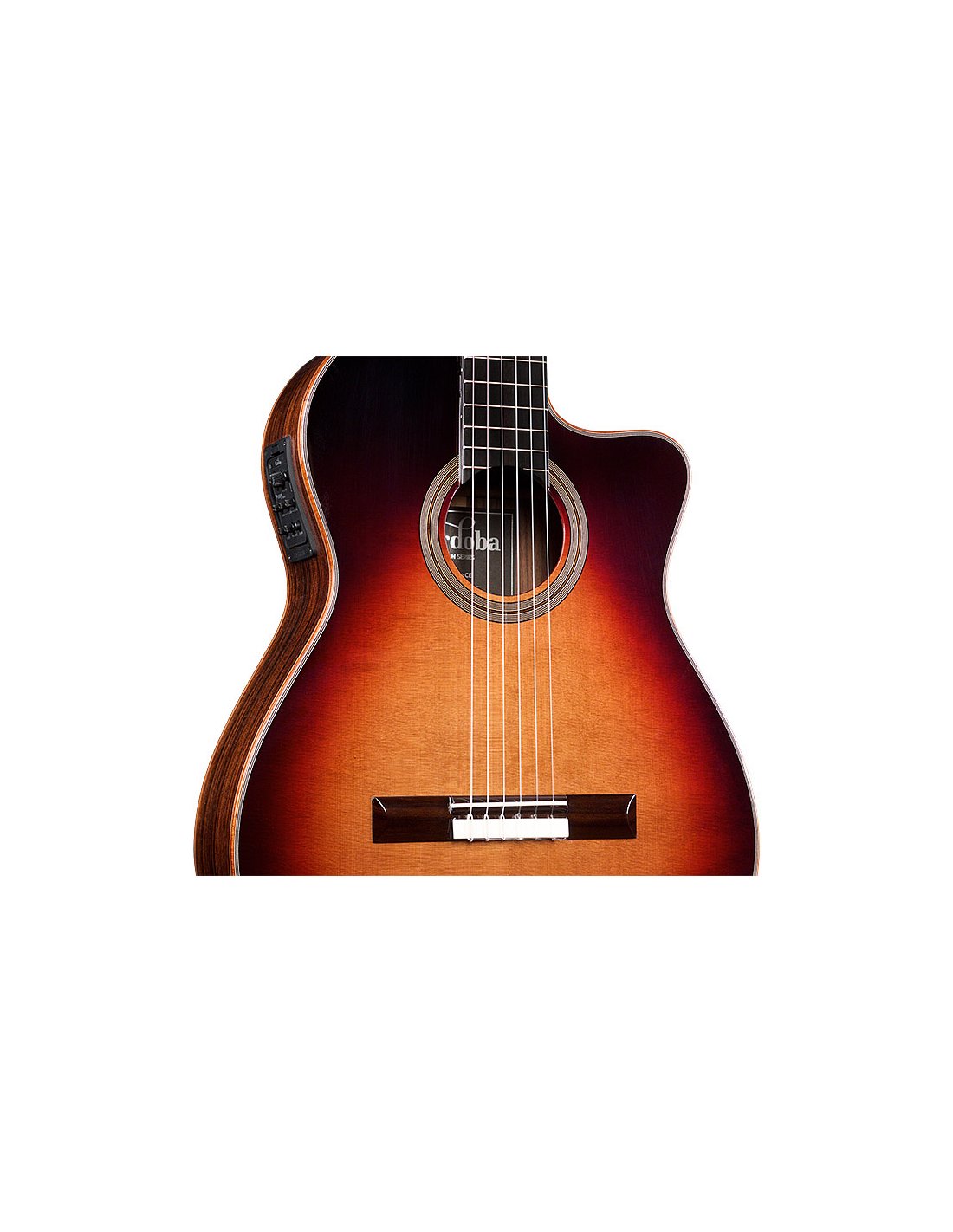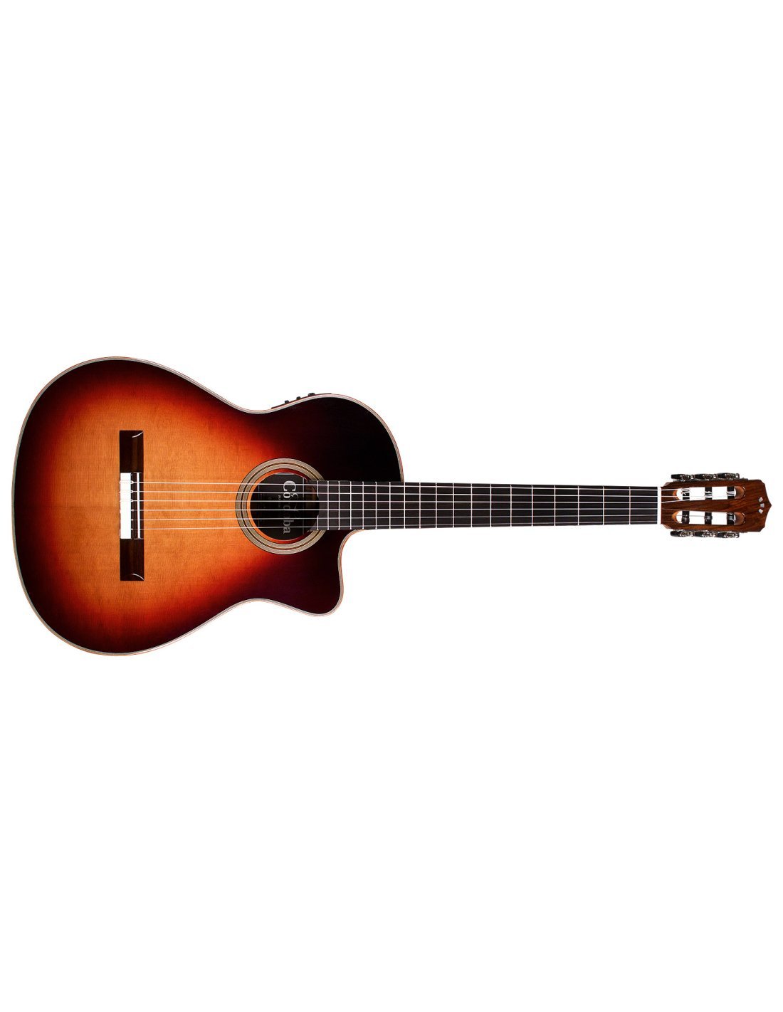 'La Orchestra CE est l'une de nos meilleures guitares Fusion. Disponible avec un dessus en cèdre rouge occidental et un fond et des éclisses en palissandre, la caractéristique principale de ce modèle est le profil du manche Fusion (largeur du sillet de 48 mm et rayon de touche de 16'') et seulement 12 frettes jusqu'au corps, ce qui maximise la quantité de résonance et de vibration à travers la table d'harmonie. C'est la parfaite fusion entre des designs classiques espagnols et une esthétique moderne. Touche en ébène, incrustation Cordoba en arc en nacre sur la tête et raffinée bordure en acajou, le tout complété par une finition brillante à haute brillance. Prête à être branchée et jouée, la Orchestra CE est équipée du préamplificateur Fishman Presys Blend. Maintenant disponible dans une magnifique finition brillante Tear Drop Burst.'