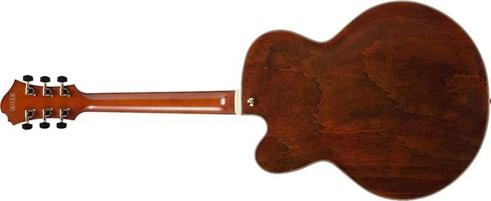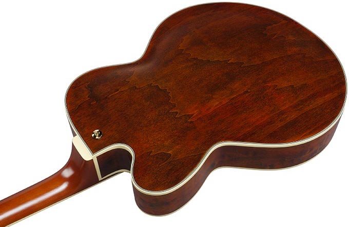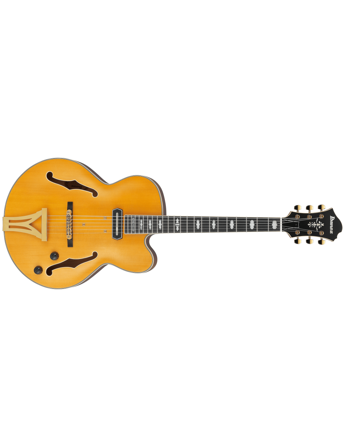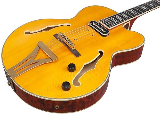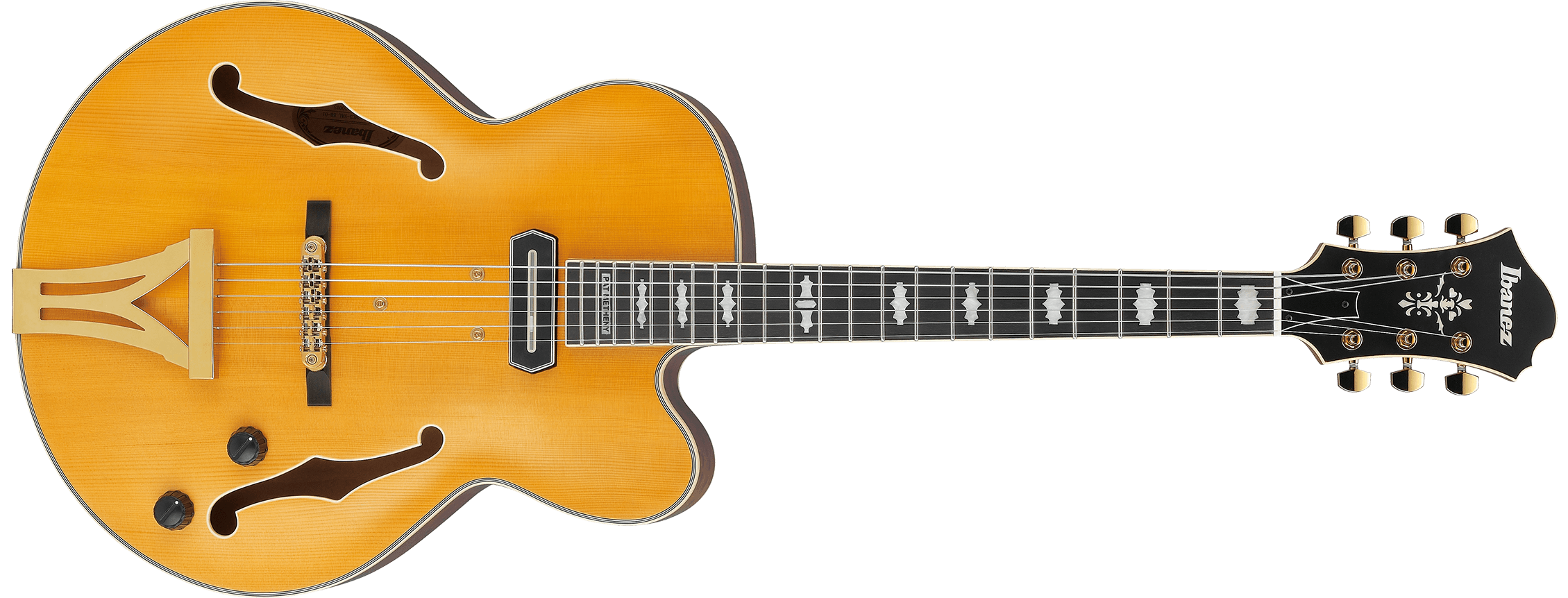 IBANEZ PM3C-NAL est une guitare électrique hollow body, modèle Pat Metheny Signature Ibanez PM3C, avec un dessus en épicéa Sitka, un fond et des éclisses en érable, un manche en 3 pièces Nyato/érable encolé avec profil PM, un touche en ébène reliée à un rayon de 12" avec 22 frettes Medium Jumbo avec traitement Artstar Fret Edge et incrustations PM3C en acrylique, un sillet de 43 mm en os, un matériel Titan Gold, des mécaniques Ibanez moulées avec clés "Titan Gold" et un pont Gibraltar Performer 6 cordes avec base en ébène et chevalet VT200. L'électronique se compose d'un micro simple bobinage Ibanez PM Special Passive/Céramique positionné au manche avec des contrôles de volume master et de tonalité master. Inclus : étui Ibanez Harshell