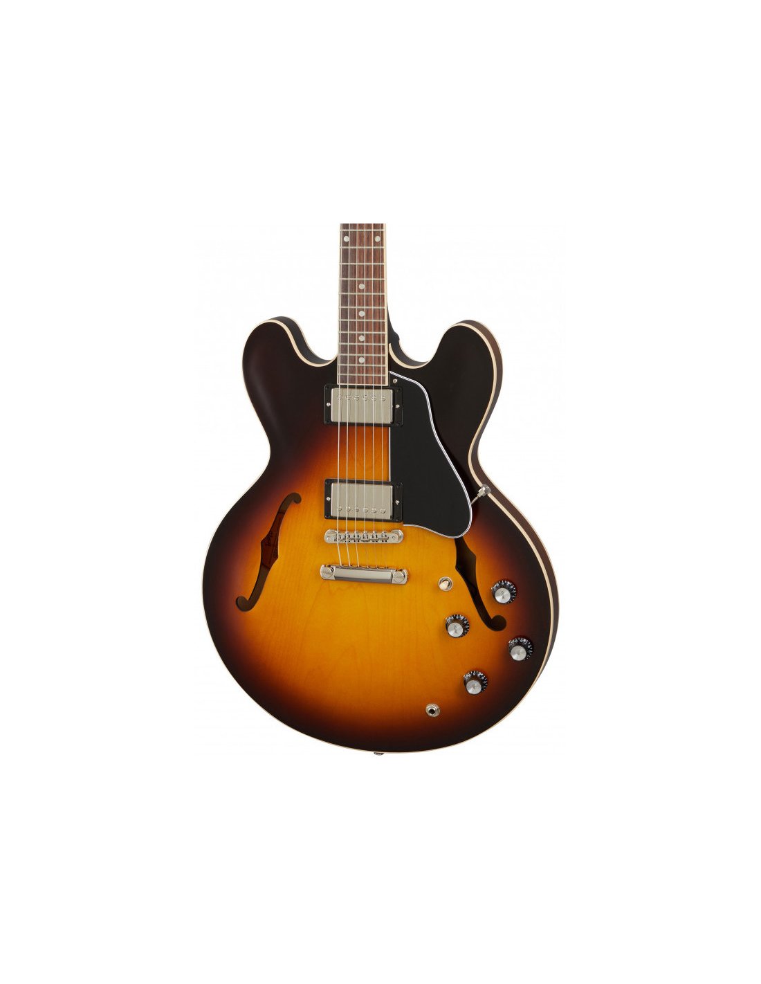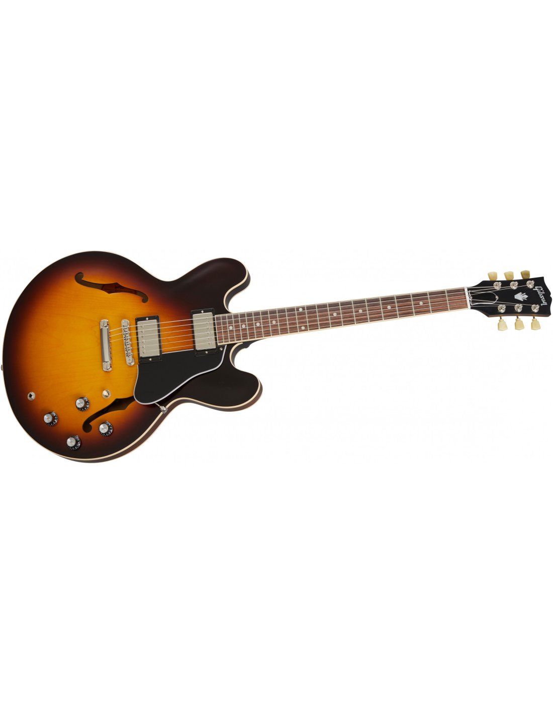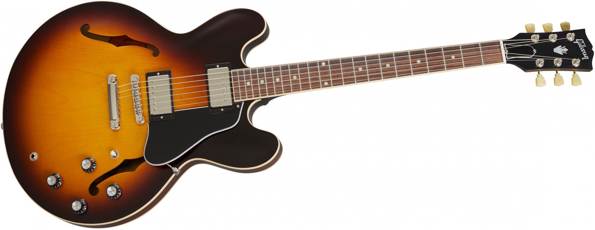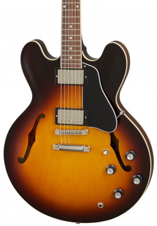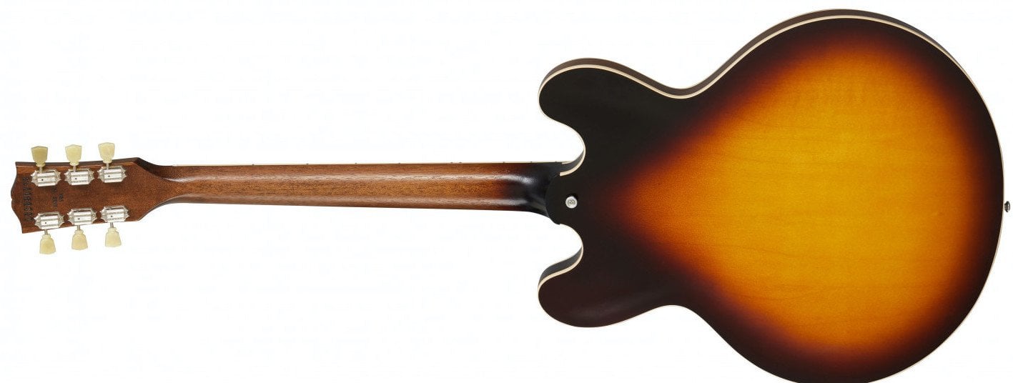 GIBSON ES-335 SATIN VINTAGE SUNBURST. Guitare Électrique Hollow-Body Gibson ES-335 Satin Vintage Sunburst avec finition satinée. Les caractéristiques techniques incluent un corps en acajou laminé à 3 couches, un manche en acajou massif avec profil en C arrondi, un doigté en palissandre indien à rayon de 12" et 22 frettes Medium Jumbo, des incrustations en pointillés en nacre. L'électronique est équipée de 2 micros Calibrated T-Type Humbucker avec des contrôles de volume et de tonalité séparés pour les micros au chevalet et au manche, un sélecteur à levette câblé à la main et des potentiomètres de 500k. Il présente également un matériel en nickel, un pont ABR-1 Tune-O-Matic, des mécaniques Vintage Deluxe avec boutons Keystone, un sélecteur de micros Switchcraft à 3 voies. Comprend une housse rigide Gibson.