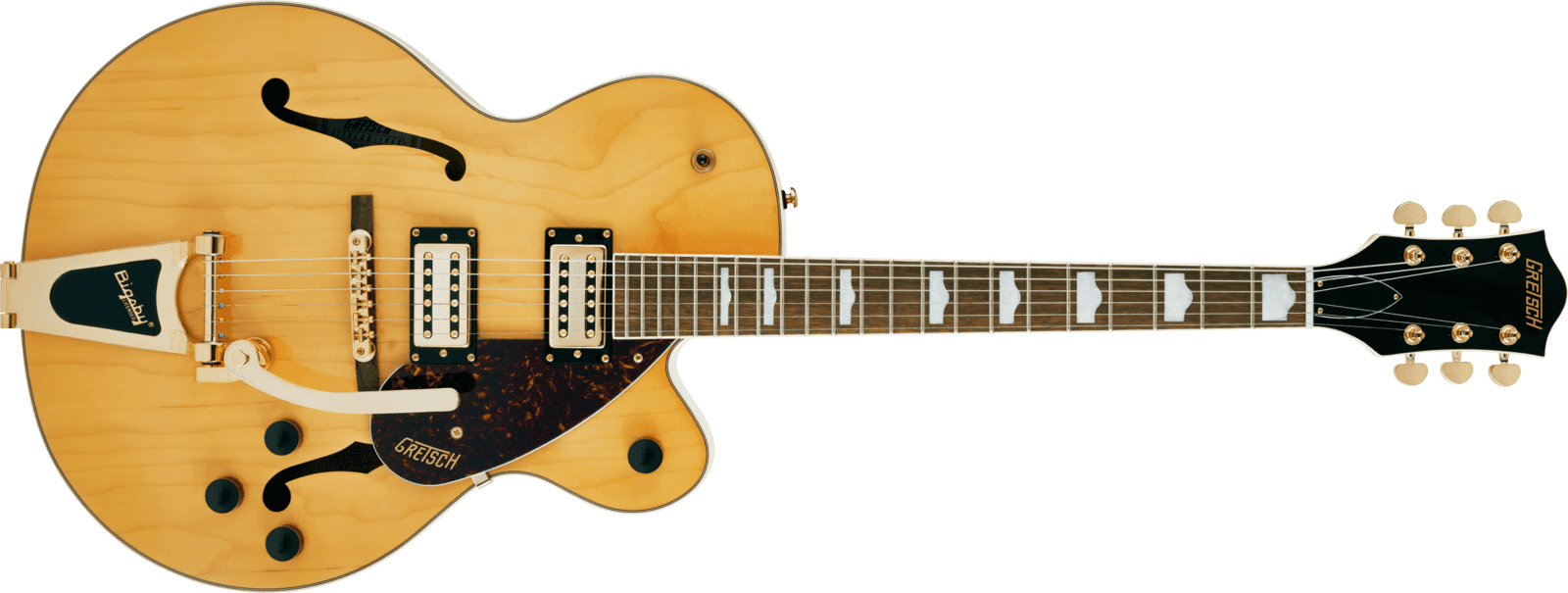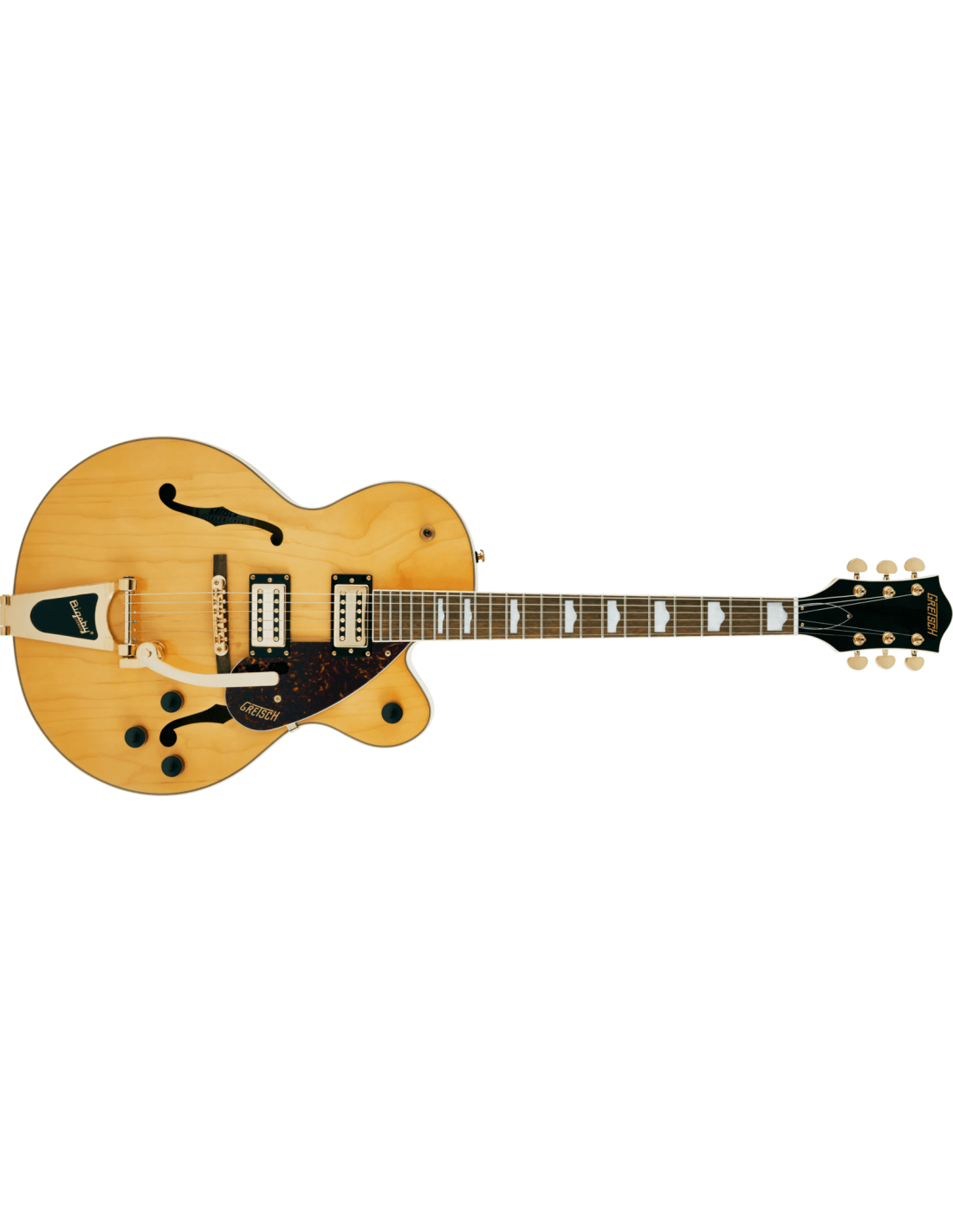 Guitare Électrique Hollow BodyGretsch G2410TG Streamliner couleur Village Amber. La Gretsch G2410TG Streamliner est une guitare électrique hollow body à 6 cordes. Les caractéristiques techniques incluent un corps en érable laminé, un manche en nato avec un profil Thin "U", un touche en laurier, 22 frettes medium jumbo, des micros Broad'Tron BT-2S Humbuckers, des contrôles Volume/Volume/Tonalité/Volume Principal et un sélecteur à 3 positions, un pont Adjusto-Matic avec vibrato Bigsby-Licensed B60. Matériel doré.
