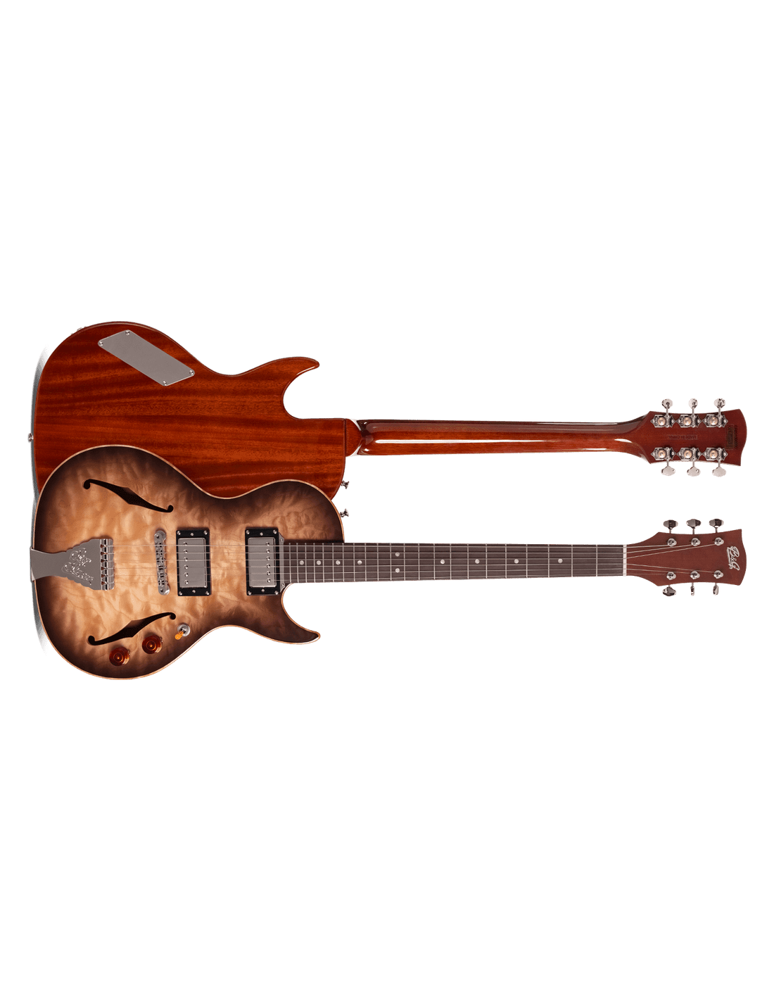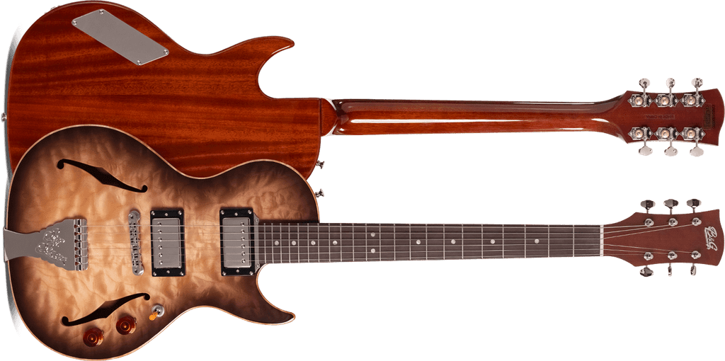 La B&G STEP SISTER CUTAWAY QUILTED est une guitare électrique semi-hollow à 6 cordes. Les caractéristiques techniques comprennent : corps à chambres tonales avec table en érable massif figuré et fond en acajou, manche constitué d'un morceau unique en acajou avec profil soft V, Truss Rod à double action, touche en katalox (ébène réel mexicain) avec rayon de 12” et incrustations en nacre, sillet en TASQ (os bone synthétique). Elle est équipée de micros Humbucker B&G, sélecteur à trois positions, mécaniques Glover Open Gear Tuners, pont ABR, matériel en laiton plaqué nickel.