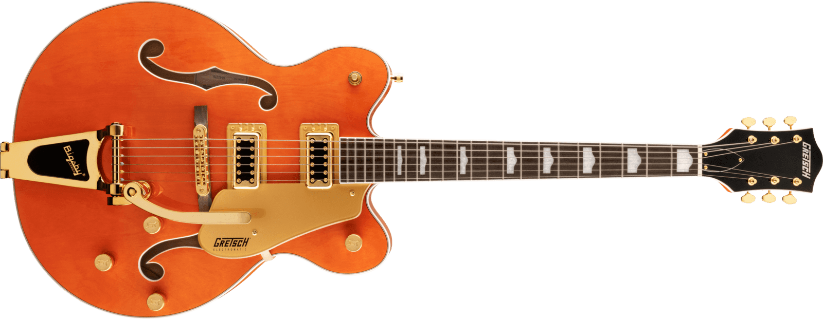 Guitare Électrique Gretsch G5422TG EMTC Classic H.Body couleur Orange Stain. La Gretsch G5422TG EMTC Classic H.Body est une guitare électrique hollow-body à 6 cordes. Les caractéristiques techniques comprennent un corps en érable laminé, avec une structure Trestle Block, un manche en érable avec un touche en laurier et 22 frettes Medium Jumbo. Elle est équipée de deux micros FT-5E Filter'Tron. Contrôles Volume/Volume/Tonalité/Volume Principal et sélecteur à 3 positions. Matériel doré avec un pont Adjusto-Matic et un vibrato Bigsby B60.