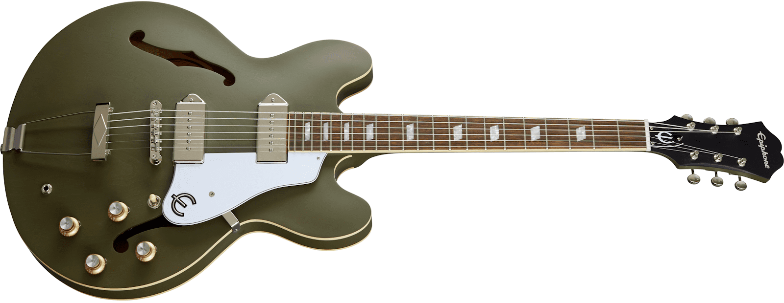Guitare Électrique Hollow-Body Epiphone Casino couleur Worn Olive Drab. La Epiphone Casino est une guitare électrique Hollow-Body à 6 cordes. Les caractéristiques techniques comprennent un corps en érable laminé, un manche en acajou avec profil 60s C, un doigté en laurier indien, un rayon de 12" avec 22 frettes Medium Jumbo. Elle est équipée de deux micros Epiphone PRO P-90, avec 2 contrôles de Volume et 2 de Tonalité, et un sélecteur à 3 positions. Matériel nickelé, avec un pont LockTone Tune-O-Matic, un cordier Diamond Trapeze et des mécaniques Vintage Deluxe.