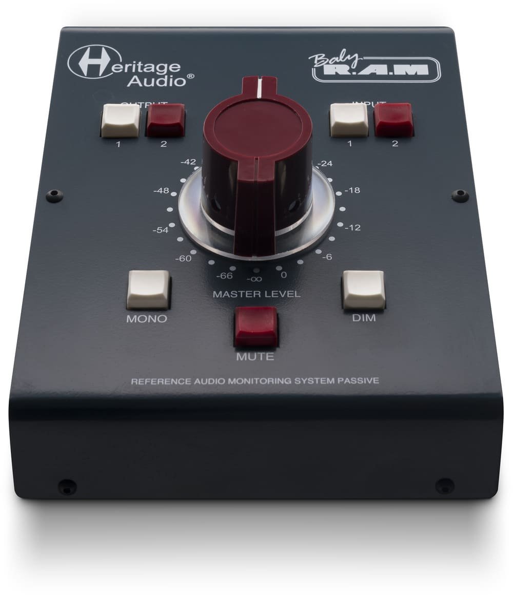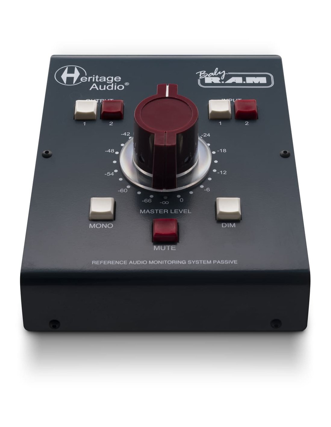 HERITAGE AUDIO BABY RAM est un contrôleur passif à 2 canaux pour moniteurs de bureau. Les caractéristiques techniques incluent un grand bouton de niveau maître à 24 positions pour une précision maximale, 2 paires d'entrées et de sorties TRS stéréo équilibrées, des commandes à bouton Mute, Dim, Mono et 1/2 pour sélectionner les moniteurs individuels à gauche/droite.