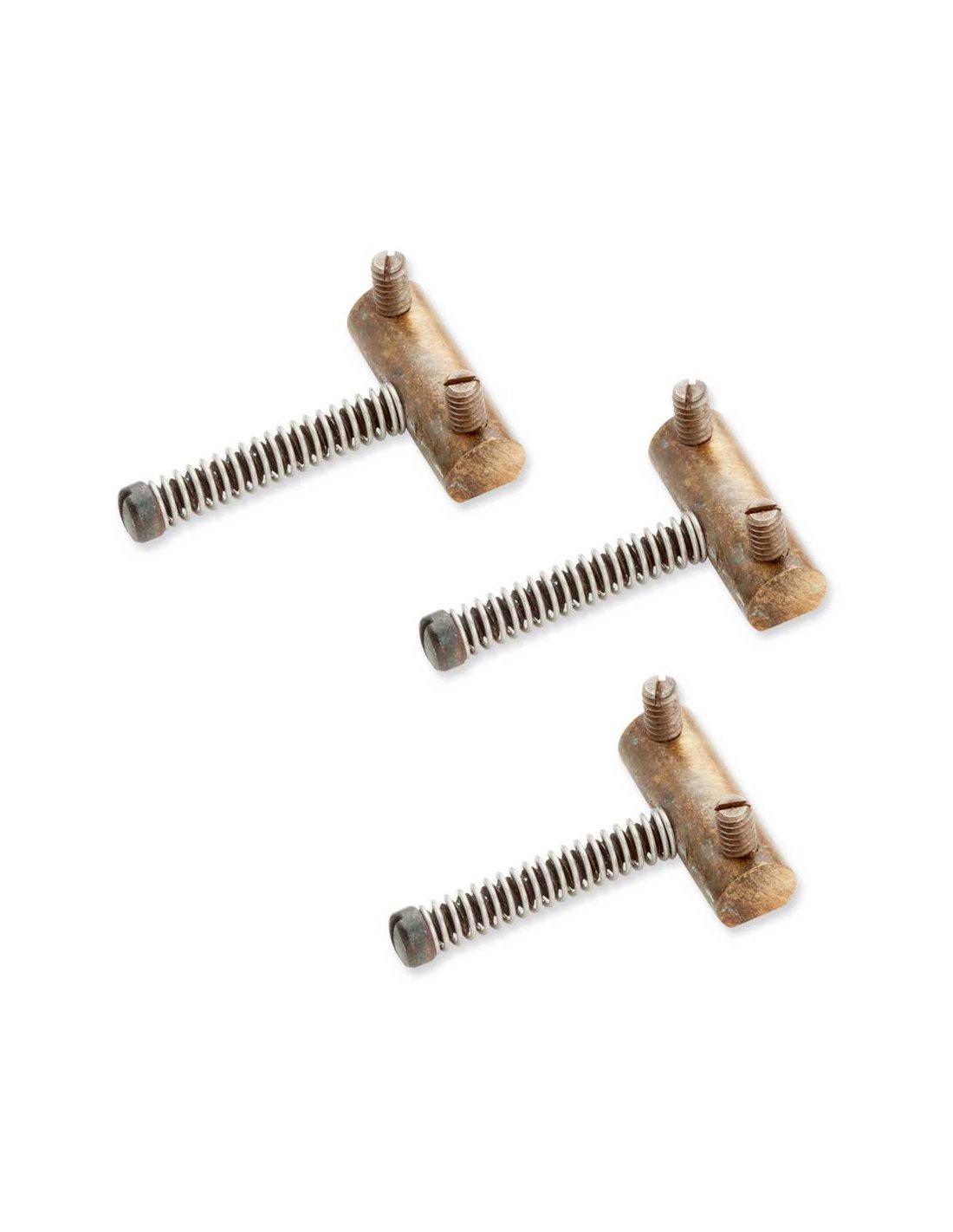 11089-01 Our vintage reproductions of the old 5253 Telecaster bridge saddles. Hand machined from the best brass alloy, the Antiquity 50s Brass Bridge Saddles are made to bring out great sustain and the fullness of each note. These saddles are aged like they've been played for many decades. The intonation screw is a fillister head, and the height adjustment screws are headless, slotted machine screws. The bottoms of the bridge saddles are trimmed to give added height adjustment (up or down). The thee bridge units fit standard bridge specifications.Length: .850Width .310Height .265Total screw height .492 Height adjustment 632 X .492 , headless, slottedIntonation: 632 X 1.25 , fillister head, slotted