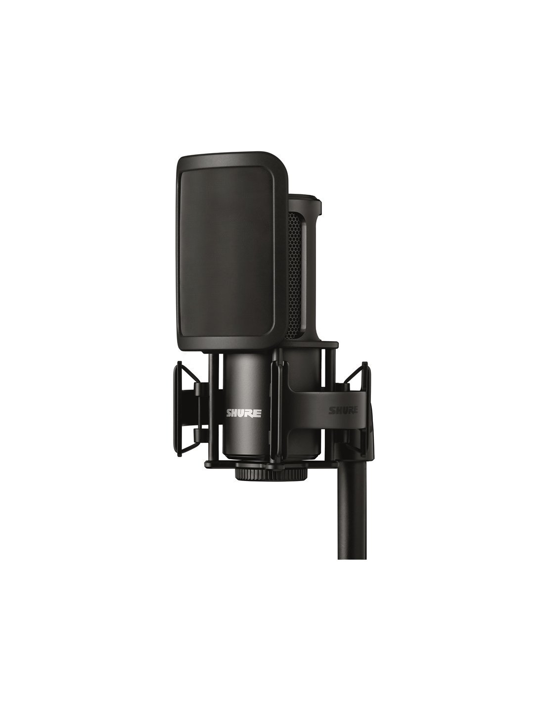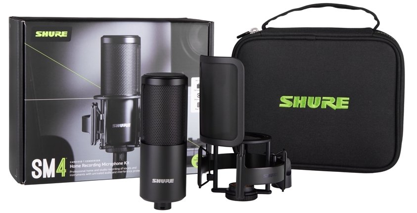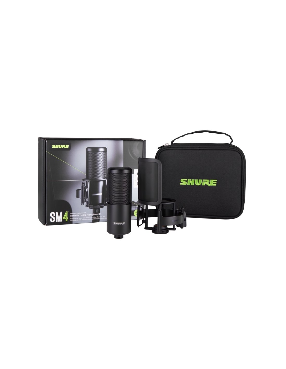 SHURE SM4 KIT est un kit complet qui comprend : un microphone à condensateur, cardioïde pour l'enregistrement à domicile SM4, le support pour perche anti-vibration (shockmount) A4SM, le filtre anti-pop magnétique amovible A4PF et la housse rembourrée avec fermeture éclair et poignée A4CC.