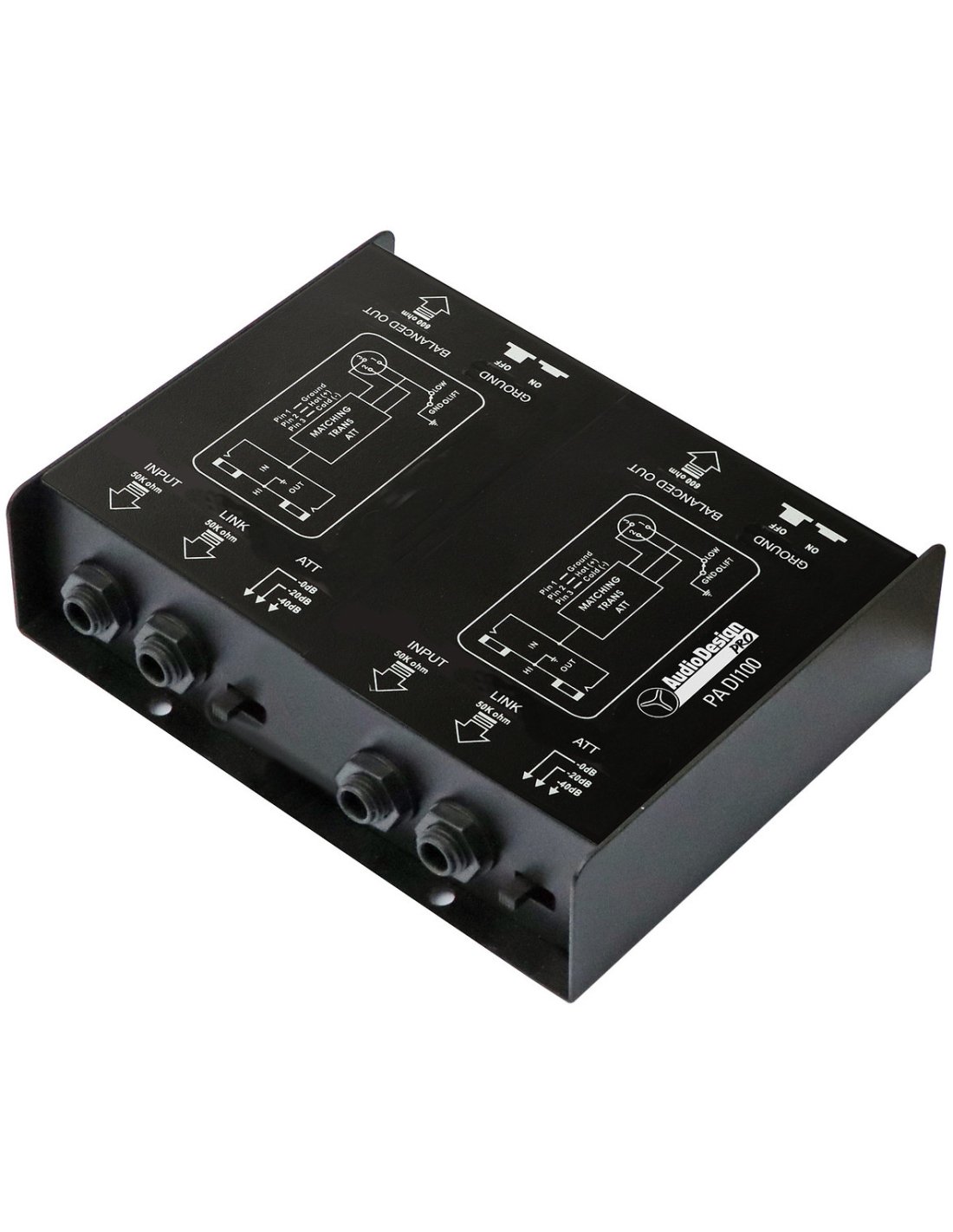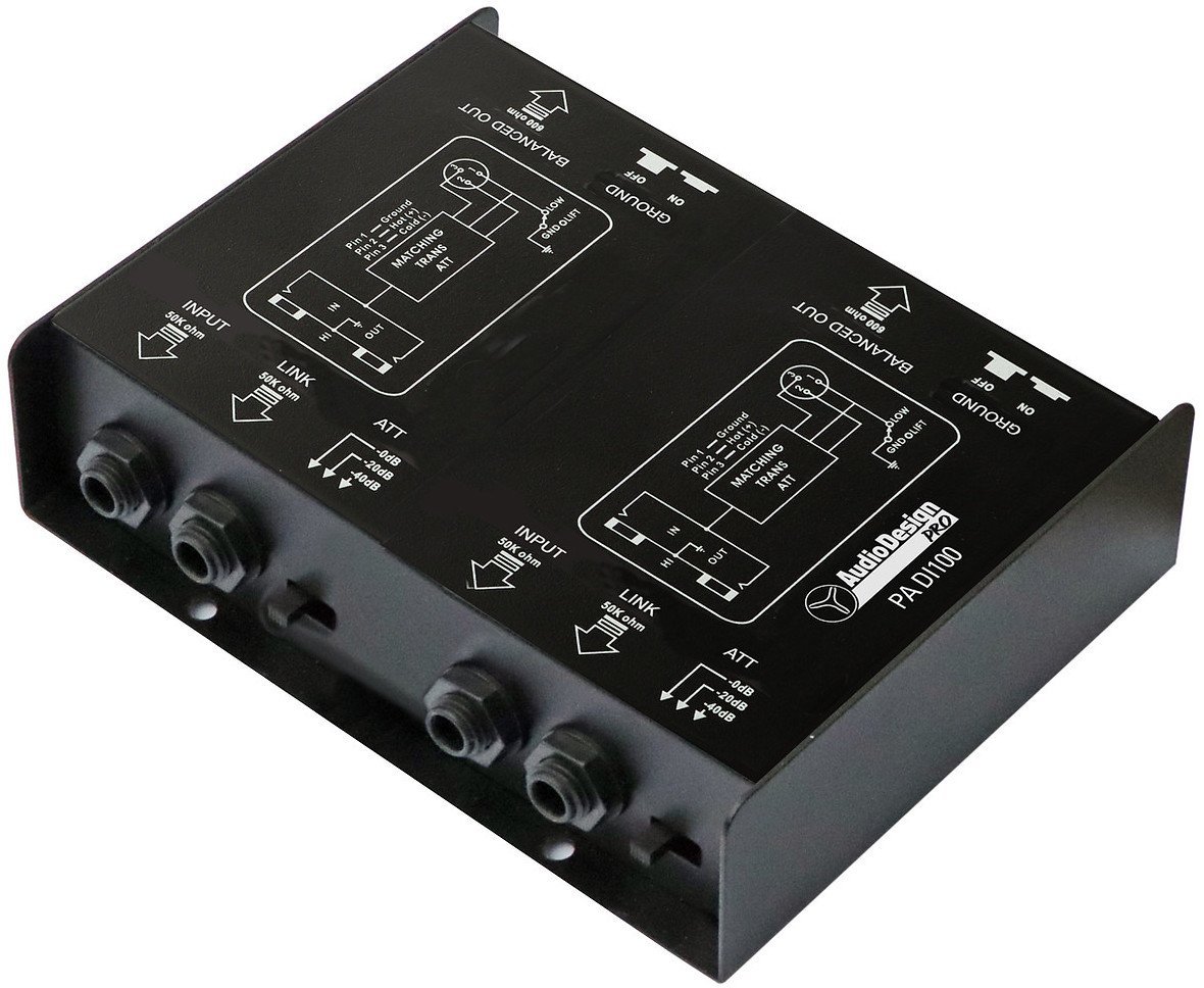 AUDIODESIGN PA DI 200 est une boîte D.I. passive à 2 canaux, avec 2 entrées Jack mono de 50 Kohm, 2 entrées XLR, prise Link Jack mono 50 Kohm, 2 sorties XLR équilibrées de 600 Ohm, pad d'atténuation 0/-20/-40 dB et 2 interrupteurs Ground lift