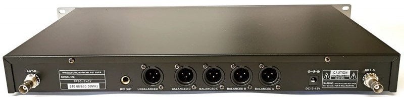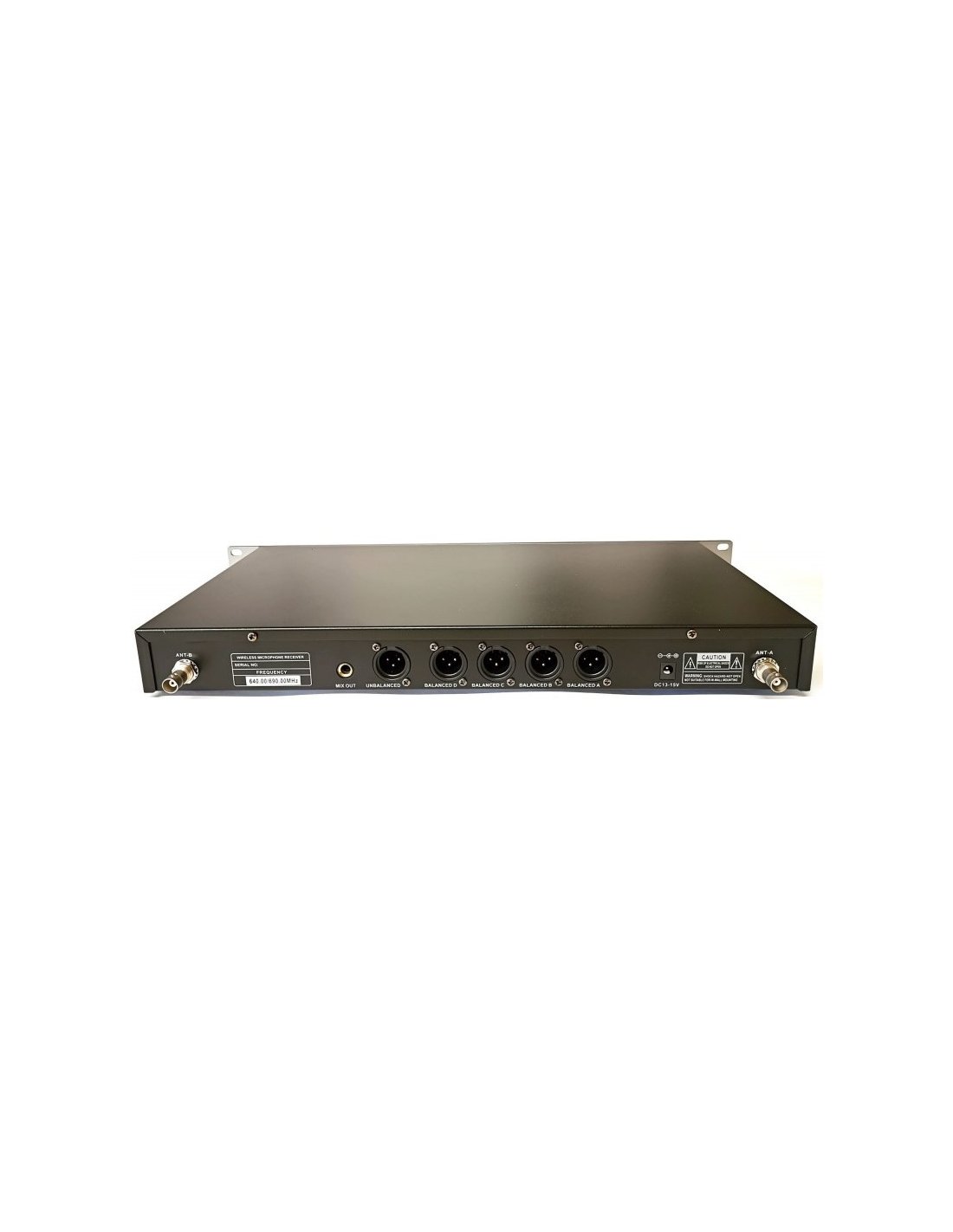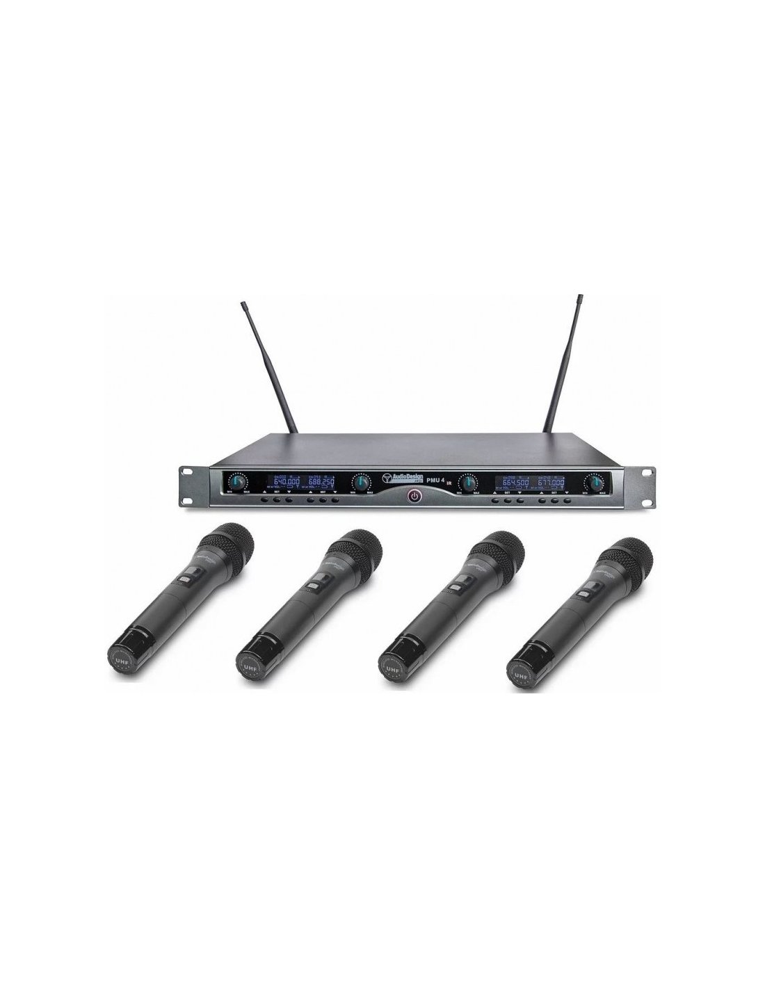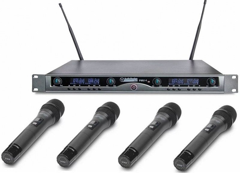 AUDIODESIGN PMU 404T RADIO 4 MANO. Système sans fil UHF à fréquence variable 4 canaux constitué d'un récepteur et de 4 émetteurs portables. Les caractéristiques techniques incluent 100+100 fréquences sélectionnables de 635,000 à 684,750 MHz, synchronisation récepteur/microphones via IR, fonction Auto Scan, contrôles séparés du volume. Radiomicrophones portables à motif polaire supercardioïde avec affichage et indicateur d'état de la batterie, capsule microphonique avec aimant en néodyme, bouton muet, alimentation par 2 piles AA, volume de sortie réglable, sorties XLR et Jack.