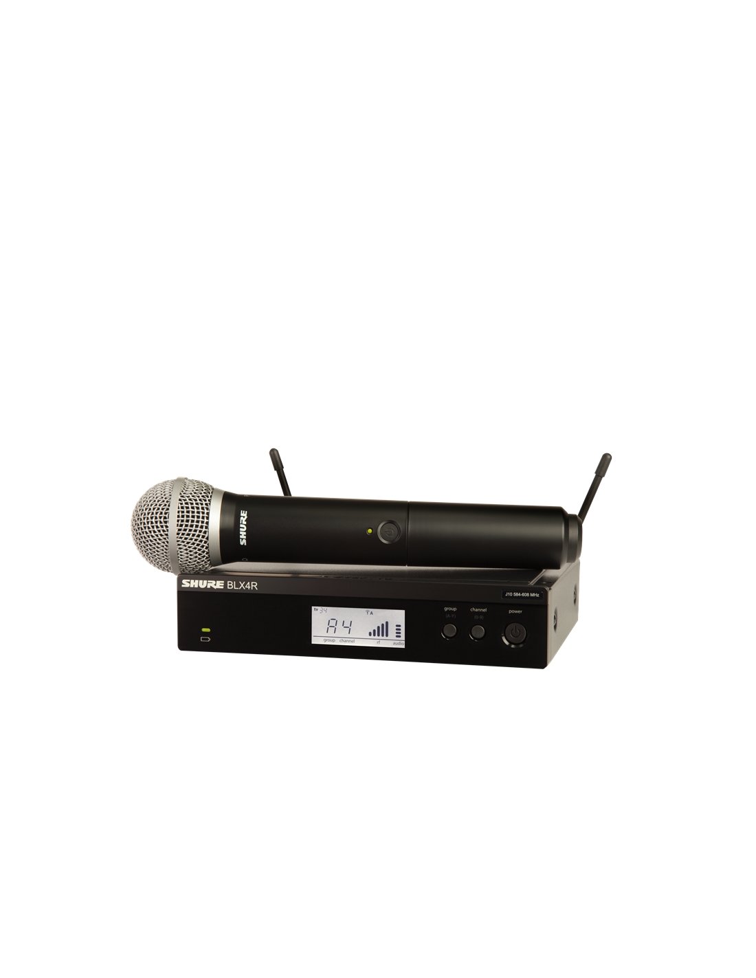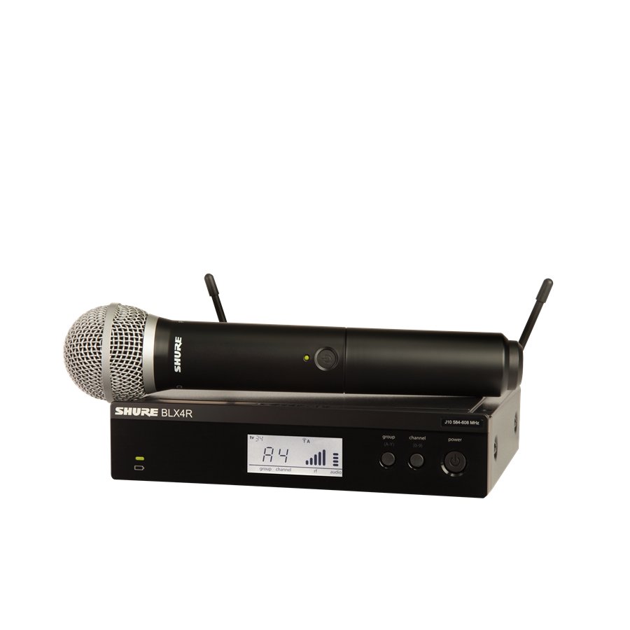 Système sans fil complet pour chanteurs et animateurs composé d'un récepteur BLX4RE avec kit de montage en rack simple/double, un émetteur sans fil BLX2 équipé d'une capsule dynamique cardioïde PG58 et d'une pince microphonique WA371. Plage de fréquences sans fil M17 : de 662 à 686 MHz.