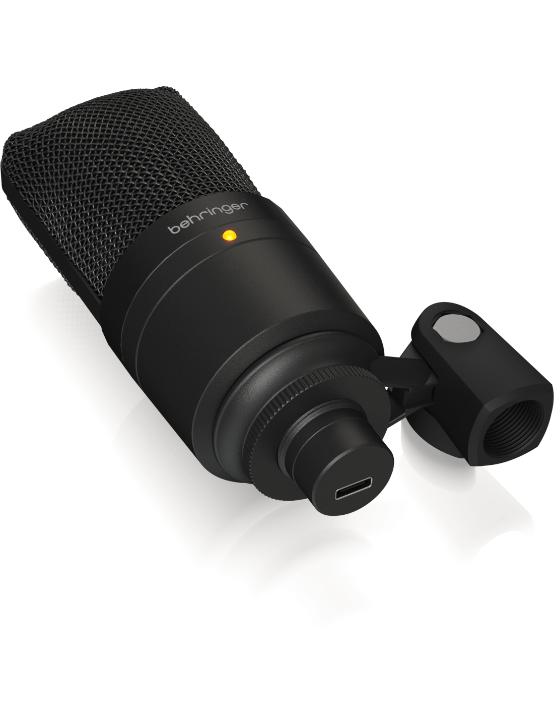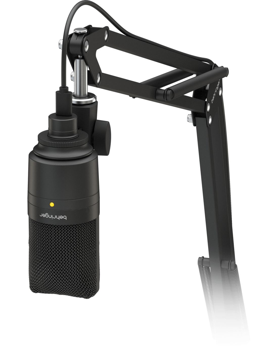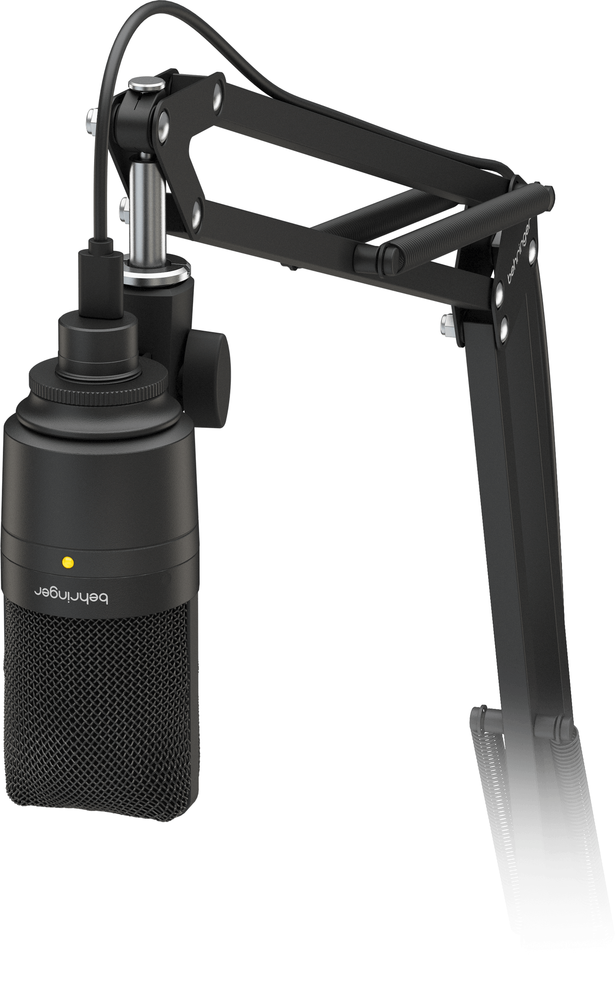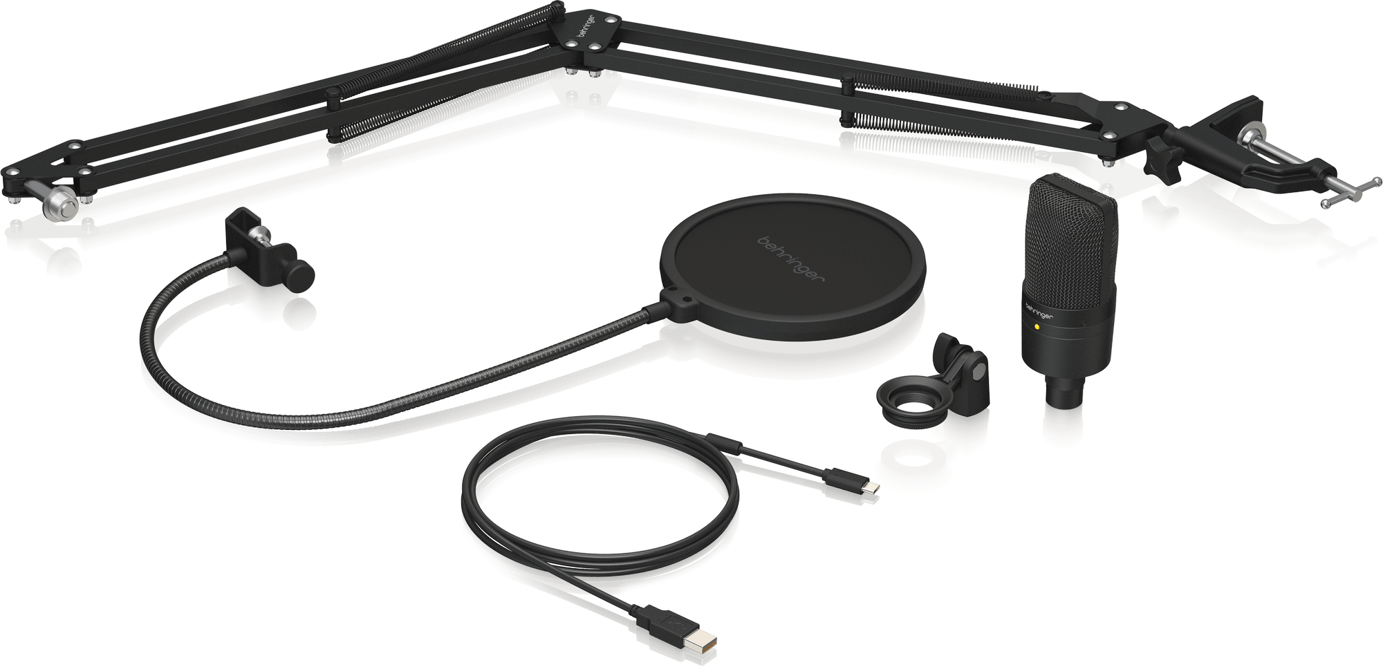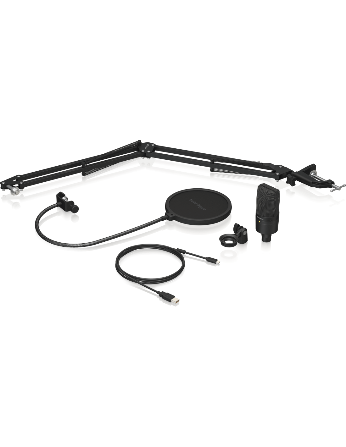 LE BUNDLE DE PODCAST BEHRINGER D3 est un bundle pour les enregistrements de podcast qui comprend un microphone à condensateur USB, un filtre anti-pop montable sur un bras avec un col de cygne articulé, un support de table avec bras articulé, un clip de fixation et un câble USB