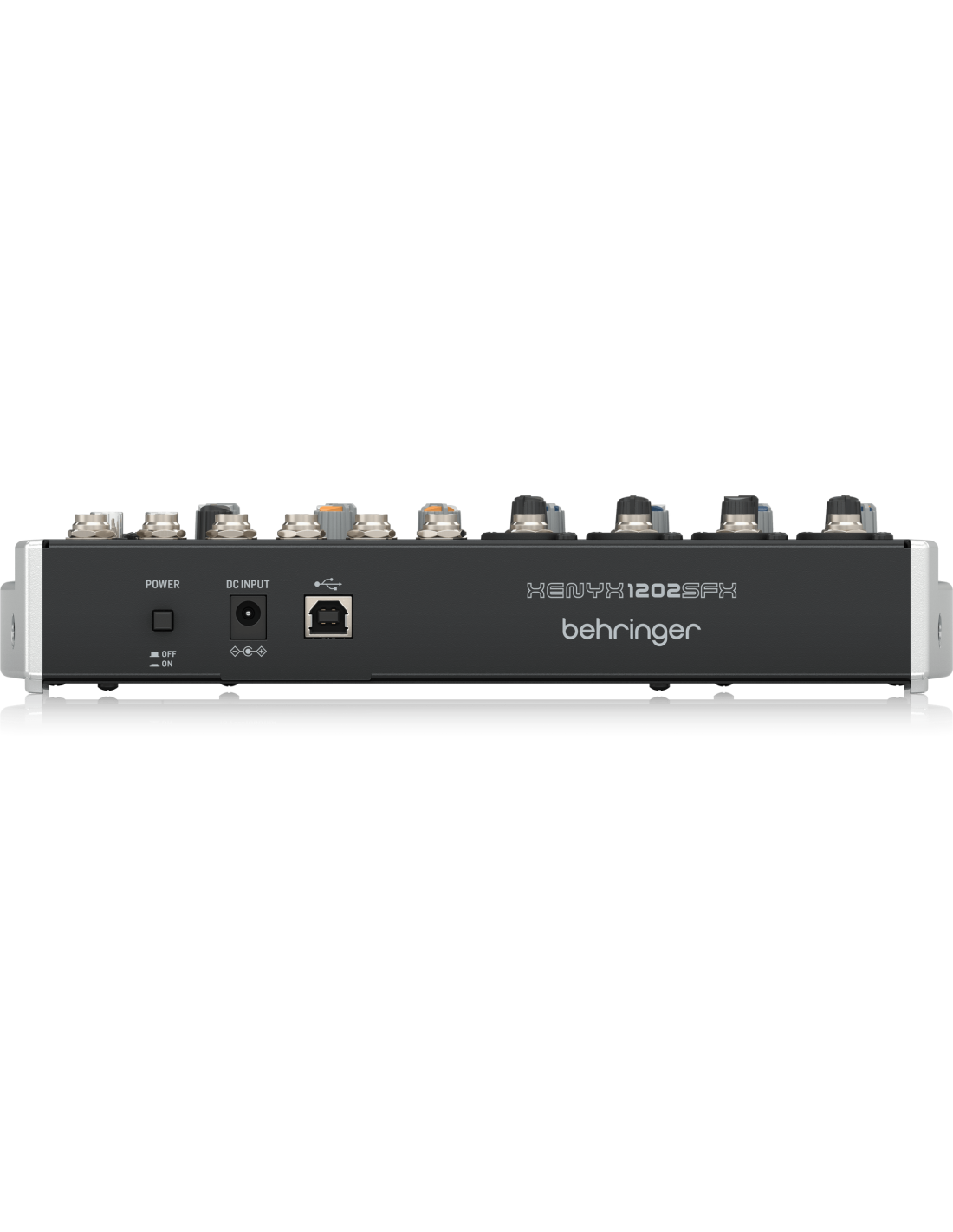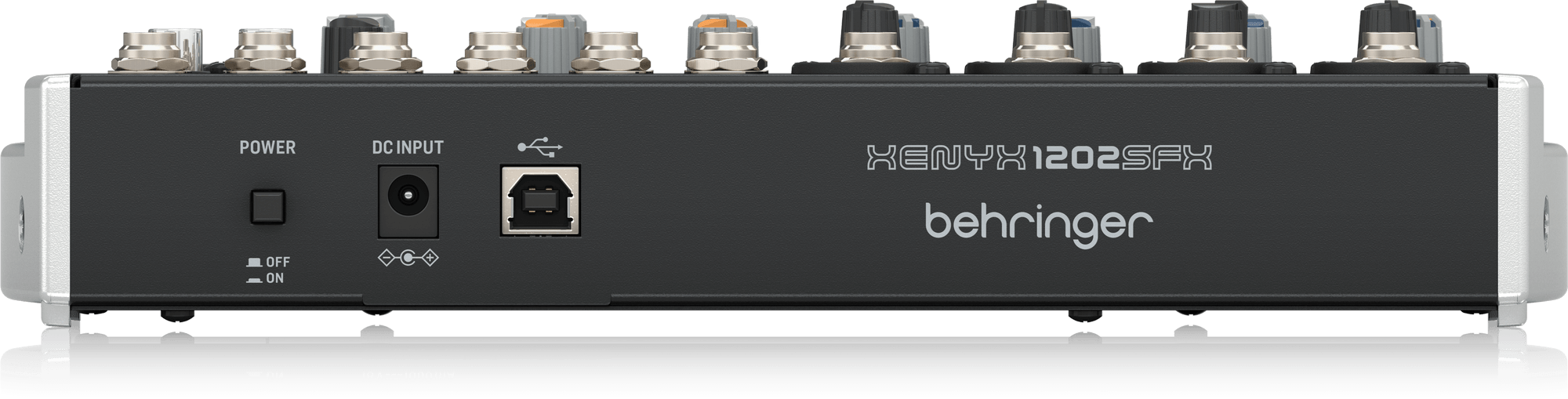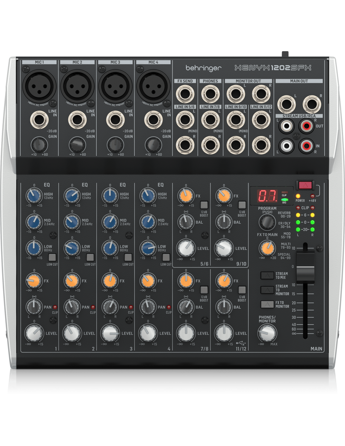 BEHRINGER XENYX 1202SFX. Mixeur analogique à 12 canaux avec interface audio USB intégrée. Les caractéristiques techniques incluent 4 canaux avec préamplis microphoniques Xenyx via entrée XLR, entrée ligne via Jack 6,3mm, contrôle Gain, égaliseur à 3 bandes, contrôle FX, Pan et Volume ; 4 canaux stéréo 5/6, 7/8, 9/10, 11/12 via entrées jack TRS 6,3mm, mono sur le côté L, contrôles Équilibre, FX et Volume. Il dispose également d'un processeur d'effets Klark Teknik avec 100 préréglages d'effets audio numériques, interface audio USB via le canal 11/12, indicateur LED à 4 niveaux avec indicateurs Clip, sorties Stream/Main sélectionnables et via TRS et RCA.