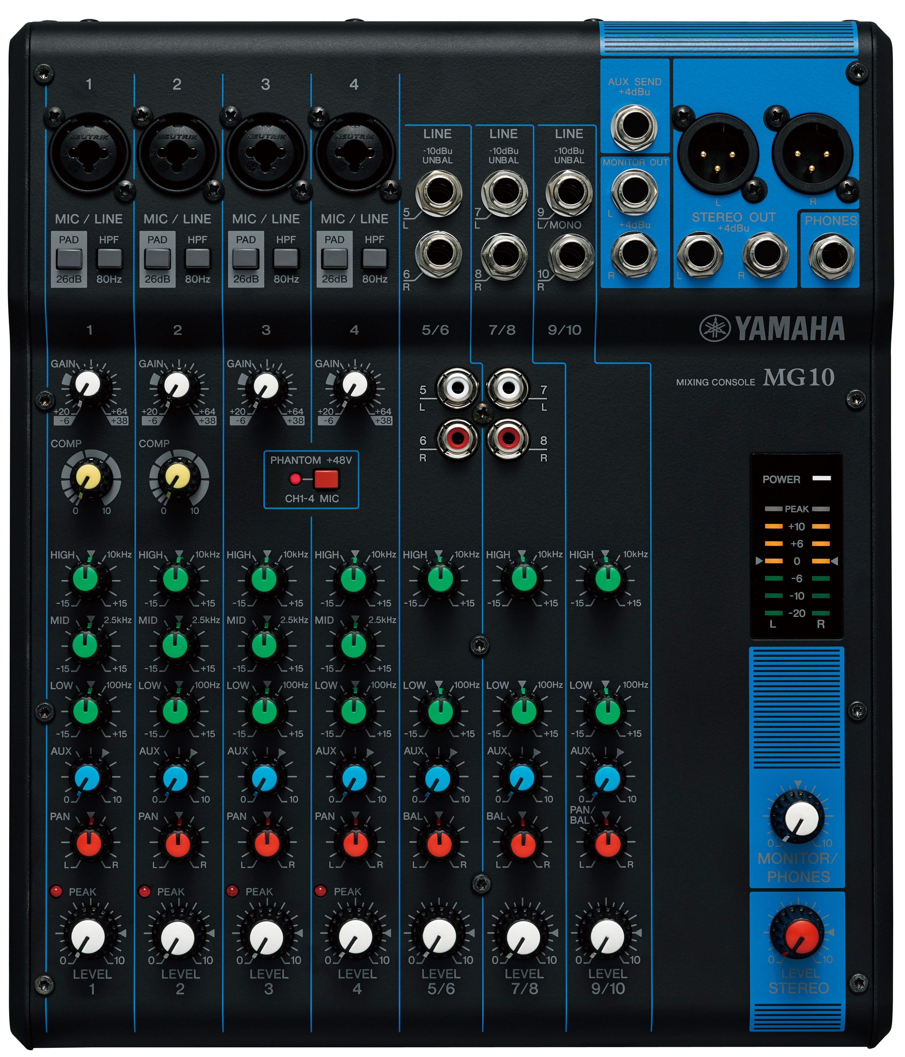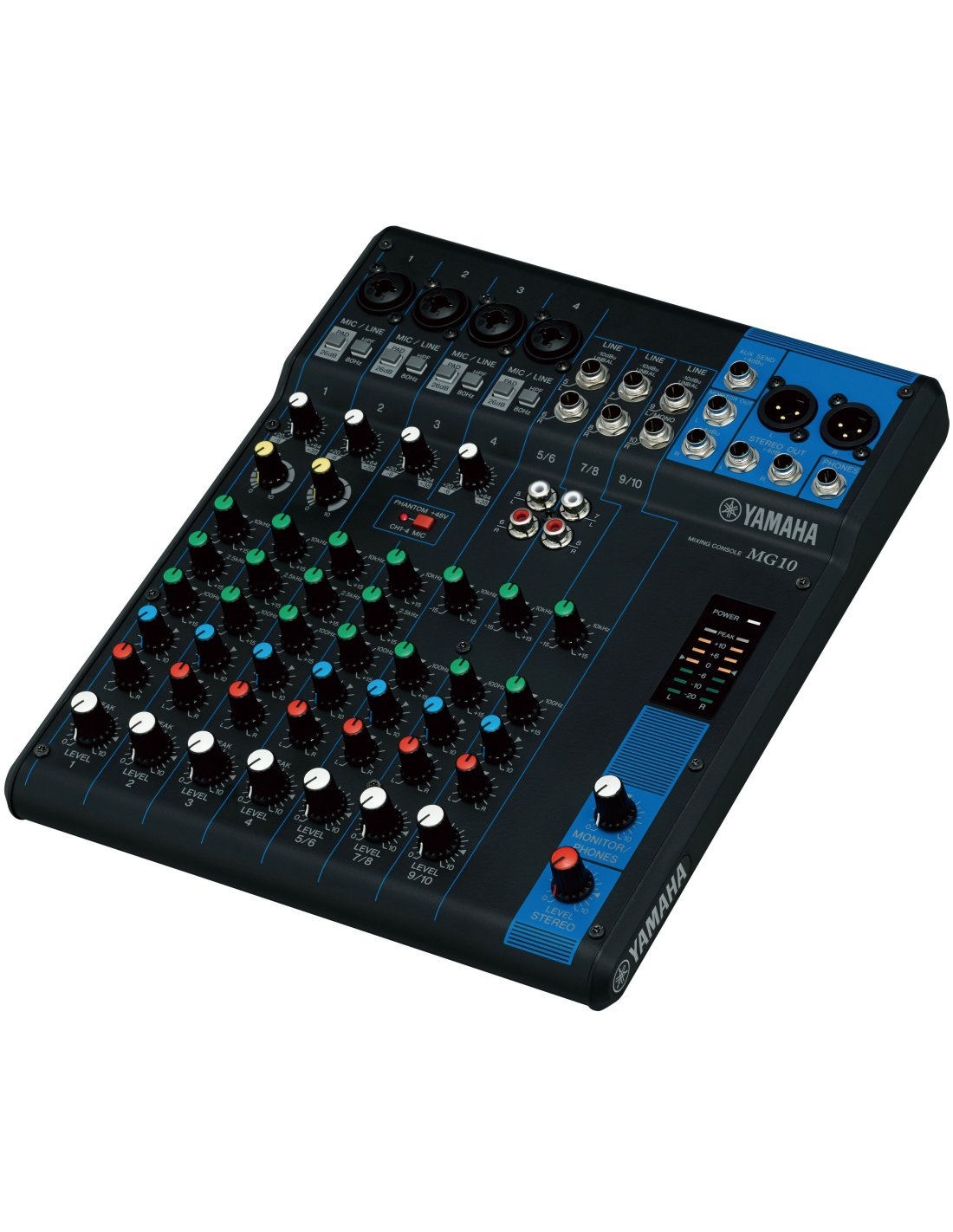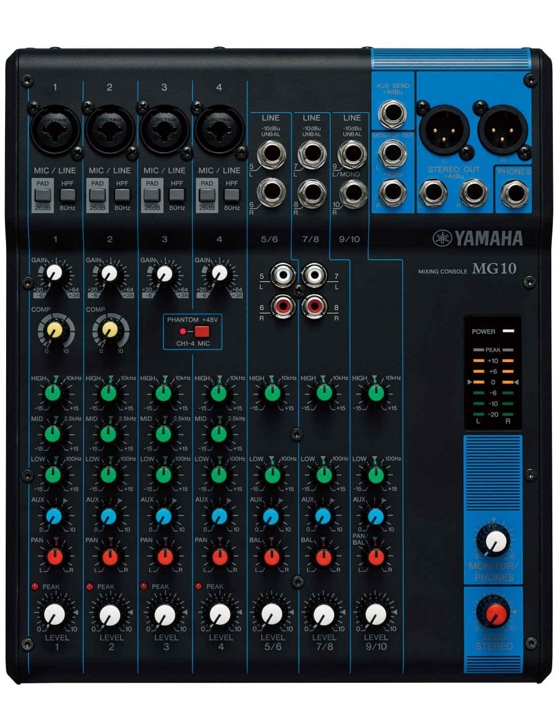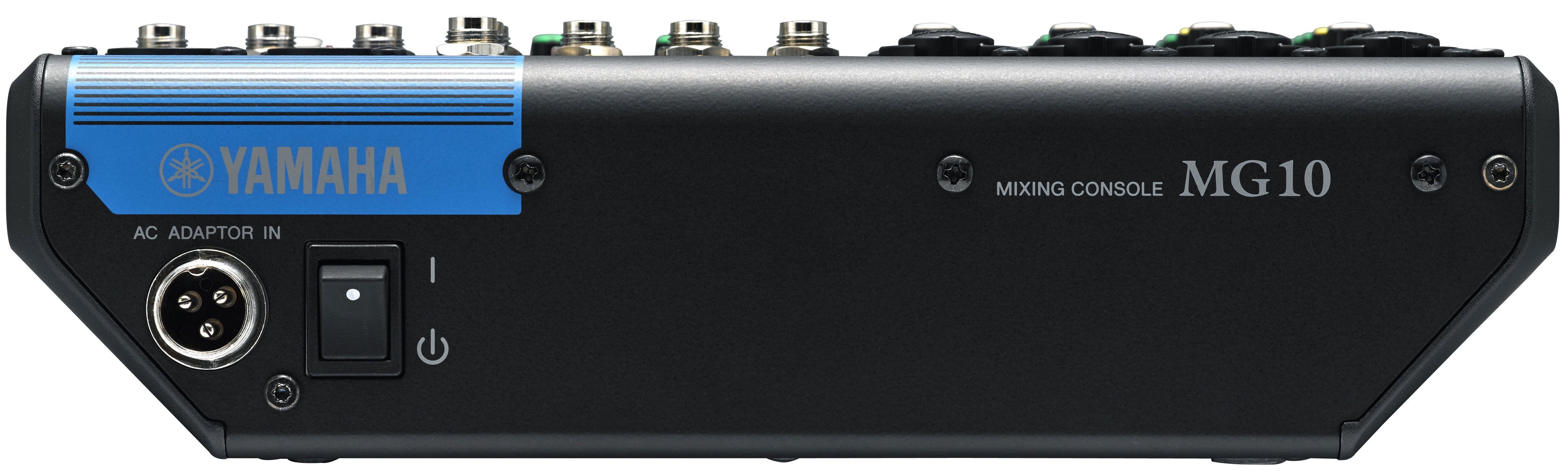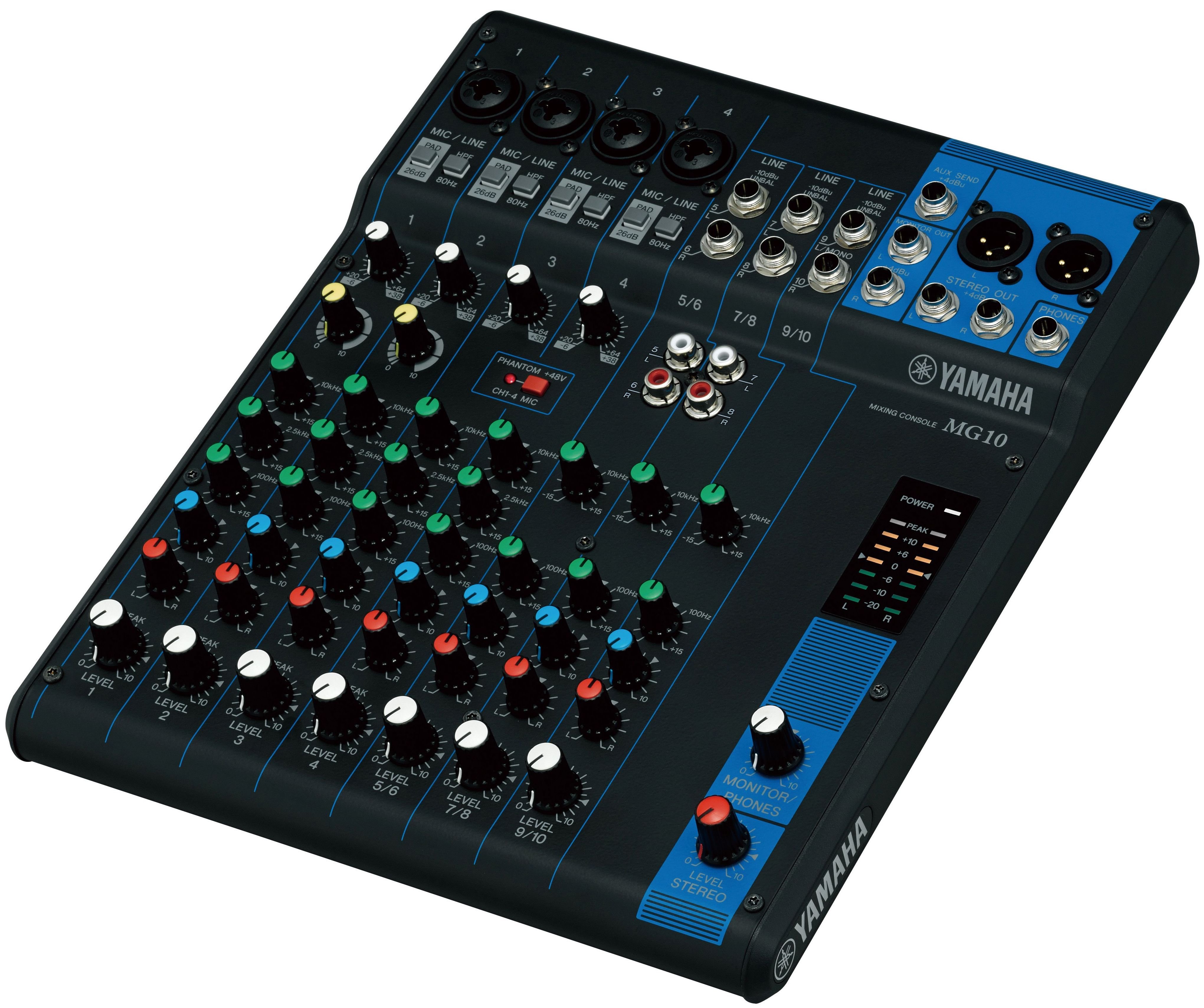 Le MG10 de Yamaha est une table de mixage analogique à 10 canaux avec 4 entrées micro/ligne mono avec LED de crête, 3 entrées ligne stéréo, 2 sorties stéréo, 1 sortie moniteur, 1 sortie casque, 1 envoi auxiliaire, préamplis micro “D-PRE” avec circuit Darlington inversé, interrupteur sur les entrées mono, sorties XLR équilibrées, EQ à 3 bandes, 2 indicateurs de niveau LED à 7 segments et alimentation fantôme 48V.