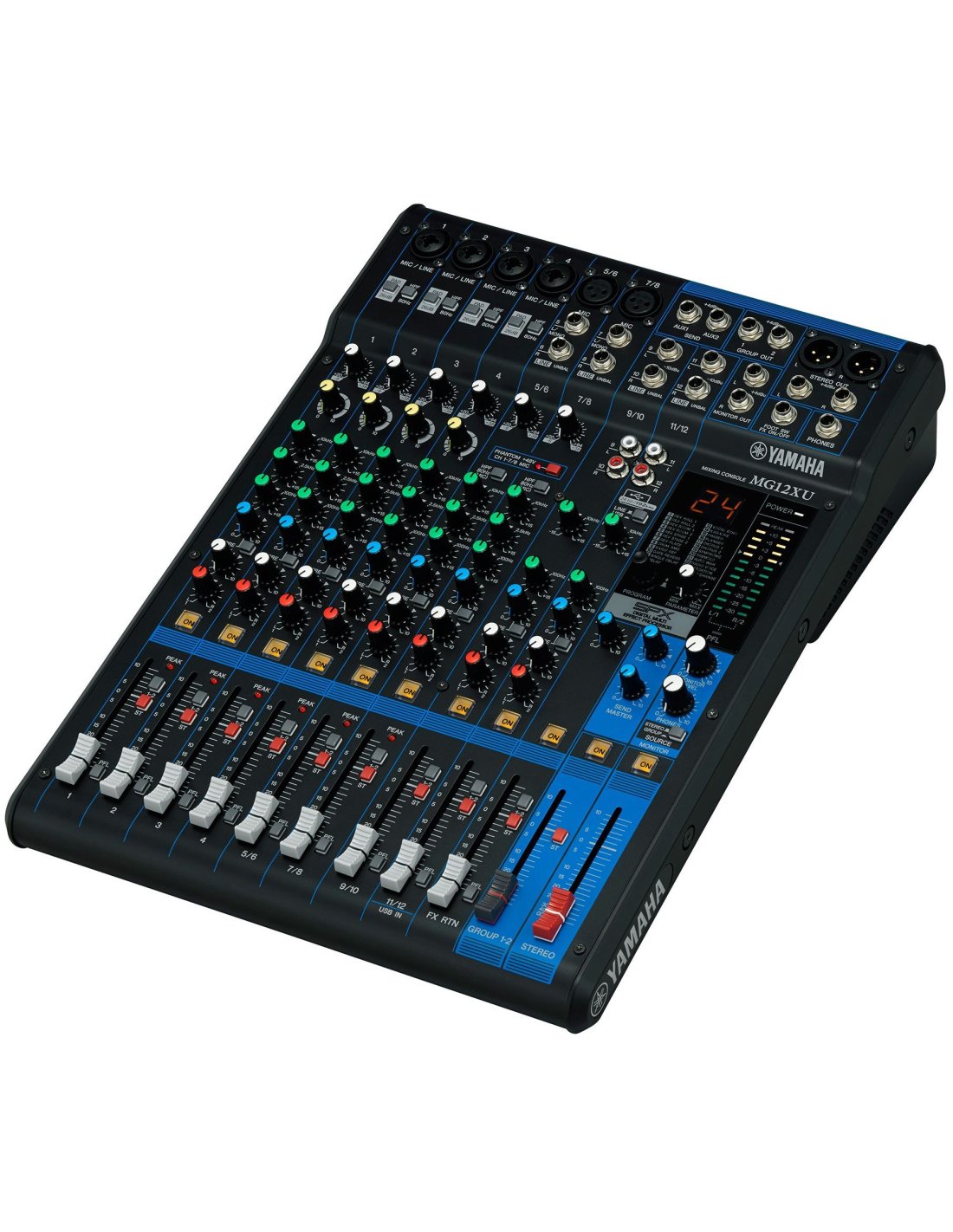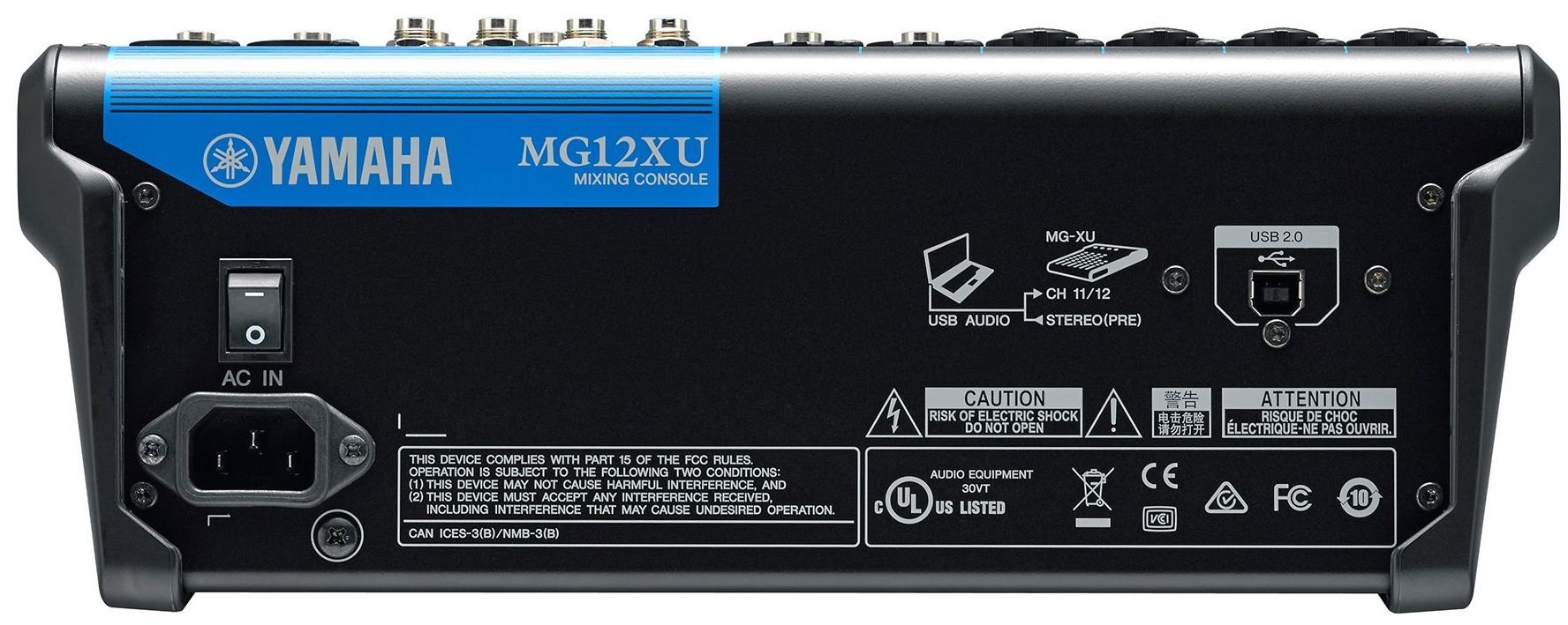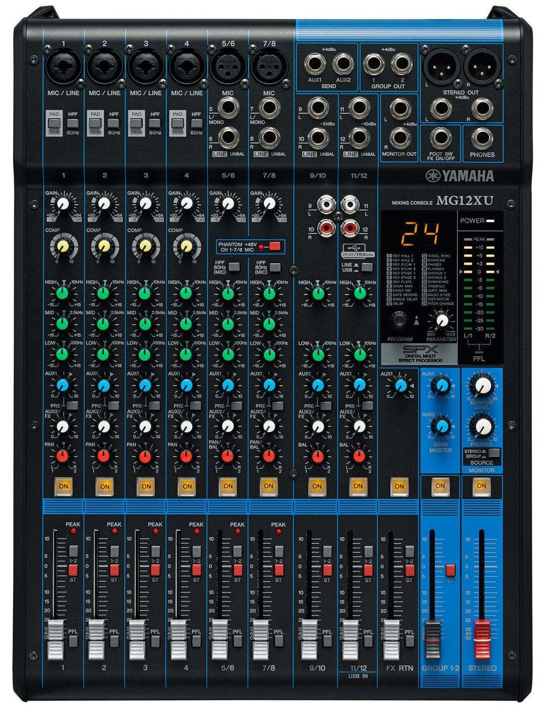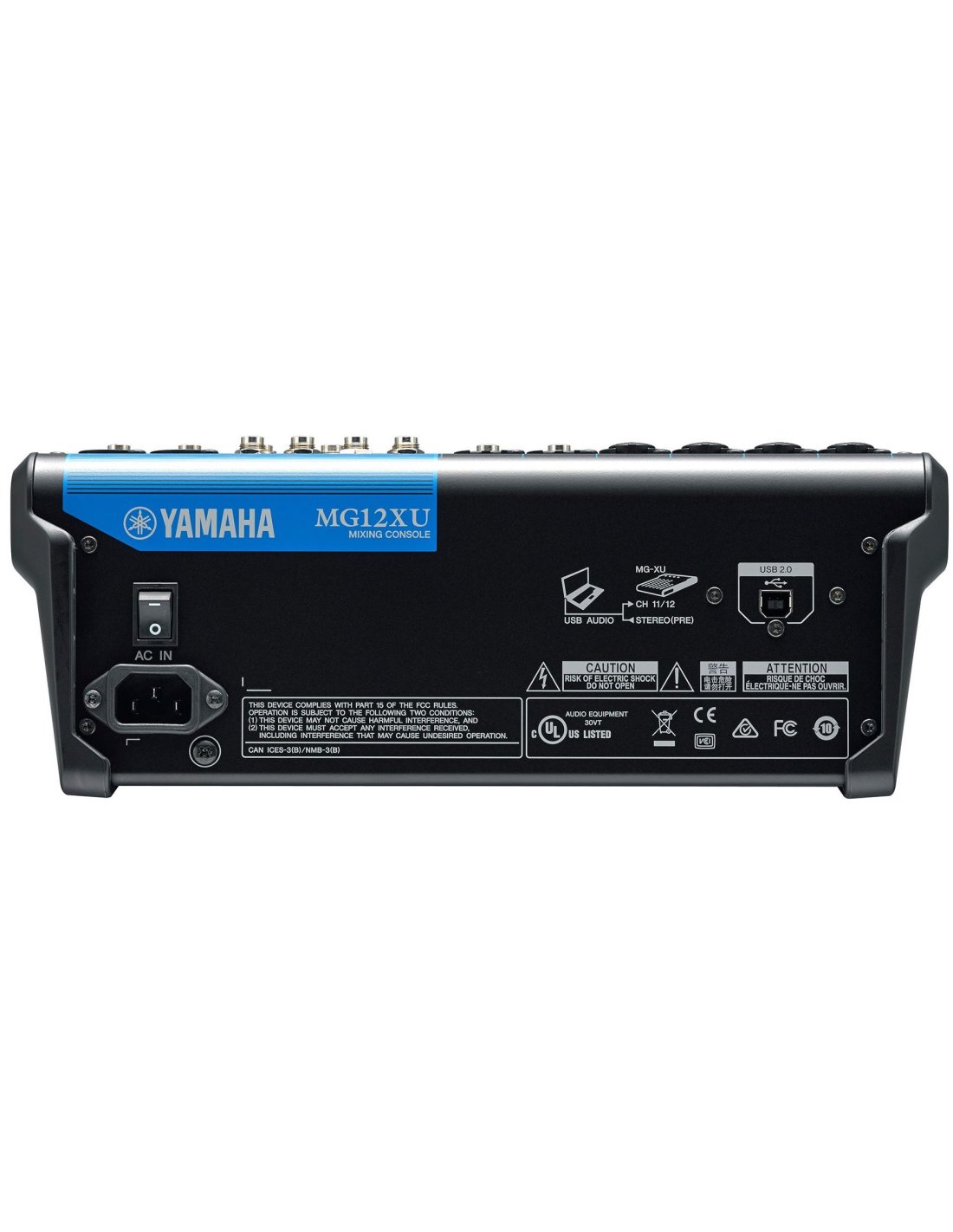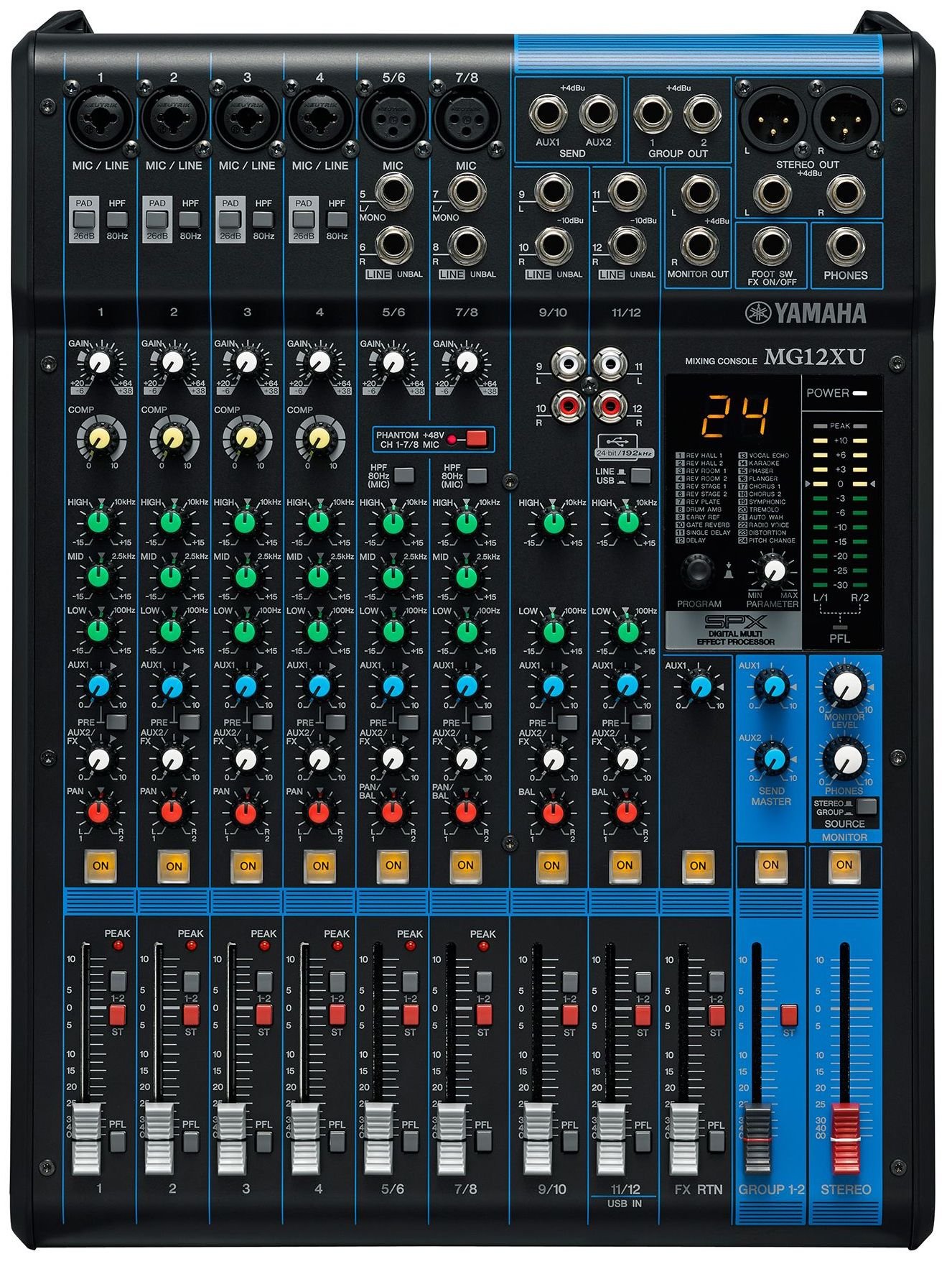 YAMAHA MG12XU. Mixeur USB à 12 canaux dont 4 canaux mono avec 4 préamplis micro D-PRE via des connecteurs combo XLR/TRS, sélecteur Mic/Line, pad 26Db, filtre passe-haut 80Hz, égaliseur à 3 bandes, compresseurs à bouton sur les 4 premiers canaux et contrôle de gain, 4 canaux stéréo dont les 2 premiers avec entrées Jack 6,3mm TRS et XLR et les 2 autres avec entrées Jack 6,3mm TRS et RCA avec contrôle du volume, égaliseur à 2 bandes, contrôle FX sur chaque canal, interface audio USB 24 bits/192kHz 2In/2Out, processeur multi-effets SPX avec 24 effets numériques sélectionnables. Présente une sortie équilibrée 4Dbu via XLR, sortie stéréo sur Jack TRS, sortie moniteur sur Jack TRS, envoi FX, sortie casque sur jack 6,3mm TRS avec contrôle du volume, alimentation fantôme +48.