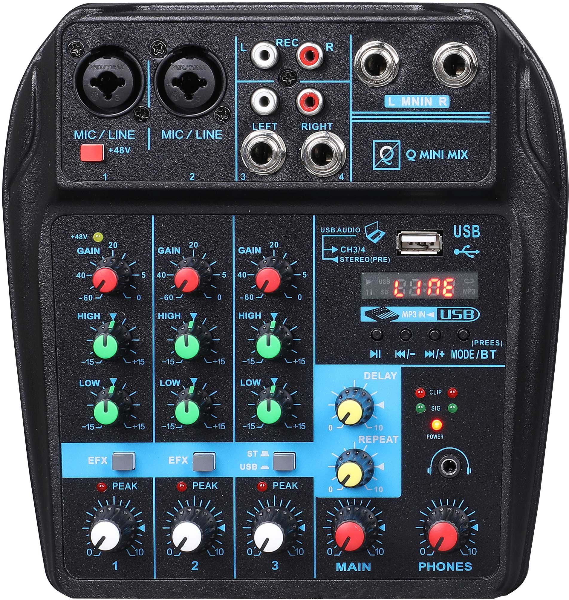 Mixeur 4 canaux avec lecteur MP3 USB/Bluetooth. (2 canaux mono + 1 stéréo). 2 entrées micro XLR. 2 entrées ligne. Préamplificateurs micro de haute qualité. Alimentation fantôme +48v Contrôle de gain et panoramique pour chaque canal. Égalisation à 2 bandes pour chaque canal. Sortie casque avec volume séparé. Effets DSP pour les canaux 1 et 2. 2 sorties stéréo jack ¼. Aux in et out RCA. Alimentation incluse.