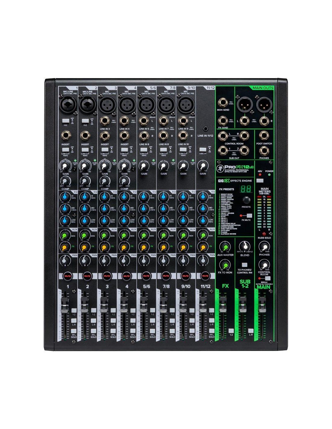 MACKIE PROFX12V3 MIXER Mixeur à 12 canaux avec interface d'enregistrement 24-Bit/192kHz, préamplificateurs micro Onyx via des entrées combo sur les 2 premiers canaux (mono) et XLR sur les 5 canaux restants, DSP GigFX avec 24 effets numériques, égaliseur à 4 bandes sur chaque canal, compresseurs à bouton unique sur les canaux mono, entrée stéréo via TRS. Il présente des sorties principales équilibrées en XLR et déséquilibrées TRS.