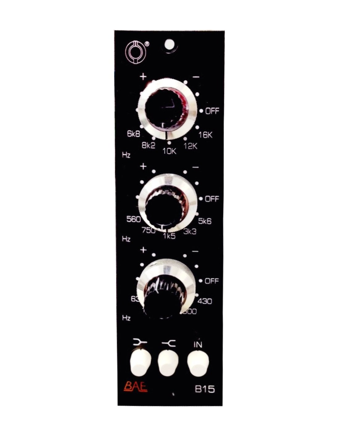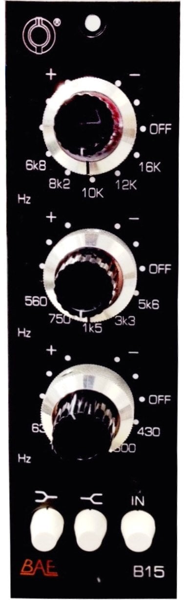 Le BAE B15 est un égaliseur à 3 bandes dans lequel il est possible de sélectionner 5 fréquences par bande ; l'unité est dotée d'un boost de +16 dB et de filtres de coupure et se caractérise par un bruit de fond très faible.