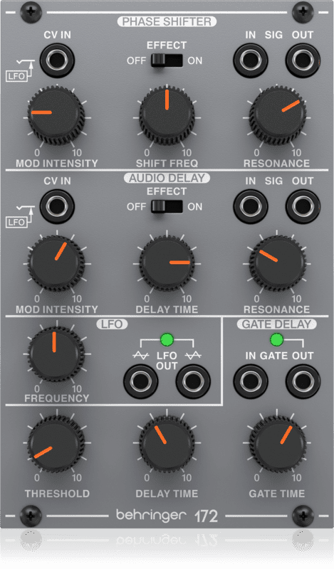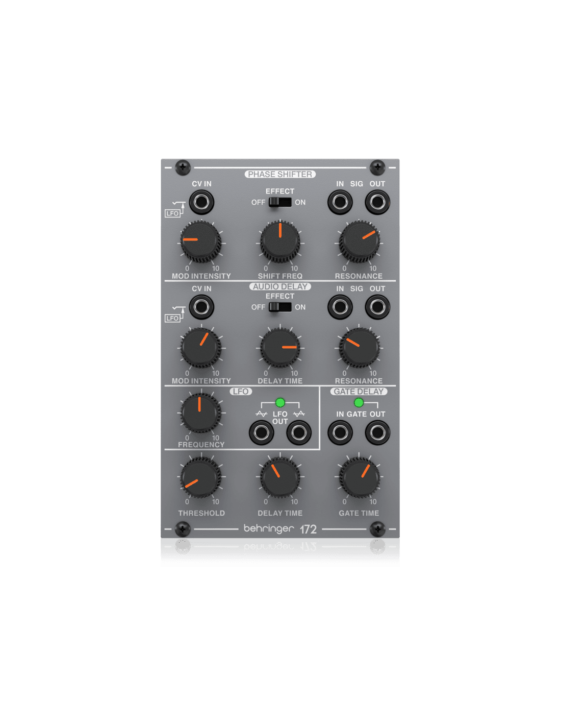 BEHRINGER 172 PHASE SHIFTER/DELAY/LFO. Module analogique Phase shifter, Delay et LFO pour Eurorack. La section Phase shifter dispose d'un changement de phase à 6 étapes réglable et modifiable via un contrôle d'intensité de la modulation, fréquence de shift et contrôle de résonance, plus une entrée CV, un interrupteur ON/OFF de l'effet et des entrées/sorties du signal. Le delay Bucket-Brigade présente un contrôle d'intensité de modulation, un temps de Delay, un contrôle de résonance avec entrée CV, un interrupteur ON/OFF de l'effet et des entrées/sorties du signal. La section Gate Delay avec entrées et sorties dédiées présente un contrôle du seuil, un temps de Delay et un contrôle du temps de Gate. L'LFO a un contrôle de fréquence dédié et des sorties TRS avec des fréquences d'onde normales ou inversées.