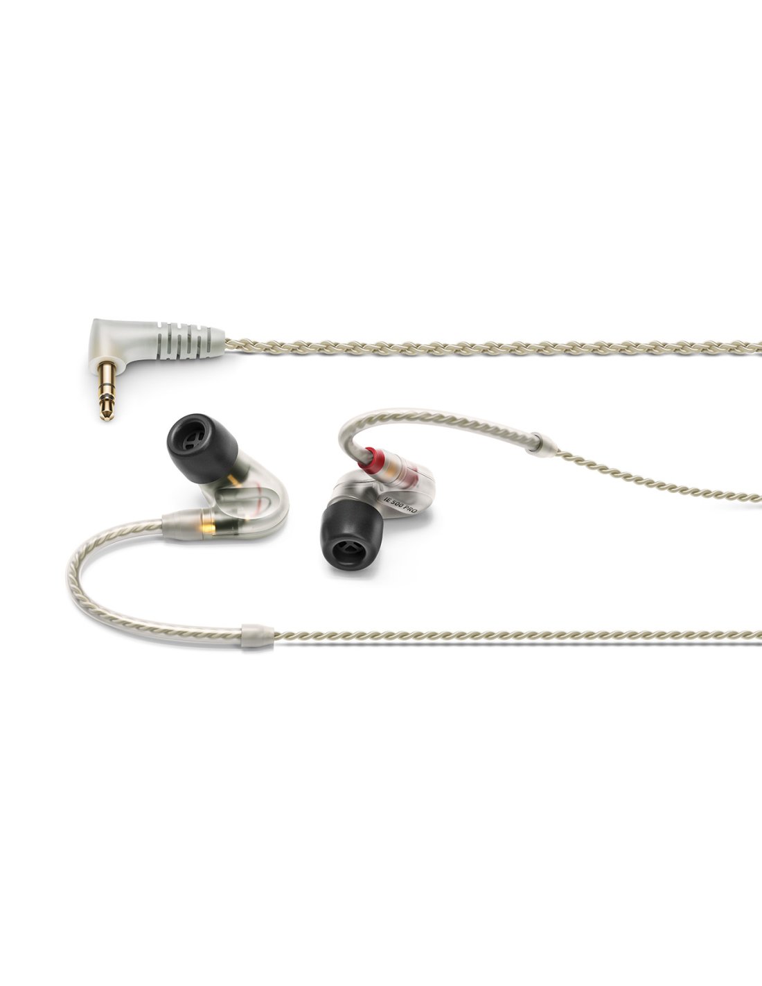 SENNHEISER IE500 PRO CLEAR Écouteurs in-ear de monitoring transparents en silicone. Les caractéristiques techniques incluent un driver dynamique à large bande de 7 mm avec la technologie "True resolution", une impédance nominale de 16 Ohm. Comprend 3 ensembles d'adaptateurs auriculaires en silicone (S,M,L), 3 adaptateurs en mousse, un câble détachable spécial torsadé de 1,3 m, un étui et des outils de nettoyage.