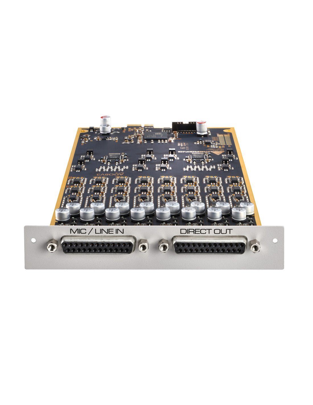 Hapi MkII/MkIII 8 channel Mic/Line Dual Gain A/D card with Direct Out, up to 192 kHz 8 x exceptionally transparent, Swiss designed pre-amplifiers; Remote/Local switch; Remote control for all parameters; Phantom Power/Polarity/Low Cut/Impedance switchable per channel; Allows Mic splitting variants; 137dB Dynamic range on the Mic inputs and 139 dB on the Line inputs. (Merging Product Code: N/A)