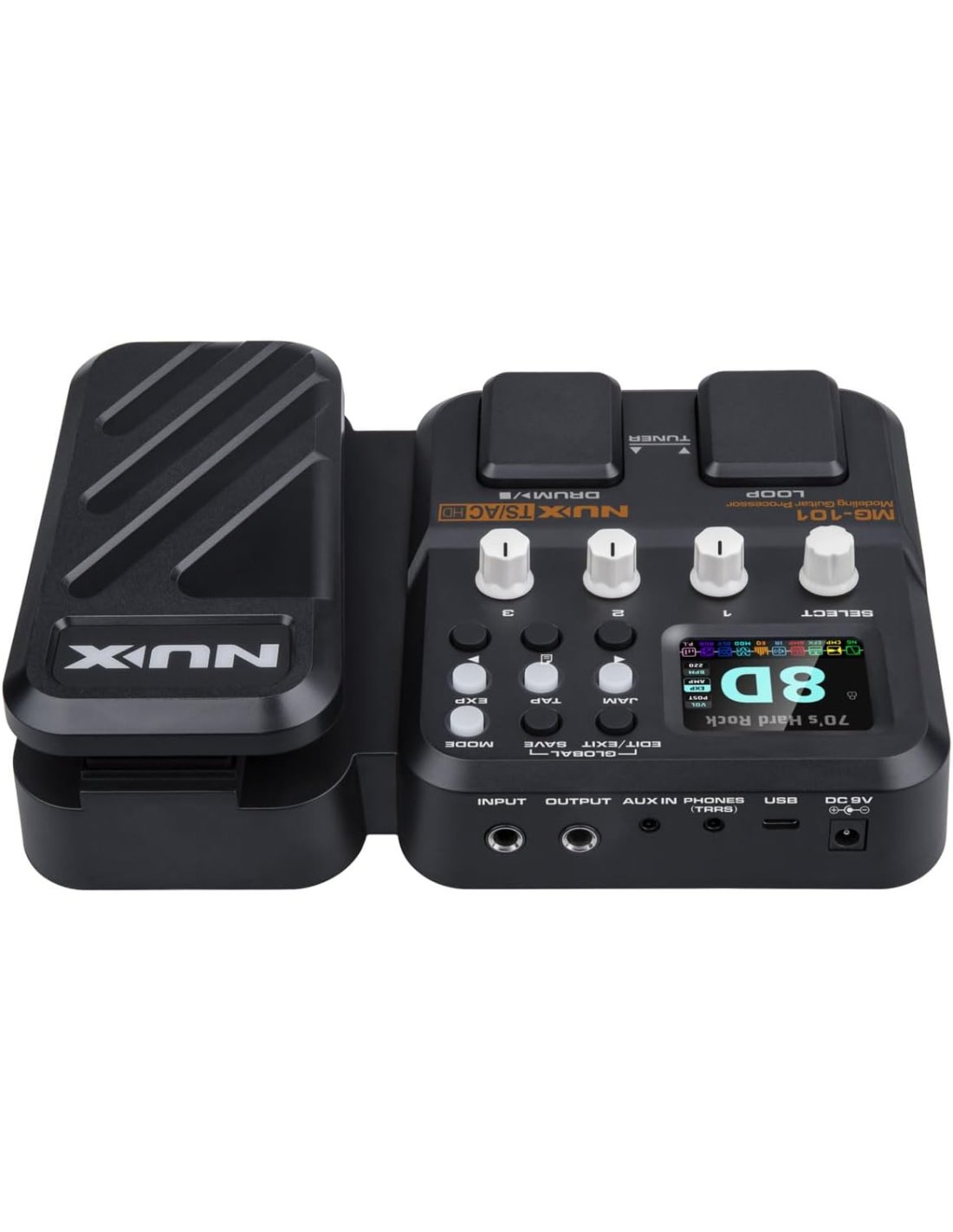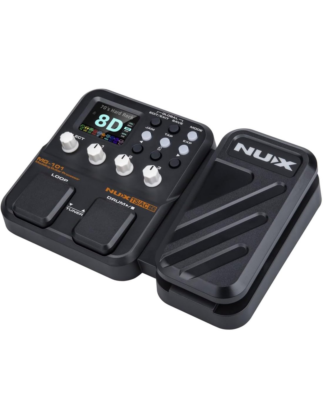 NUX MG-101 est une pédale multi-effets pour guitare avec modélisateur d'amplificateurs et processeur d'effets numériques. Les caractéristiques techniques incluent un écran LCD couleur de 2,4" avec une interface intuitive, un algorithme White-box Amp Modeling & Pre-efx (TSAC-HD), 25 modèles d'amplificateurs pour guitare, une résolution IR de 512 échantillons et un slot USER pour chaque patch avec 12 slots supplémentaires IR COLLECTION, 10 blocs de signal indépendants : NG, CMP, EFX, AMP, IR, EQ, MOD, DLY, RVB, P.L, interface audio USB permettant également la mise à jour du firmware et l'utilisation du logiciel de modification QuickTone, Looper avec machine à rythmes à détection automatique du tempo, fréquence d'échantillonnage à 48kHz/32 bits. Inclut un adaptateur secteur 9 V DC.