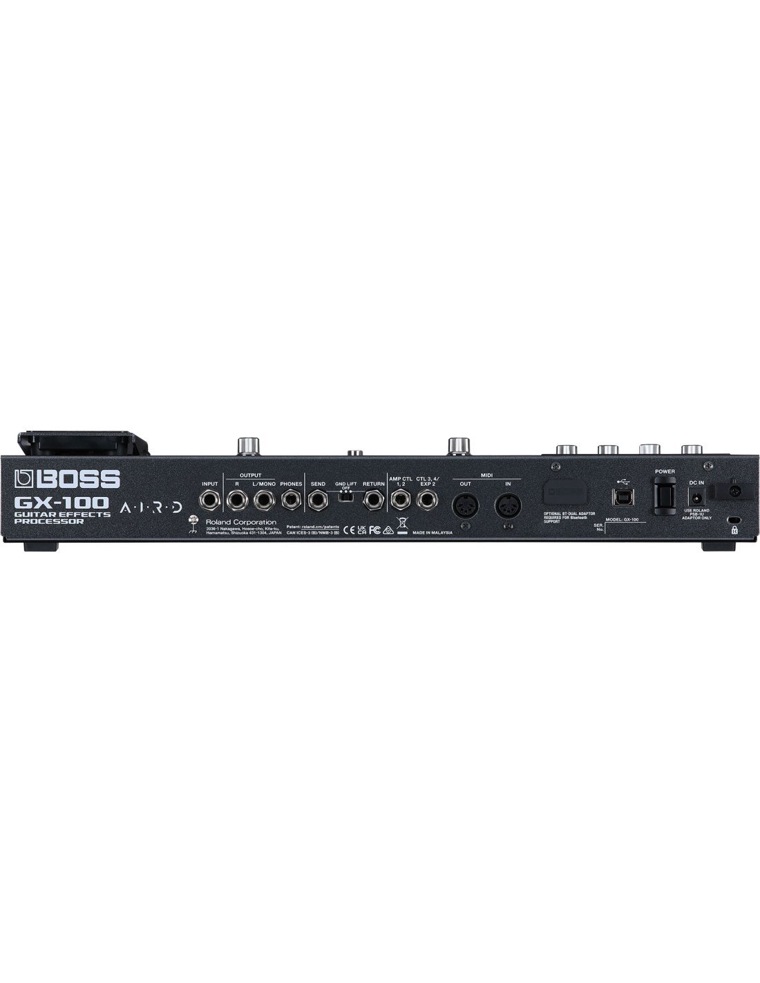 Le GX-100 est un processeur d'effets à pédale pour guitare de Boss. Il est équipé de plus de 150 effets et de 23 émulations d'amplificateurs, d'un écran tactile couleur, de 8 interrupteurs à pédale personnalisables, d'une pédale d'expression, d'une interface audio USB, de boucles d'effets et de prises MIDI I/O.