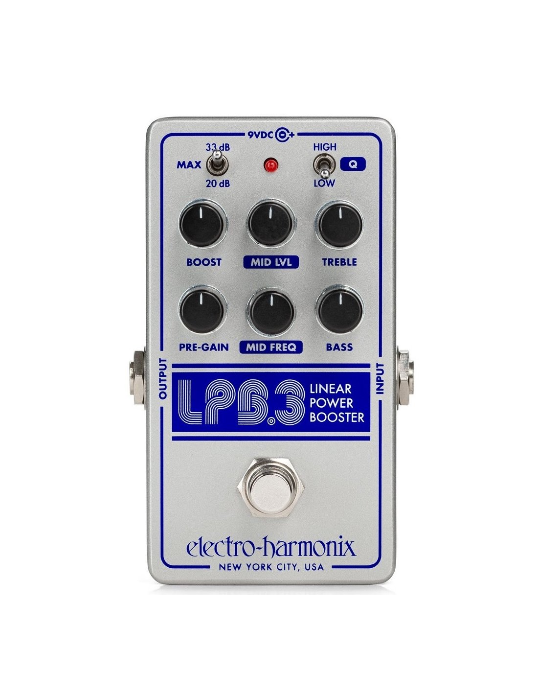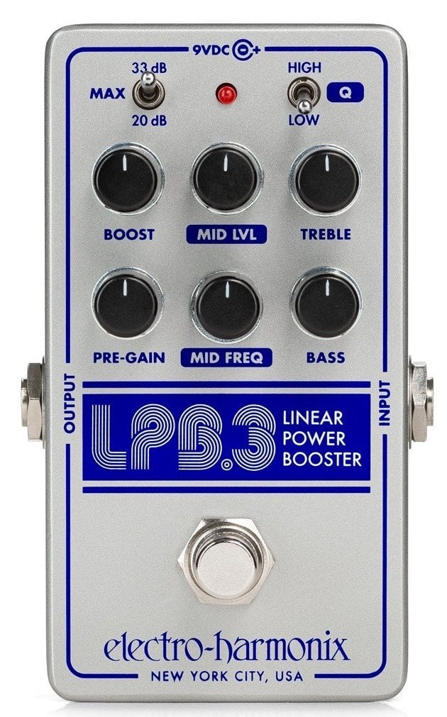 ELECTRO HARMONIX LPB3 LINEAR POWER BOOSTER est un effet de Booster et égaliseur pour guitare avec contrôle Parametric Mids, pour 33dB de puissance de boost. Les caractéristiques techniques incluent, Eq à 3 bandes avec Bass, Treble et contrôle paramétrique des médiums sur 2 encodeurs pour Mid Level et Mid Freq, circuit analogique avec commutation Buffered/True Bypass sélectionnable, contrôle Boost pour l'augmentation du signal et Pre-Gain pour peaufiner le gain total et le volume du boost, interrupteur Max pour sélectionner le seuil maximum de Boost entre 20/33 dB, interrupteur Q pour le réglage du filtre High/Low. Inclut un adaptateur 9,6V CC-200mA