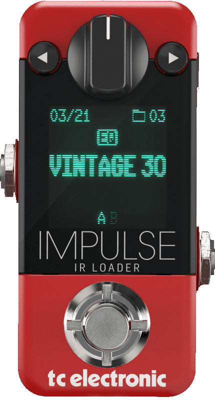 TC ELECTRONIC IMPULSE IR LOADER. Pédale simulateur de cabinet et chargeur IR pour guitare. Les caractéristiques techniques incluent 25 IR intégrés et 74 emplacements de mémoire, USB pour charger les presets via PC ou Mac, 12 simulateurs de haut-parleurs Celestion, mode A/B pour alterner 2 IR via Footswitch, True bypass.