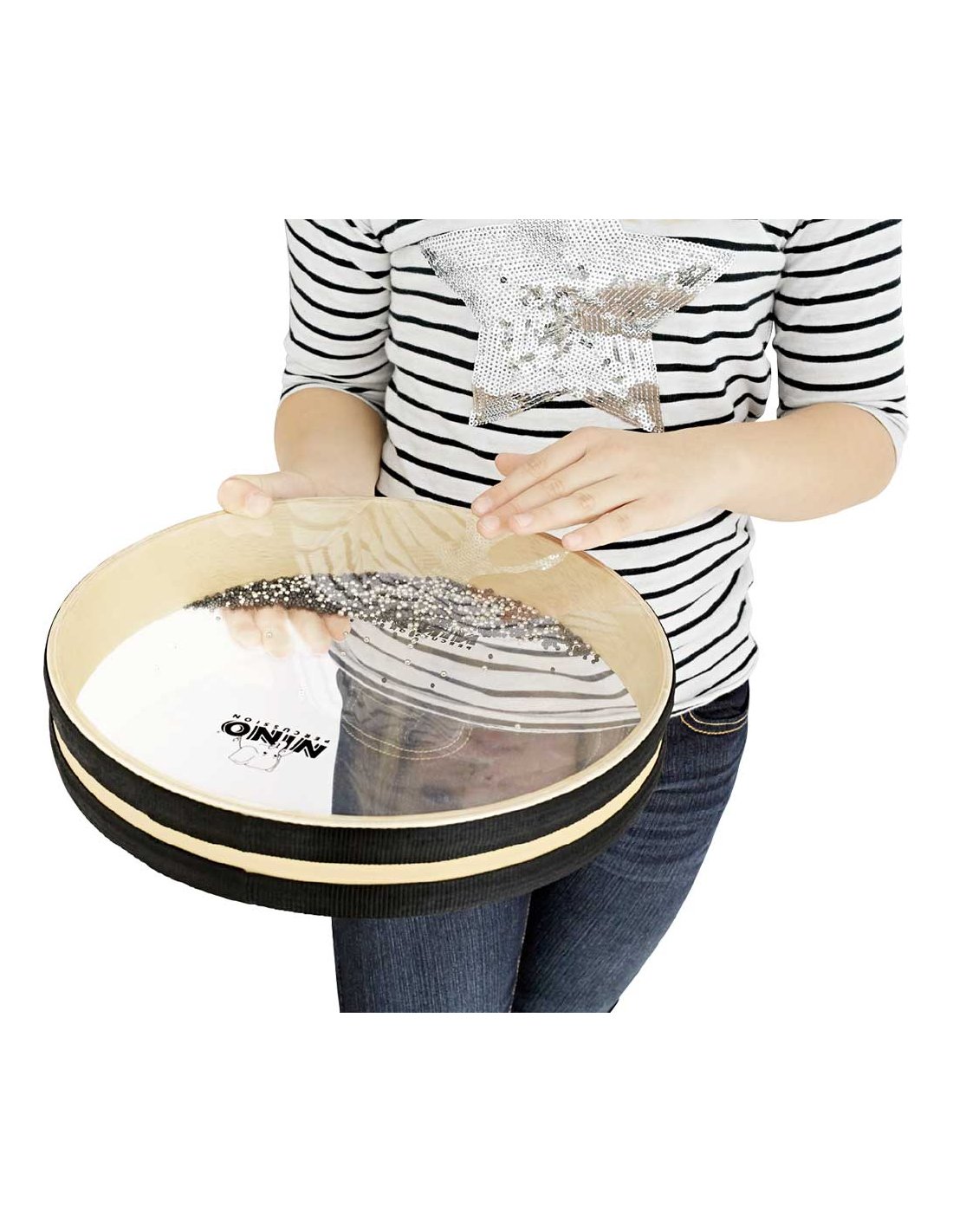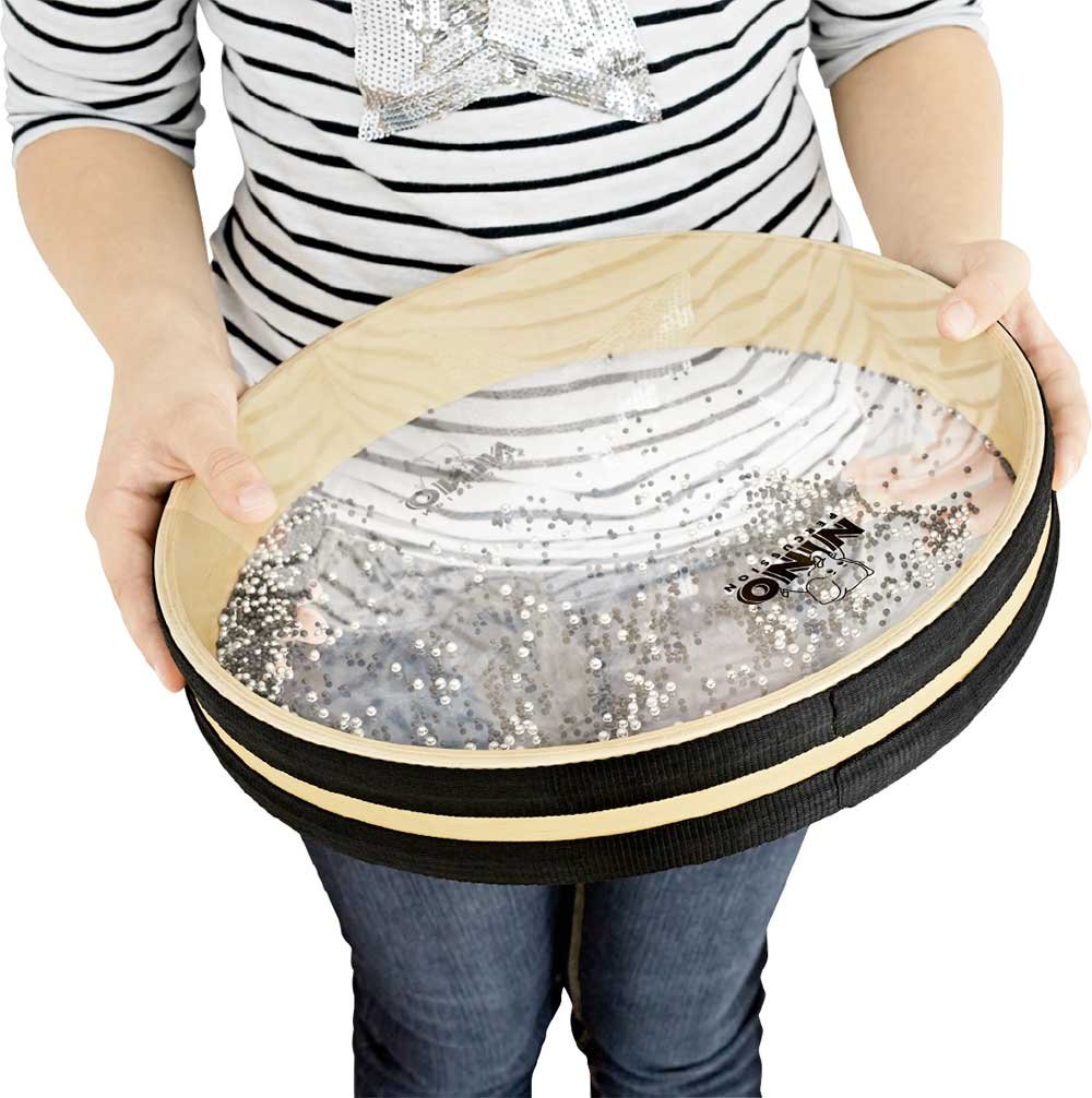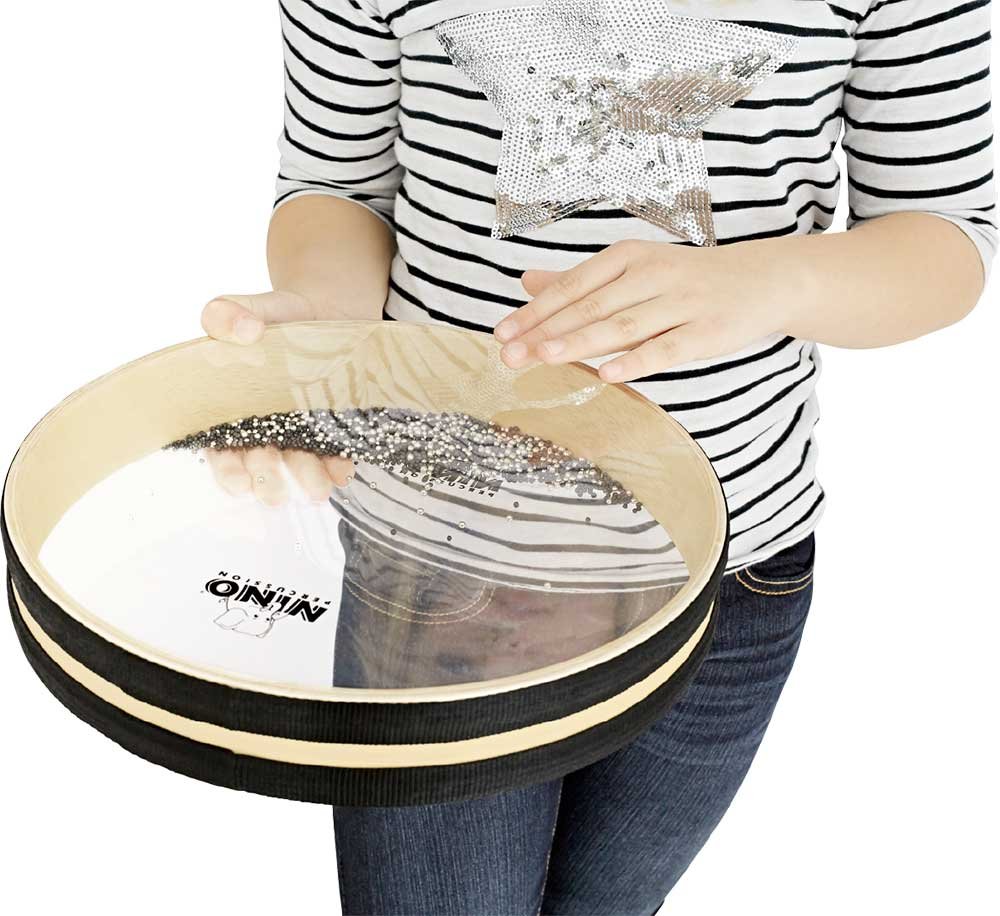 Le tambour océanique Nino de 12’’ possède des centaines de petites billes en métal enfermées entre deux membranes en cuir synthétique transparent. En déplaçant le tambour horizontalement et en le faisant tourner doucement, on recrée le son des vagues de l'océan.