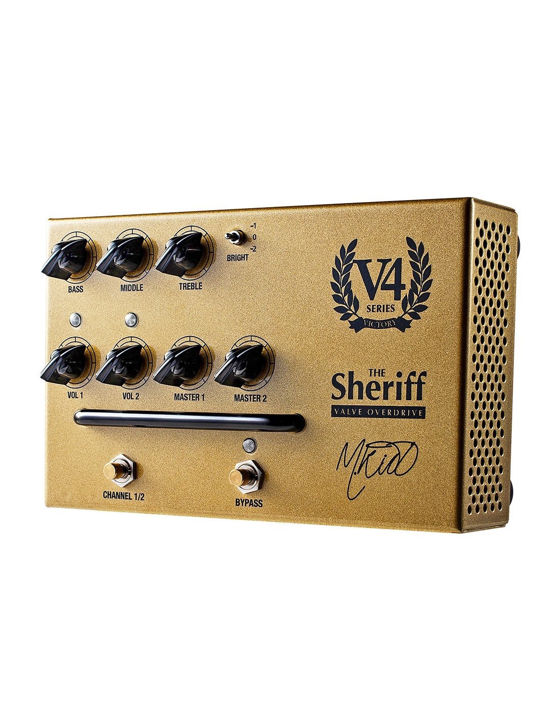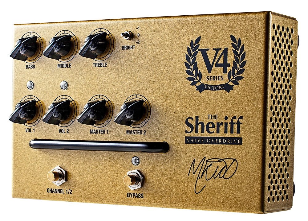 Pédale pour Guitare Électrique Pédale Victory V4 Countess. La Pédale Victory V4 Countess est un préamplificateur à lampes à pédale pour guitare électrique basé sur le Sheriff 22 et le Sheriff 44. Elle est équipée de 1 lampe EC900, 3 lampes CV4014, 2 canaux, contrôles Vol 1, Vol 2, Master 1, Master 2, Bass, Medium, Treble, interrupteur Bright (-1/0/-2).