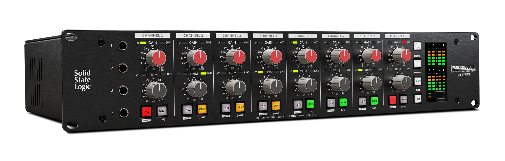 Preamplificateur PureDrive 8 Canaux avec USB-C et AES/EBU Solid State Logic PureDrive OctoPURE DRIVE OCTO exploite la technologie renommée du préamplificateur microphonique SuperAnalogue PureDrive™, déjà présente dans la console ORIGIN de Solid State Logic, introduit un nouveau mode DRIVE et une nouvelle connectivité, et la rend disponible dans une unité rackmount 2U à 4 canaux. Le célèbre préamplificateur microphonique PureDrive™, introduit dans la plus récente console d'enregistrement de SSL, ORIGIN, est la base sur laquelle repose PURE DRIVE OCTO. Ce préamplificateur innovant préserve la clarté et la puissance typiques de SSL, tout en offrant la possibilité de moduler son timbre en un son chaud, riche en harmoniques et contrôlé, dont le caractère évolue avec l'augmentation du gain. La combinaison d'ORIGIN et du préamplificateur microphonique PureDrive™ est devenue un choix incontournable dans les studios d'enregistrement les plus prestigieux du monde. Que ce soit pour enregistrer les nuances les plus délicates d'un concert de piano en mode PURE ou pour ajouter de la chaleur à un enregistrement de batterie réglé sur DRIVE, le préamplificateur microphonique PureDrive™ est un compagnon essentiel grâce à sa flexibilité et à sa signature sonore exceptionnelle. PURE DRIVE OCTO poursuit sur cette lancée, offrant quatre préamplificateurs microphoniques avec les modes renommés PURE et DRIVE d'ORIGIN, mais va plus loin en introduisant une nouvelle option de DRIVE "Asymétrique", une connectivité numérique avancée et une interface USB intégrée. PURE DRIVE OCTO offre quatre options d'impédance différentes pour les entrées du préamplificateur microphonique, permettant aux ingénieurs du son d'explorer diverses nuances timbrales ou d'associer l'impédance du préamplificateur au microphone utilisé. De plus, chaque préamplificateur microphonique est équipé d'une alimentation fantôme +48V indépendante, d'une inversion de polarité et d'un filtre passe-haut réglable. Avec ces caractéristiques, PURE DRIVE OCTO émerge comme l'un des préamplificateurs microphoniques externes les plus avancés et polyvalents disponibles, ouvrant la voie à de nouvelles possibilités sonores et flux de travail pour les producteurs et ingénieurs du son les plus exigeants. Trois nuances sonores, un PREPURE DRIVE OCTO est la preuve tangible de l'engagement de SSL dans la conception de circuits analogiques à la pointe de la technologie. Dans le parcours du signal de PURE DRIVE OCTO, il n'y a pas recours à des composants électromécaniques tels que des potentiomètres, des interrupteurs mécaniques ou des relais, augmentant ainsi la durabilité du produit et garantissant une correspondance impeccable entre tous les canaux, non seulement entre les paires stéréo. L'utilisation de circuits analogiques contrôlés numériquement, gérés via des potentiomètres et des interrupteurs électroniques, simplifie considérablement le rappel des réglages et en améliore la précision. Chacun des préamplificateurs microphoniques de PURE DRIVE OCTO peut être commuté indépendamment entre trois modes DRIVE différents : Clean, Classic Drive et Asymmetric Drive. Le mode Clean présente le préamplificateur linéaire SSL renommé avec un niveau de bruit de fond extrêmement bas, connu pour sa capacité à capturer fidèlement le son source avec une clarté exceptionnelle. Le mode Classic Drive est le mode symétrique qui génère principalement des harmoniques impaires, offrant le son bien connu présent sur la console ORIGIN. Le mode Asymmetric Drive présente une nouvelle option de coloration spécialement conçue pour la gamme PURE DRIVE, qui accentue les harmoniques paires, conférant plus d'épaisseur, de couleur et de douceur aux transitoires. Connectivité avancée La connectivité avancée de PURE DRIVE OCTO ouvre de nombreuses possibilités d'enregistrement. La sélection complète d'entrées/sorties analogiques et numériques offre des préamplificateurs microphoniques d'une qualité et d'une flexibilité exceptionnelles, que ce soit pour enregistrer un groupe dans un studio professionnel ou pour ajouter de la chaleur à des pistes audio dans un contexte de production. Il est idéal pour les projets de studio mais aussi dans des situations extérieures, où la qualité ne peut être compromise, grâce à la carte audio USB intégrée. PURE DRIVE OCTO est équipé de huit entrées XLR combo à l'arrière, de quatre entrées Hi-Z/DI pour instruments sur le panneau avant avec détection automatique des entrées et de trois séries de connecteurs D-sub pour les entrées de ligne, ainsi que d'envois et retours pour les inserts. Les retours d'inserts/ADC du PURE DRIVE OCTO fonctionnent jusqu'à un niveau de ligne de +24 dBu, permettant une parfaite intégration avec d'autres appareils professionnels. La polyvalence de la connectivité numérique de PURE DRIVE OCTO comprend une carte audio USB intégrée qui offre huit canaux audio à la DAW jusqu'à 32 bits/192 kHz. De plus, il y a quatre paires de sorties AES/EBU et sorties ADAT, qui fournissent huit canaux à 24 bits/48 kHz ou jusqu'à quatre canaux à 24 bits/192 kHz via SMUX. Les sorties AES et ADAT peuvent également être réaffectées individuellement pour être alimentées par la carte audio USB intégrée et utilisées comme sorties de la DAW. Enfin, il y a une entrée et une sortie word clock auto-régulante pour un horloge numérique fiable. Spécifications techniques 8 préamplificateurs microphoniques haute performance PureDrive™ Alimentation fantôme +48V, inversion de polarité et filtre passe-haut réglable Contrôle Gain à pas jusqu'à +65 dB de gain Contrôle Trim à 31 pas, avec des incréments précis de 1 dB - sature le signal avec le contrôle Gain puis réduit-le à un niveau adéquat en utilisant le Trim. 3 modes pour chaque préamplificateur : Clean, Classic Drive et Asymmetric Drive Commutati