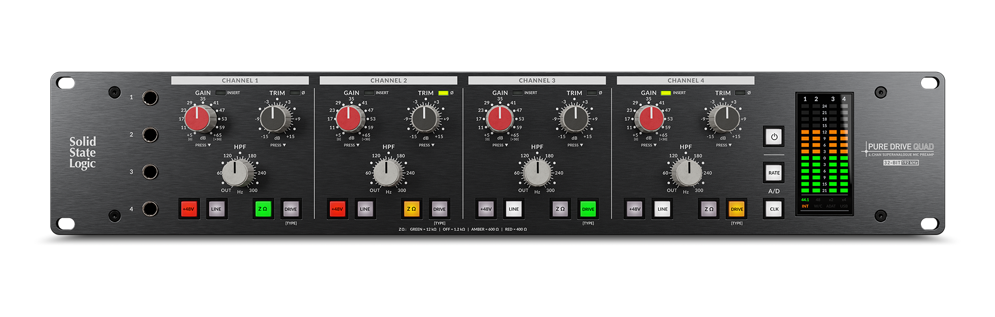 Preamplificateur PureDrive 4 Canaux avec USB-C et AES/EBU PURE DRIVE QUAD exploite la technologie renommée du préamplificateur microphonique SuperAnalogue PureDrive™, déjà présente dans la console ORIGIN de Solid State Logic, introduit un nouveau mode DRIVE et une nouvelle connectivité, et la rend disponible dans une unité rackmount 2U à 4 canaux. Le célèbre préamplificateur microphonique PureDrive™, introduit dans la plus récente console d'enregistrement de SSL, ORIGIN, est la base sur laquelle repose PURE DRIVE QUAD. Ce préamplificateur innovant préserve la clarté et la puissance typiques de SSL, tout en offrant la possibilité de moduler son timbre en un son chaud, riche en harmoniques et contrôlé, dont le caractère évolue avec l'augmentation du gain. La combinaison d'ORIGIN et du préamplificateur microphonique PureDrive™ est devenue un choix incontournable dans les studios d'enregistrement les plus prestigieux du monde. Que ce soit pour enregistrer les nuances les plus délicates d'un concert de piano en mode PURE ou pour ajouter de la chaleur à un enregistrement de batterie réglé sur DRIVE, le préamplificateur microphonique PureDrive™ est un compagnon essentiel grâce à sa flexibilité et à sa signature sonore exceptionnelle. PURE DRIVE QUAD poursuit sur cette lancée, offrant quatre préamplificateurs microphoniques avec les modes renommés PURE et DRIVE d'ORIGIN, mais va plus loin en introduisant une nouvelle option de DRIVE "Asymmetric", une connectivité numérique avancée et une interface USB intégrée. PURE DRIVE QUAD offre quatre options d'impédance différentes pour les entrées du préamplificateur microphonique, permettant aux ingénieurs du son d'explorer diverses nuances timbrales ou d'associer l'impédance du préamplificateur au microphone utilisé. De plus, chaque préamplificateur microphonique est équipé d'une alimentation fantôme +48V indépendante, d'une inversion de polarité et d'un filtre passe-haut réglable. Avec ces caractéristiques, PURE DRIVE QUAD émerge comme l'un des préamplificateurs microphoniques externes les plus avancés et polyvalents disponibles, ouvrant la voie à de nouvelles possibilités sonores et flux de travail pour les producteurs et ingénieurs du son les plus exigeants. Trois nuances sonores, un PREPURE DRIVE QUAD est la preuve tangible de l'engagement de SSL dans la conception de circuits analogiques à la pointe de la technologie. Dans le parcours du signal de PURE DRIVE QUAD, il n'y a pas recours à des composants électromécaniques tels que des potentiomètres, des interrupteurs mécaniques ou des relais, augmentant ainsi la durabilité du produit et garantissant une correspondance impeccable entre tous les canaux, pas seulement entre les paires stéréo. L'utilisation de circuits analogiques contrôlés numériquement, gérés via des potentiomètres et des interrupteurs électroniques, simplifie considérablement le rappel des réglages et améliore leur précision. Chacun des préamplificateurs microphoniques de PURE DRIVE QUAD peut être commuté indépendamment entre trois modes DRIVE différents : Clean, Classic Drive et Asymmetric Drive. Le mode Clean présente le préamplificateur linéaire SSL renommé avec un niveau de bruit de fond extrêmement bas, connu pour sa capacité à capturer fidèlement le son source avec une clarté exceptionnelle. Le mode Classic Drive est le mode symétrique qui génère principalement des harmoniques impaires, offrant le son connu sur la console ORIGIN. Le mode Asymmetric Drive présente une nouvelle option de coloration spécialement conçue pour la gamme PURE DRIVE, qui accentue les harmoniques paires, conférant plus d'épaisseur, de couleur et de douceur aux transitoires. Connectivité avancée La connectivité avancée de PURE DRIVE QUAD ouvre de nombreuses possibilités d'enregistrement. La sélection complète d'entrées/sorties analogiques et numériques offre des préamplificateurs microphoniques d'une qualité et d'une flexibilité exceptionnelles, que ce soit pour enregistrer un groupe dans un studio professionnel ou pour ajouter de la chaleur à des pistes audio dans un contexte de production. Il est idéal pour les projets de studio mais aussi dans des situations extérieures, où la qualité ne peut être compromise, grâce à la carte audio USB intégrée. PURE DRIVE QUAD est équipé de quatre entrées XLR combo à l'arrière, de quatre entrées Hi-Z/DI pour instruments sur le panneau avant avec détection automatique des entrées et de trois séries de connecteurs D-sub pour les entrées de ligne, ainsi que d'envois et retours pour les inserts. Les retours d'inserts/ADC du PURE DRIVE QUAD fonctionnent jusqu'à un niveau de ligne de +24 dBu, permettant une intégration parfaite avec d'autres appareils professionnels. La polyvalence de la connectivité numérique de PURE DRIVE QUAD comprend une carte audio USB intégrée qui offre quatre canaux audio à la DAW jusqu'à 32 bits/192 kHz. De plus, il y a deux paires de sorties AES/EBU et des sorties ADAT, qui fournissent quatre canaux à 24 bits/48 kHz. En alternative, il est possible de connecter deux unités PURE DRIVE QUAD en cascade via la connexion pratique ADAT LINK IN, permettant d'accéder à un maximum de huit canaux. Les sorties AES et ADAT peuvent également être réajustées individuellement pour être alimentées par la carte audio USB intégrée et utilisées comme sorties de la DAW. Enfin, il y a une entrée et une sortie word clock auto-régulante pour un horloge numérique fiable. Spécifications : • 4 préamplificateurs microphoniques haute performance PureDrive™ à 4 canaux • Alimentation fantôme +48V, inversion de polarité et filtre passe-haut réglable • Contrôle Gain à pas jusqu'à +65 dB de gain • Contrôle Trim à 31 pas, avec des incréments précis de 1 dB - saturez le signal avec le contrôle Gain puis réduisez-le à un niveau adéquat en utilis