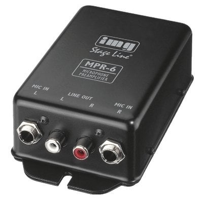 STAGE LINE MPR-6 est un préamplificateur pour microphone, qui permet de connecter jusqu'à 2 microphones à l'entrée ligne d'un système hi-fi, d'un amplificateur ou d'une table de mixage. Il peut fonctionner en mode stéréo ou dual mono. La bande passante est de 5Hz-40kHz, avec une sensibilité d'entrée de 2mV/1V de sortie, une impédance d'entrée de 10kΩ, une tension de sortie de 3,2VMAX/47kΩ, un gain de 53dB, un rapport S/N de 63dB avec un facteur de distorsion de 0,05%. STAGE LINE MPR-6 est équipé de 2 entrées Jack de 6,3mm, 2 sorties RCA, alimentation avec Jack 3,5mm. Les dimensions sont de 67x37x121mm et le poids de 215g.