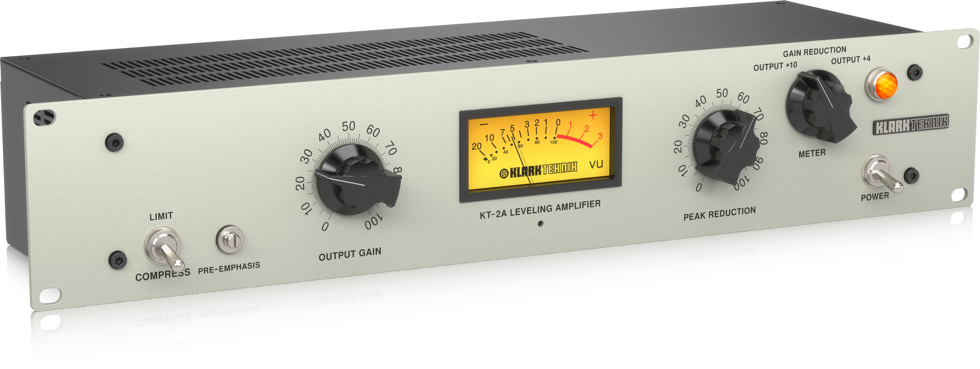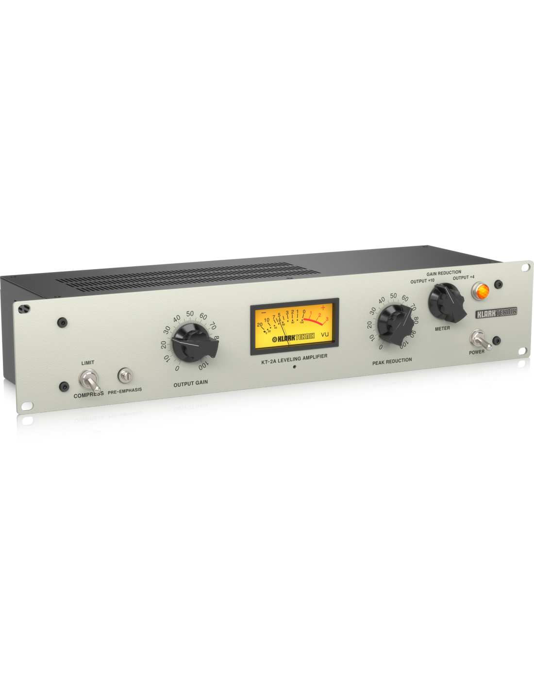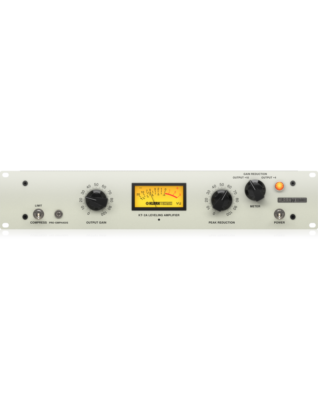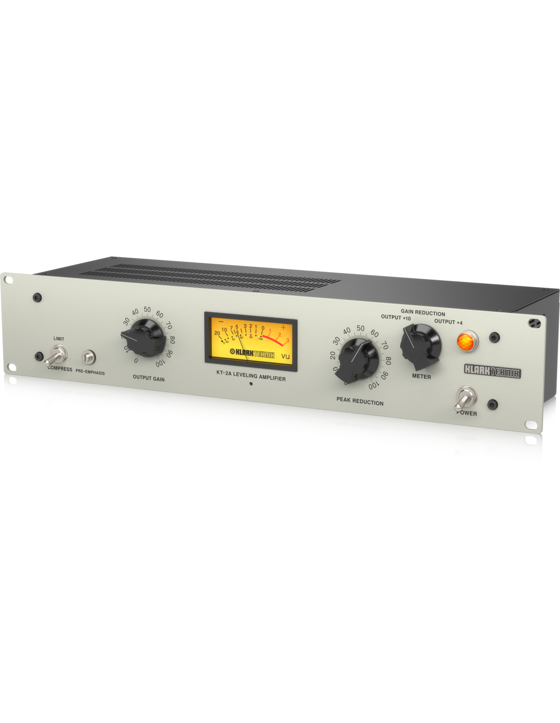 KLARK TEKNIK KT-2A est un compresseur/limiteur à lampes pour une utilisation en studio avec un chemin de signal discret et des dimensions Rack 2U. Les caractéristiques techniques incluent un atténuateur optique No-Lag de style vintage, des lampes premium 12AX7, 12BH7 et EL84 sélectionnées à la main avec un nivellement à lampes modelé sur l'iconique Teletronix LA-2A, des transformateurs d'entrée et de sortie MIDAS Custom, une connexion stereo-link sur jack 6,3mm réglable, un mètre de style vintage avec réduction de gain et sortie, des commandes rotatives pour le gain de sortie, la réduction de crête et la réduction de gain, un interrupteur de sélection de mode Limite/Compresse. Il présente des connexions équilibrées en entrée via XLR-F et Jack 6,3mm TRS, sortie sur XLR-M et Jack 6,3mm TRS.