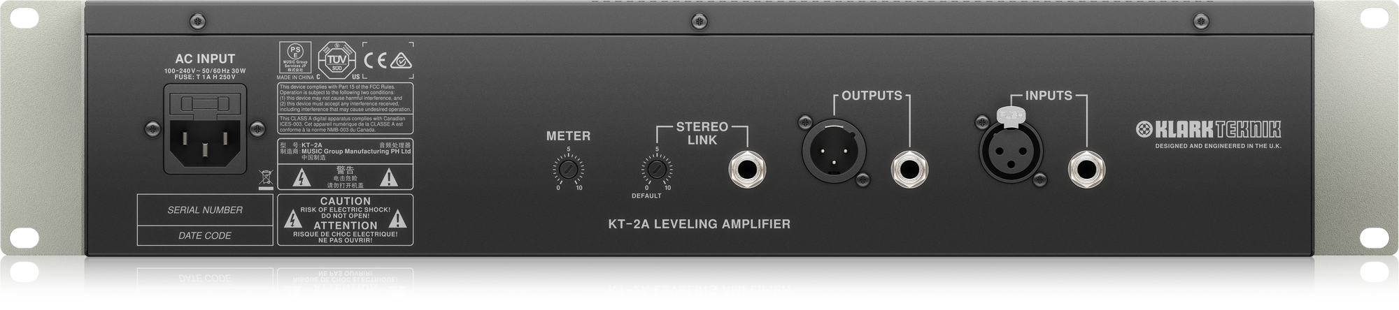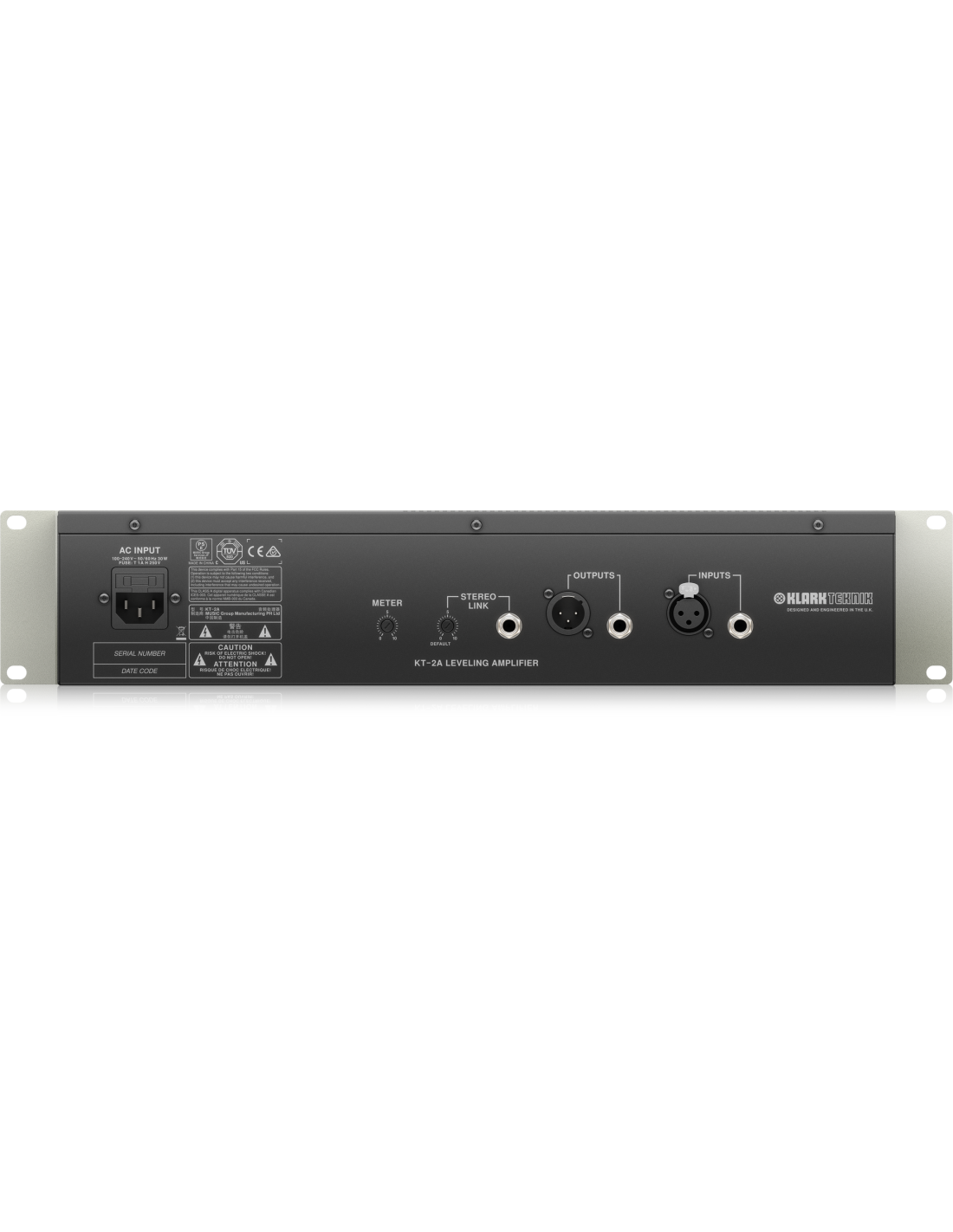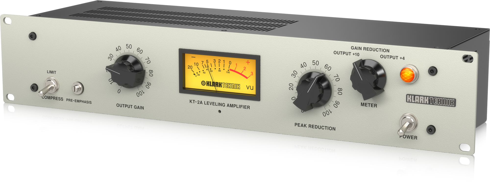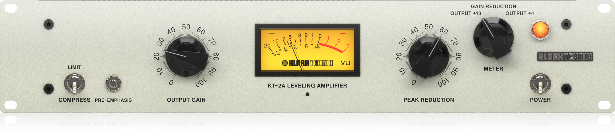 KLARK TEKNIK KT-2A est un compresseur/limiteur à lampes pour une utilisation en studio avec un chemin de signal discret et des dimensions Rack 2U. Les caractéristiques techniques incluent un atténuateur optique No-Lag de style vintage, des lampes premium 12AX7, 12BH7 et EL84 sélectionnées à la main avec un nivellement à lampes modelé sur l'iconique Teletronix LA-2A, des transformateurs d'entrée et de sortie MIDAS Custom, une connexion stereo-link sur jack 6,3mm réglable, un mètre de style vintage avec réduction de gain et sortie, des commandes rotatives pour le gain de sortie, la réduction de crête et la réduction de gain, un interrupteur de sélection de mode Limite/Compresse. Il présente des connexions équilibrées en entrée via XLR-F et Jack 6,3mm TRS, sortie sur XLR-M et Jack 6,3mm TRS.