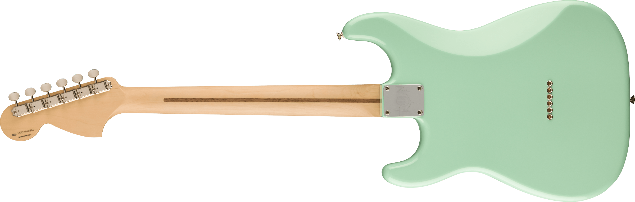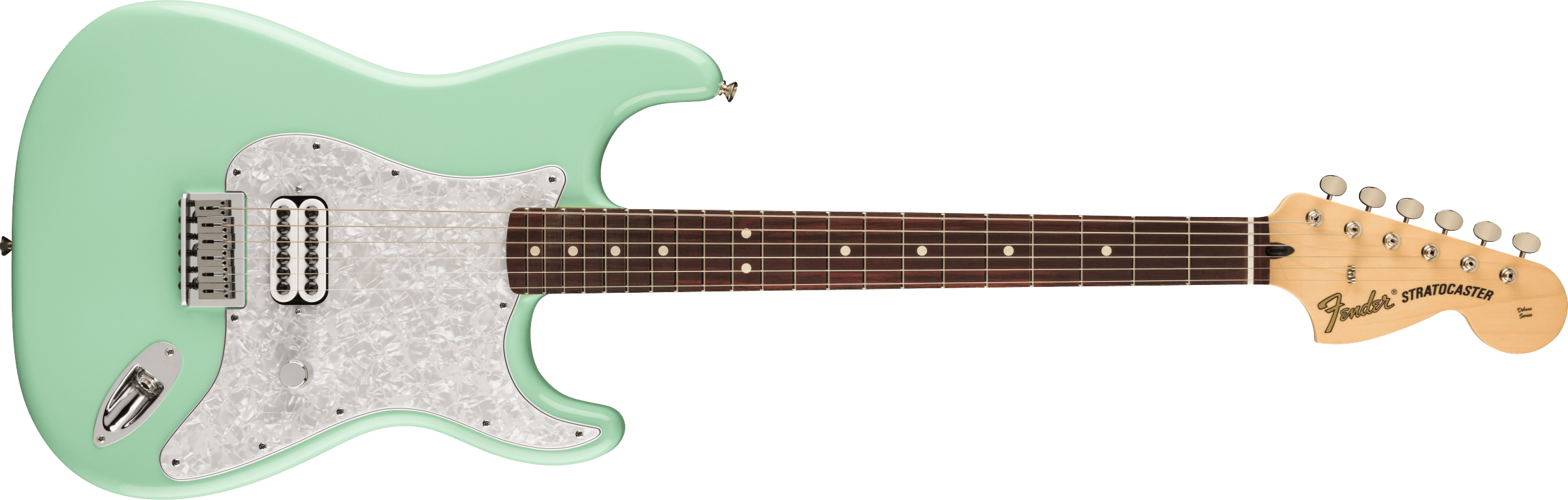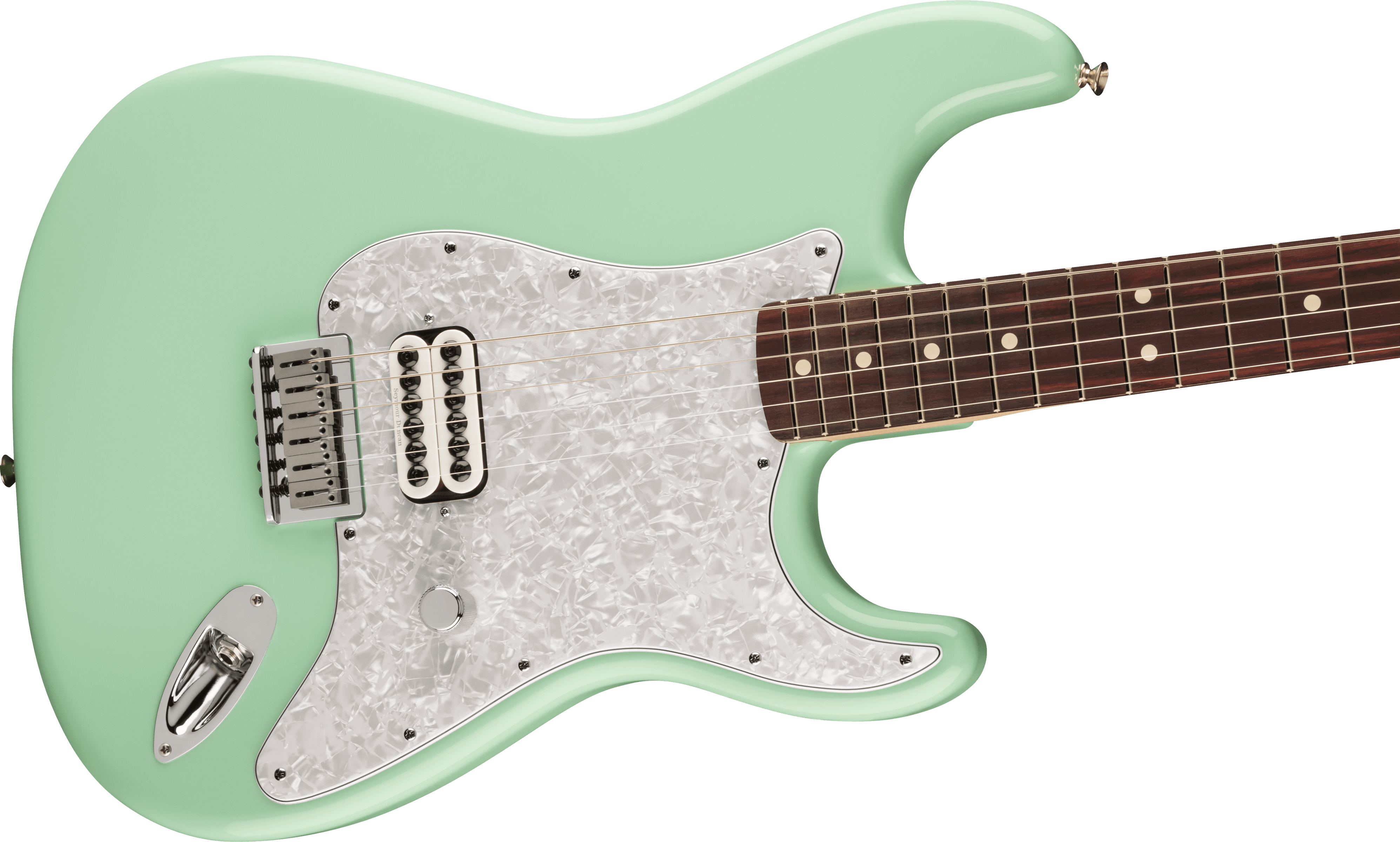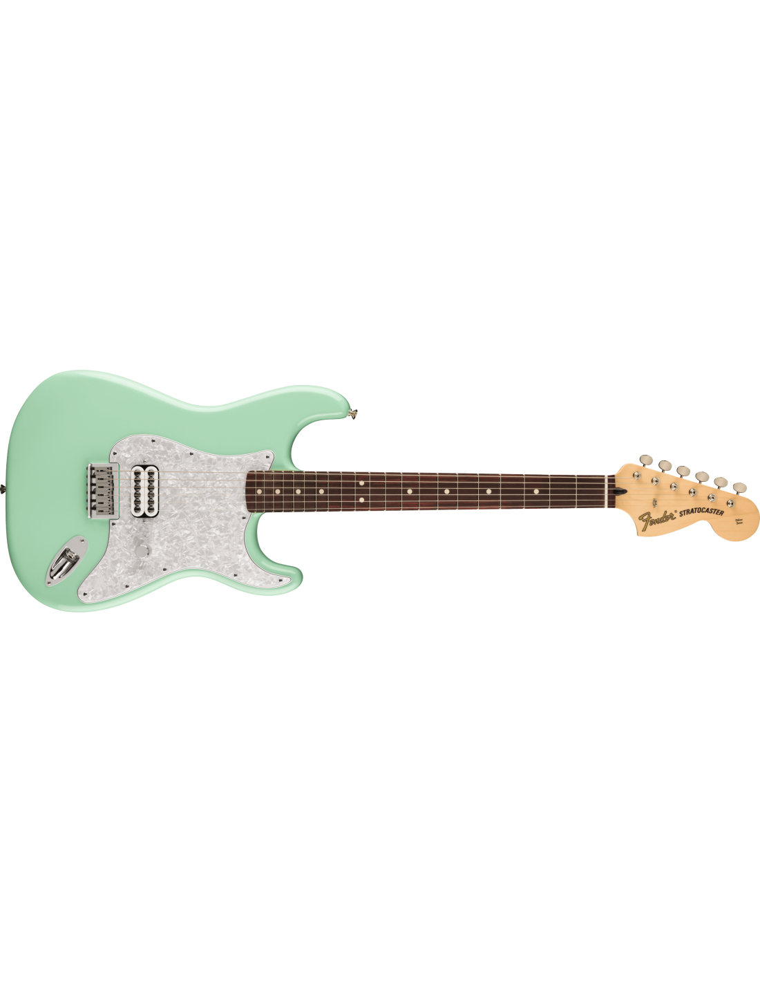 Guitare Électrique Fender Stratocaster Tom Delonge, édition limitée, couleur Surf Green. La Fender Stratocaster Tom Delonge est une guitare électrique à 6 cordes qui renferme les caractéristiques souhaitées par Tom Delonge des Blink-182. Elle présente un manche en Érable avec profil en C, échelle 25 1/2”, avec un touche en Palissandre, 21 frettes Medium Jumbo. Le corps est en Tilleul, avec un pickguard White Pearloid à 4 couches. La partie électronique comprend un micro Humbucking Seymour Duncan Invader SH-8 avec contrôle de Volume et Treble-Bleed. Matériel Nickel/Chrome. Pont fixe à 6 saddles en Acier moulé. Mécaniques Fender de style Vintage. Deluxe Gig-Bag inclus.